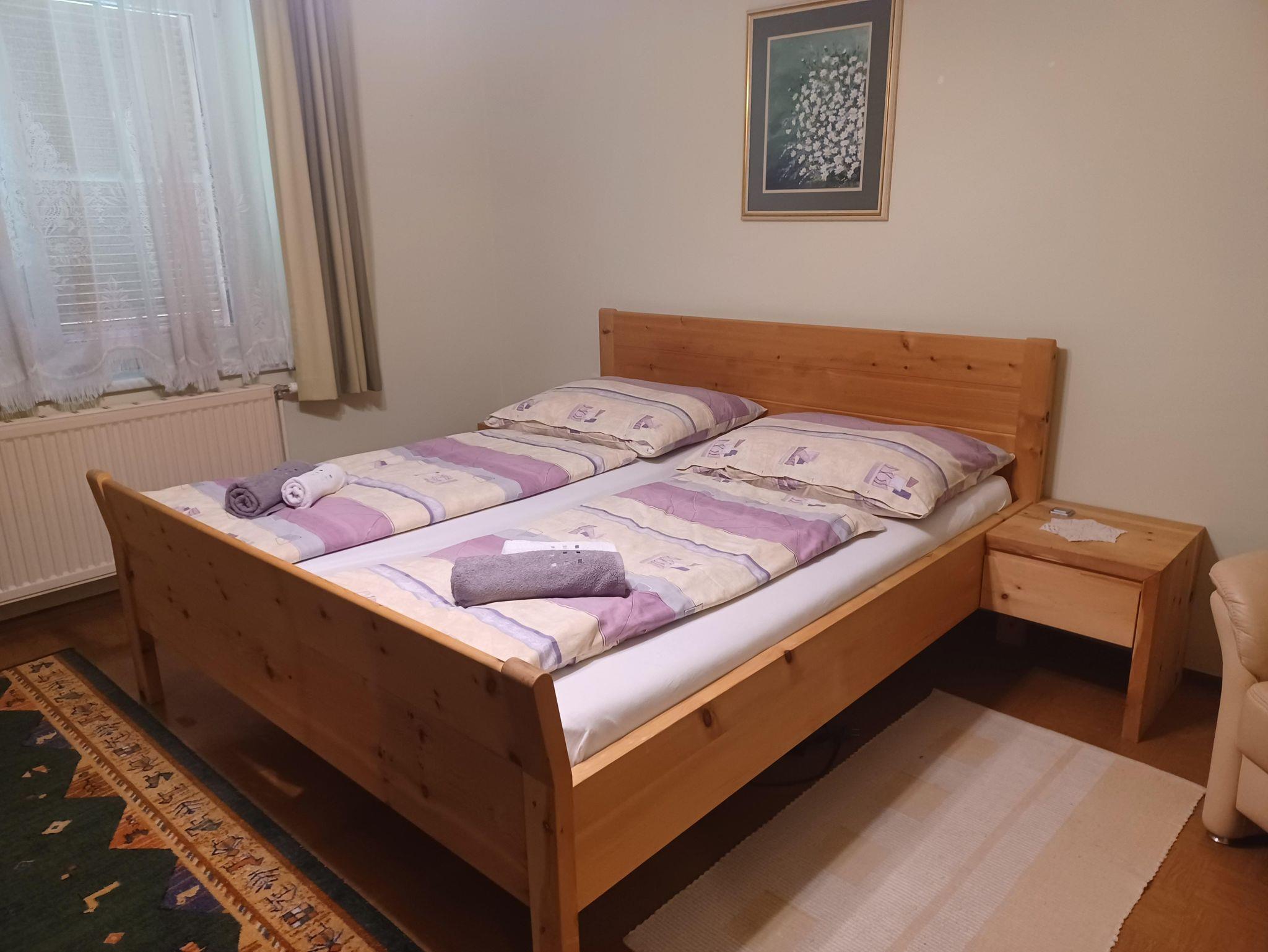 Das Appartement im OG verfügt über eine kleine Küche mit einem Essbereich, einem Schlafzimmer mit Doppelbett, einem Sanitärbereich mit Dusche und WC.