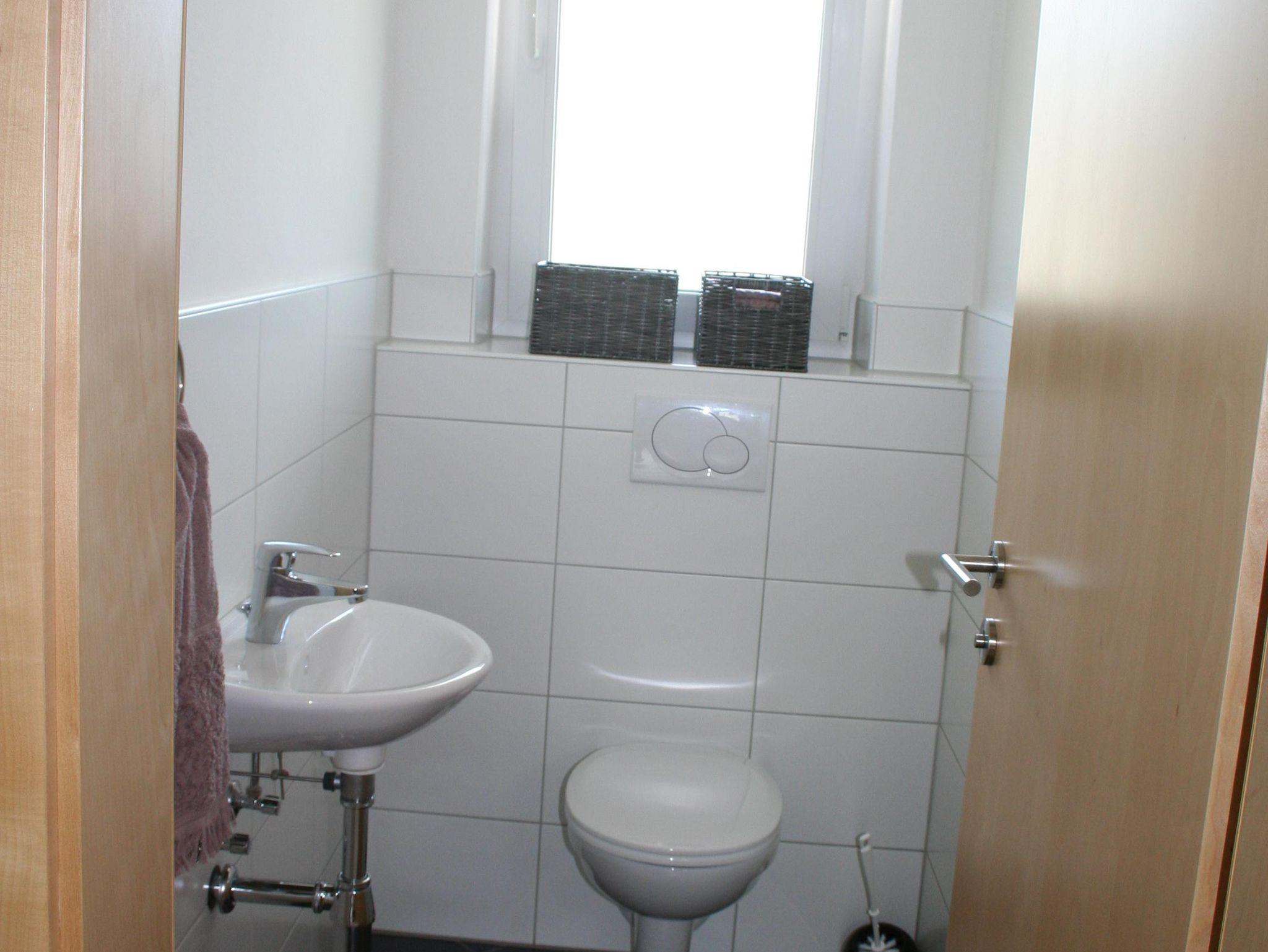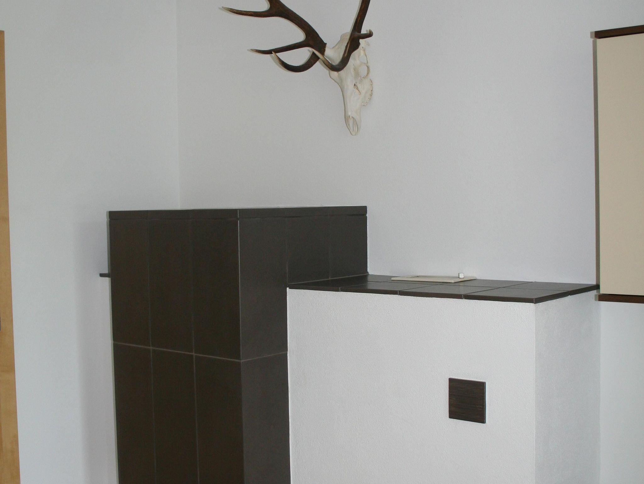Wohnzimmer mit Kachelofen, Badezimmer, WC, Küche mit Esstisch.