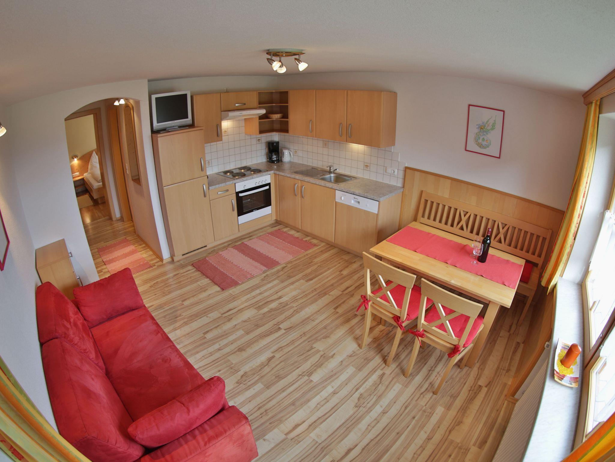 gemütliche Wohnküche mit E-Herd, Backrohr, Kühlschrank, Geschirrspüler, 1 Schlafzimmer(Dreibettzimmer),Safe, Dusche/WC, Föhn, SAT-TV, Ausziehsofa in der Wohnküche für 1-2 Personen, Balkon, 45m2