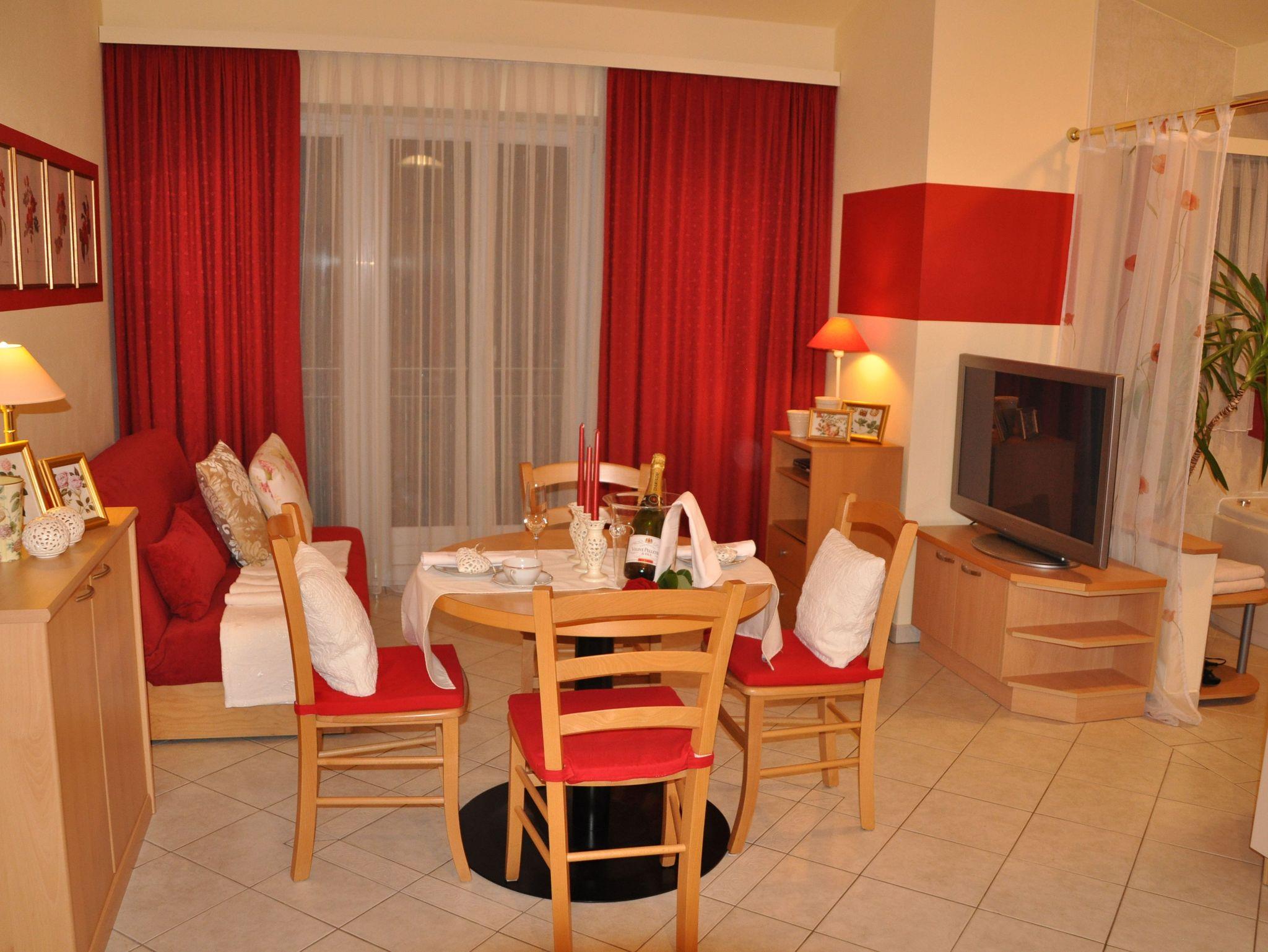 • 1 Wohn-Schlafzimmer mit einem bequemen Doppelbett sowie eine kleine, komplett ausgestattete Küchenzeile, Esstisch, großer Flat -TV mit über 100 Sendern.