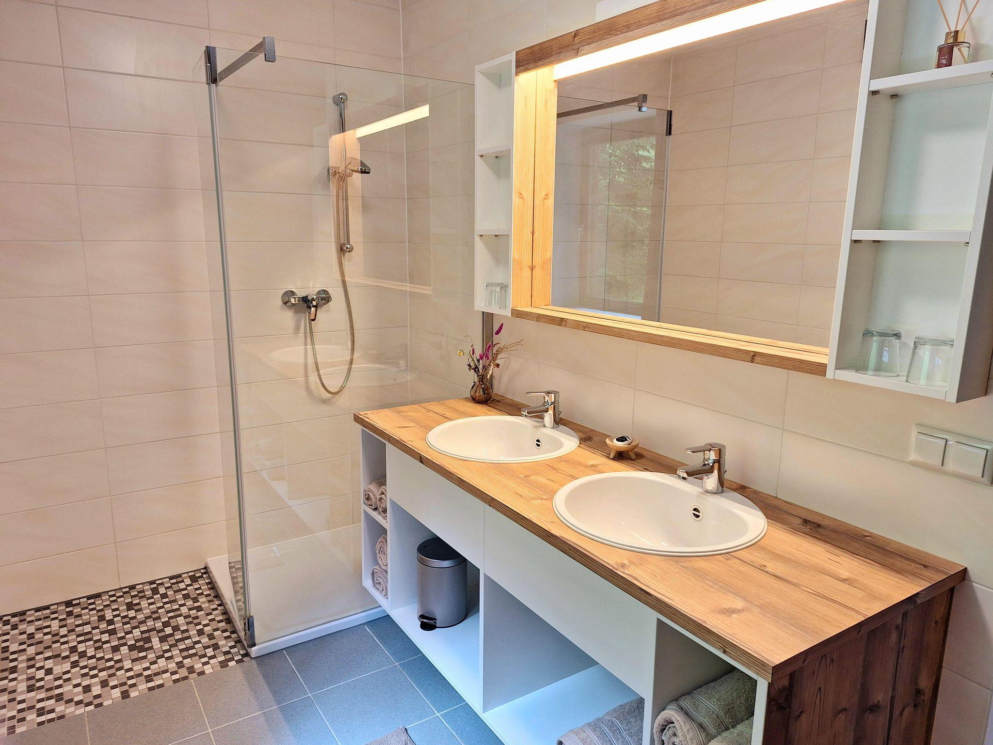 Der Einrichtungsstil ist eher traditionell, sowie funktionell und mit modernen Elementen kombiniert. Die Küche ist neuwertig, beinhaltet E-Geräte und ist mit Geschirr ausgestattet. Ebenso wurde das Bad renoviert und erstrahlt nun in einem freundlichen Design. Neben einer großen Dusche, verfügt das Bad auch über einen modernen Waschtisch mit großem Spiegel und zwei Waschbecken.