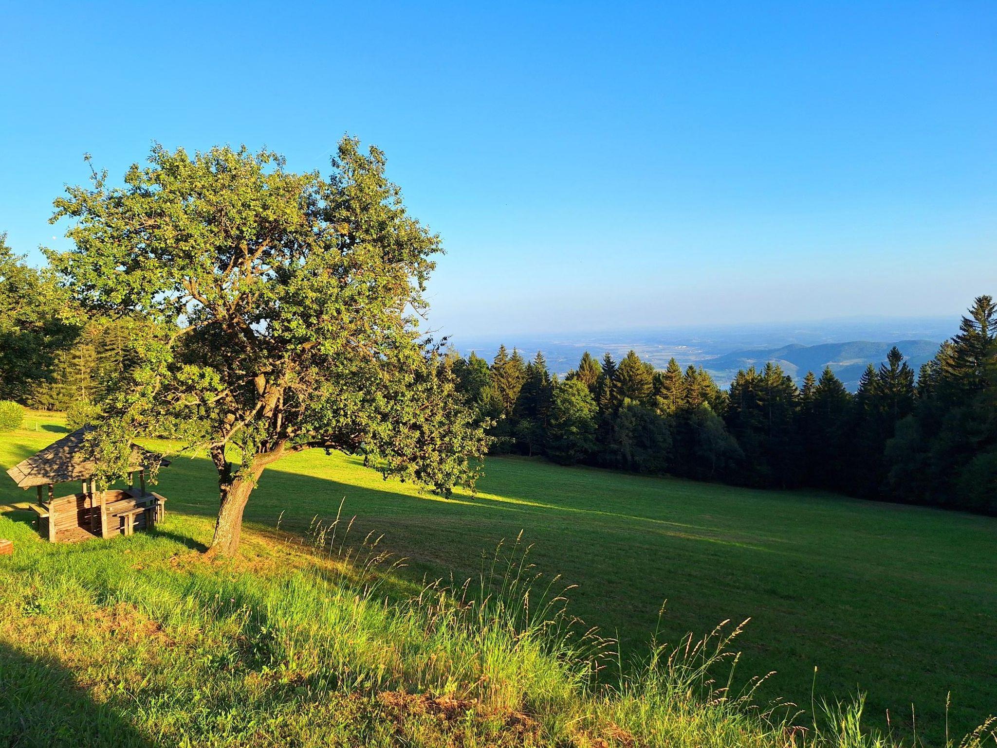 Die Panoramahütte bietet nicht nur innen, sondern auch draußen einen atemberaubenden Anblick. Egal, ob ihr auf der Terrasse, dem Balkon oder durch die Fenster blickt, überall erstrecken sich endlose Obst- und Weinberge, grüne Wiesen und duftende Wälder. Bei klarem Wetter reicht der Blick sogar bis zur Riegersburg und nach Ungarn!