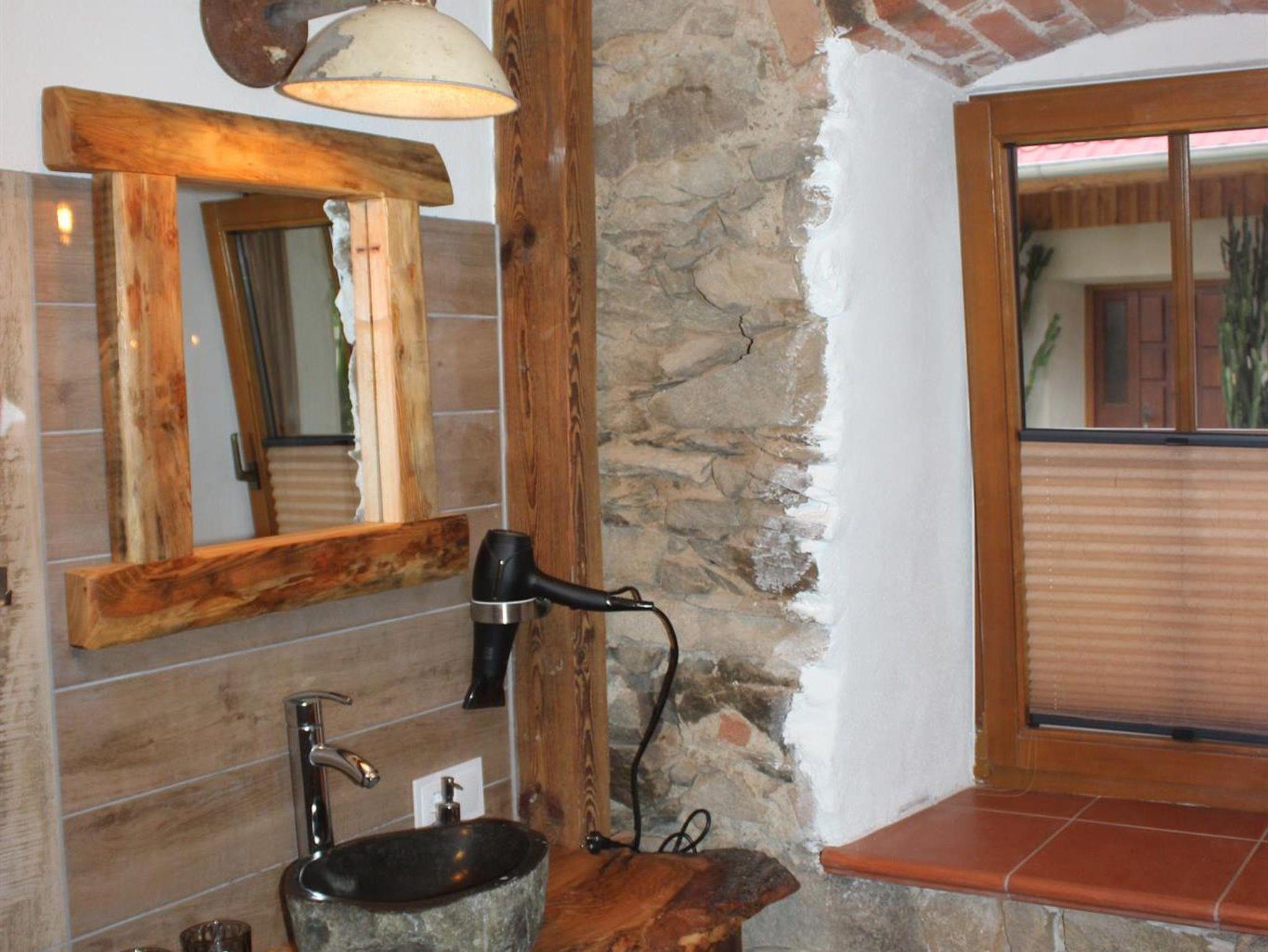 Großzügiges, gemütliches Zimmer mit Kingsize (2m x 2m) Unikatbett (welches von uns aus altem Dachstuhlholz gefertigt wurde), riesiger offener und ebener Regenfalldusche und sehr geräumiger 33m² privater Terrasse.