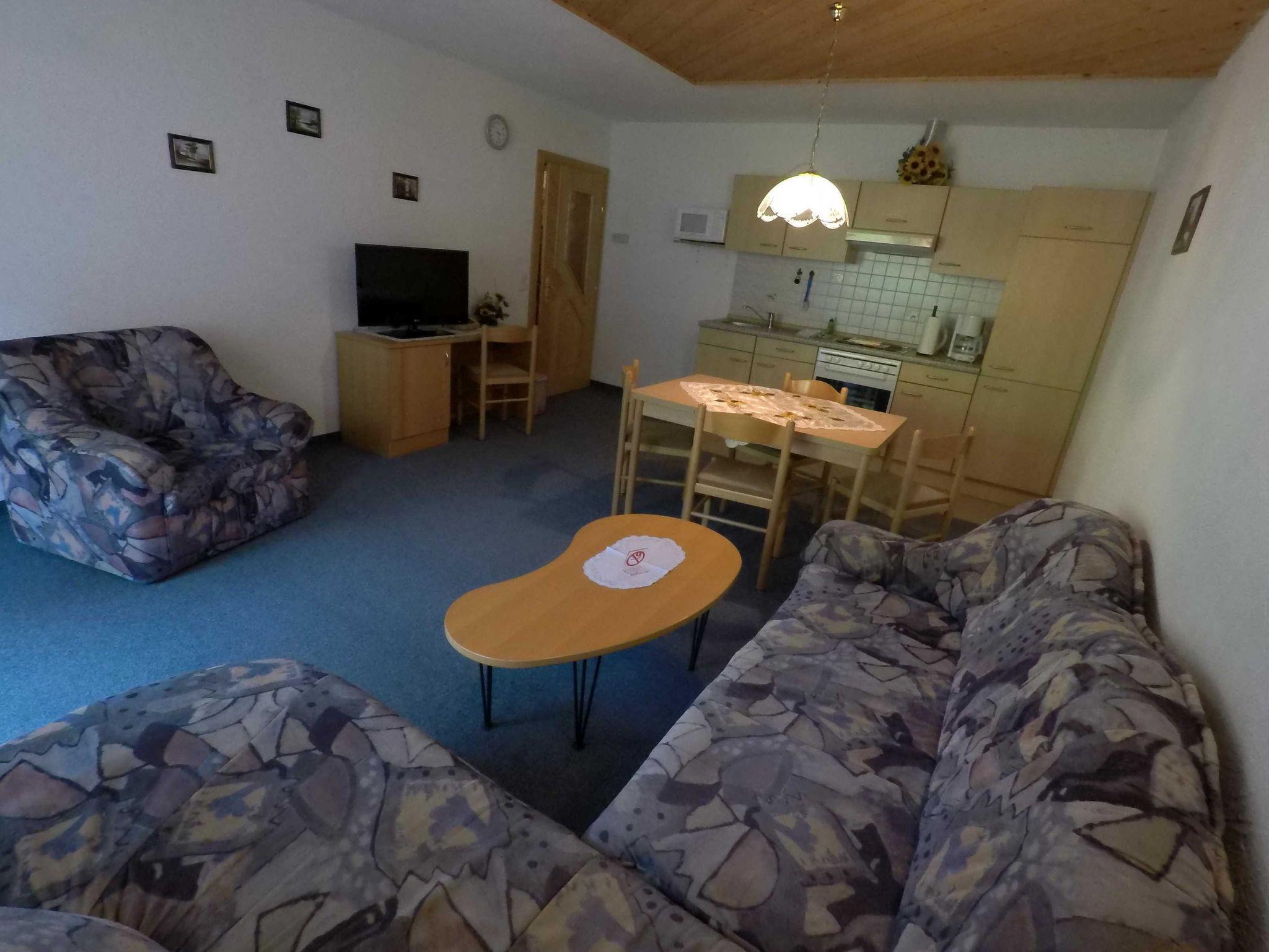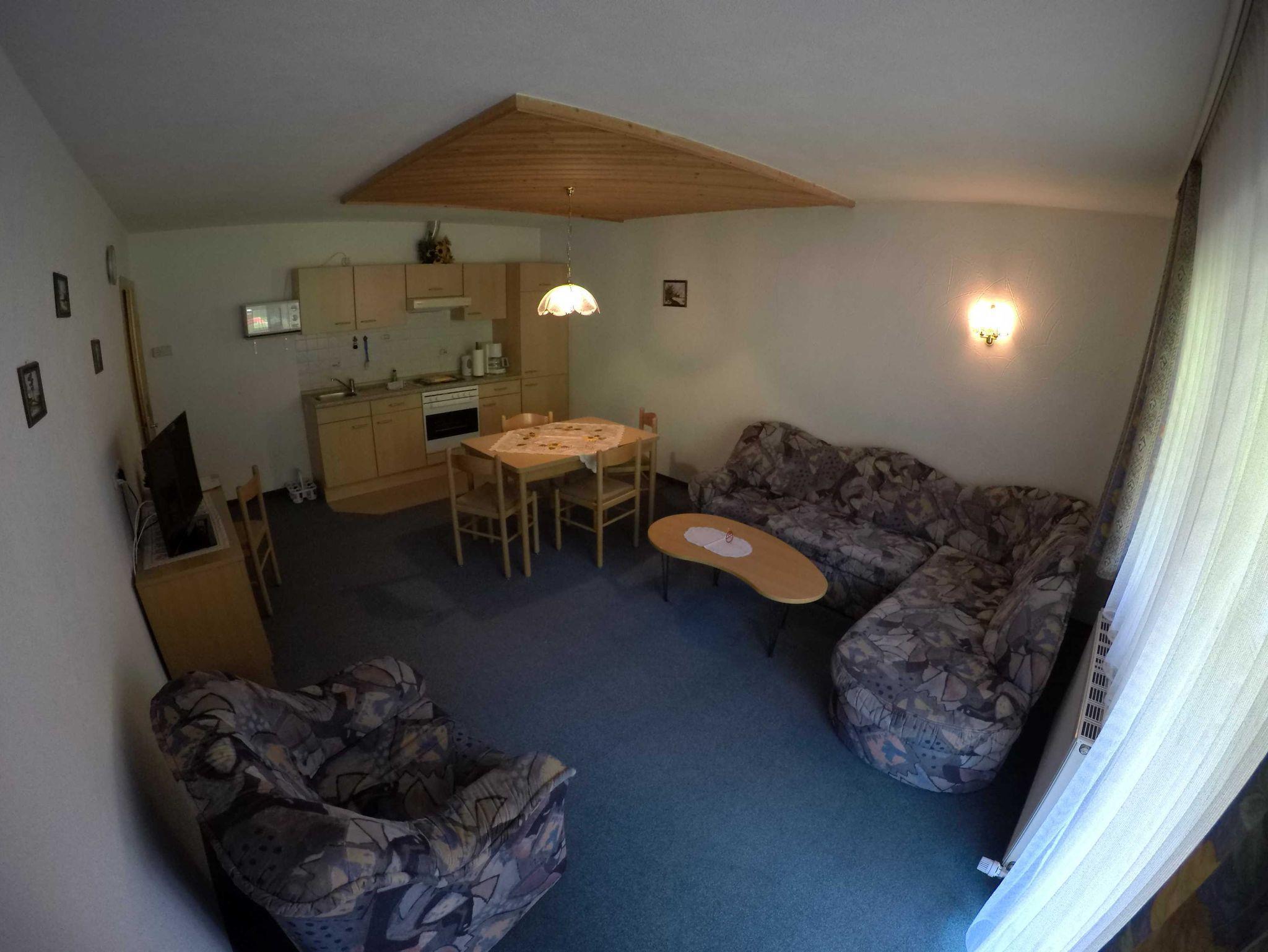 In der Wohnküche befindet sich eine gemütliche Sitzecke sowie eine Couch und ein Flachbildfernseher mit SAT-TV.