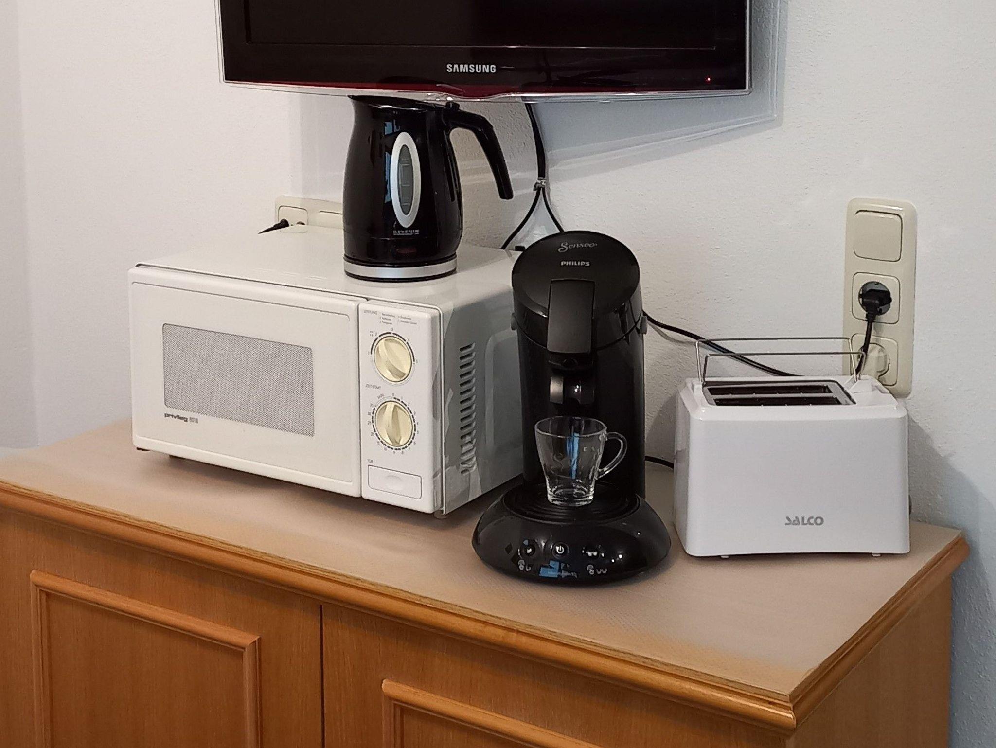 Wohnschlafraum (Sofa, Sitzbank, Tisch, Doppelbett und Schränke), Bad und Kochecke, ein Schlafzimmer extra mit Doppelbett.