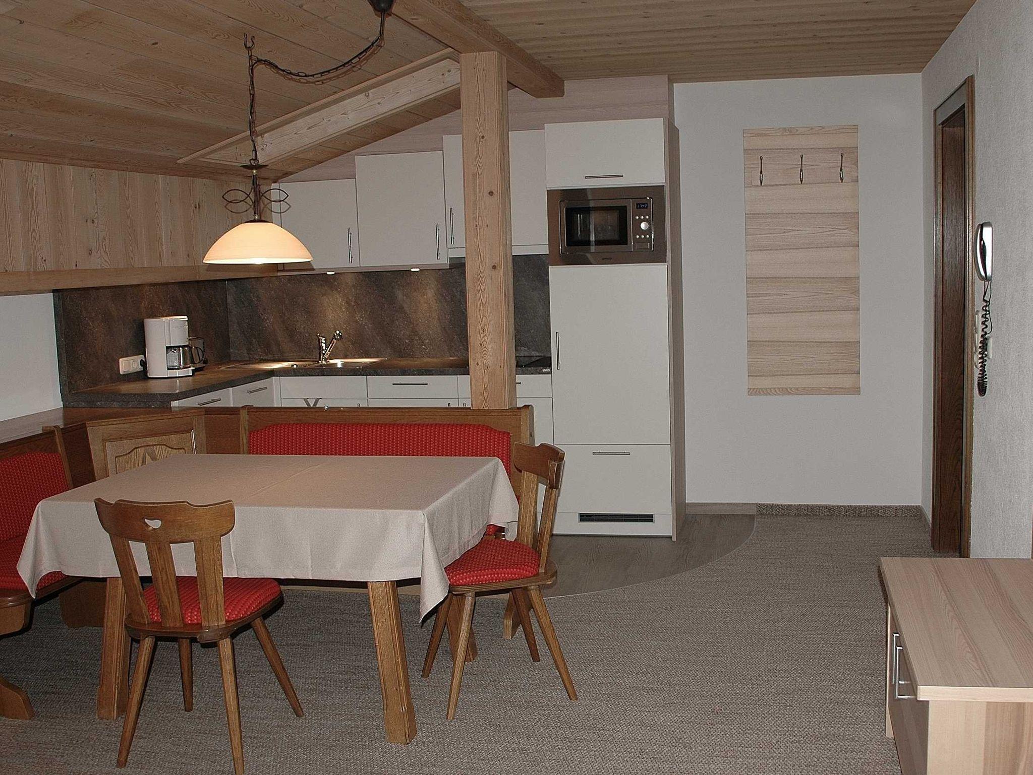 Appartement ( ca. 50 m²) im 2. Stock mit kleiner Süd-Loggia und Blick über unsere gepflegte Gartenanlage zum Neunerköpfle und in Richtung Vilsalpsee. Großer Wohnraum mit Couch und Essecke, Küche, Vorraum, Doppelbett-Schlafzimmer, Bad/WC, TV/Radio, Telefon.