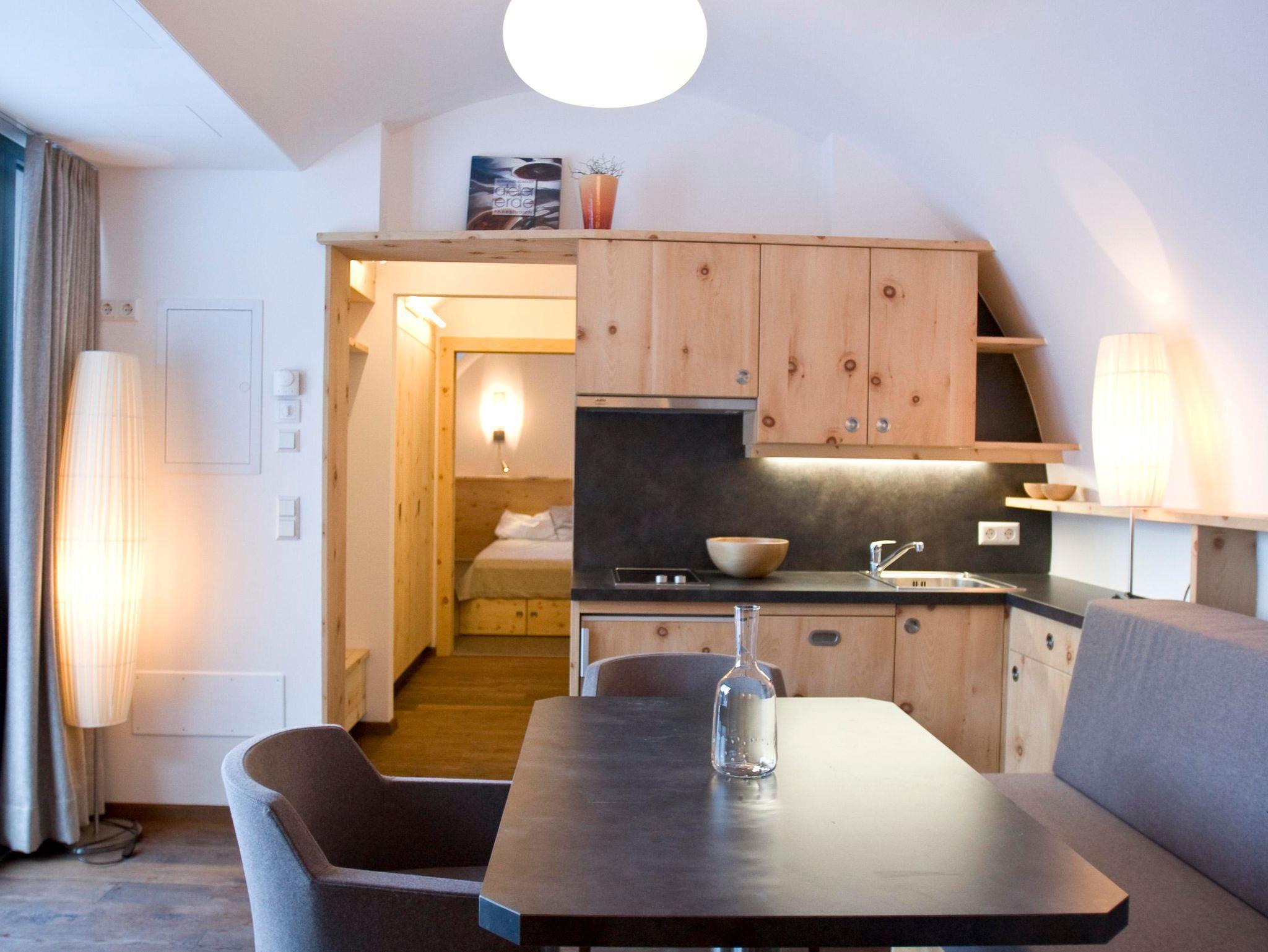 Der Innenraum mit den hohen Gewölbedecken und den liebevoll, mit Zirbenholz errichteten Staumöglichkeiten bietet ein unvergessliches Wohngefühl für junge und jung gebliebene Gäste.