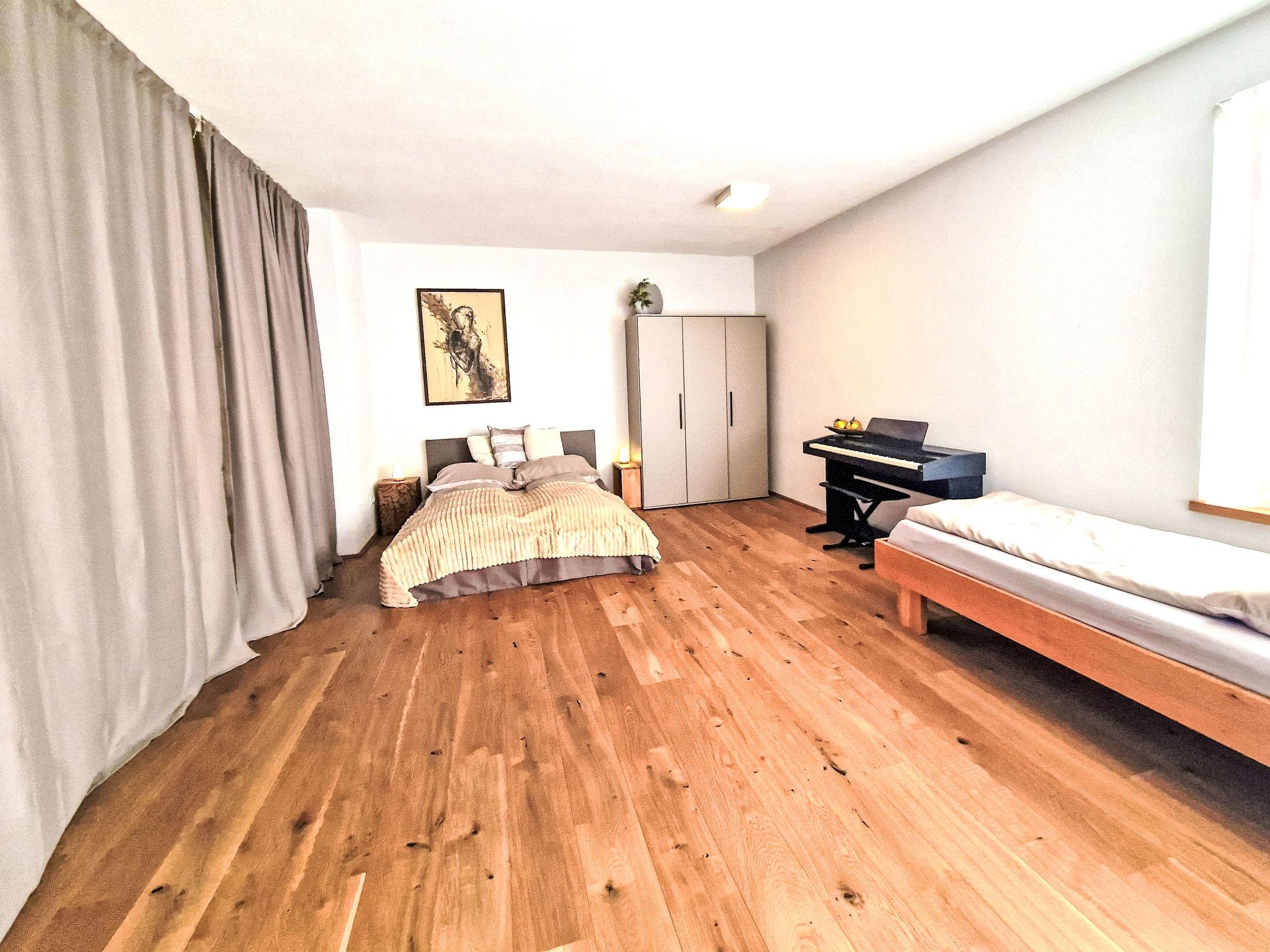 "The Rock Design", 2-room apartment 100 m2, on the ground floor. Comfortable and tasteful furnishings: 1 room with 2 beds and 1 double bed. Large kitchen-/living room (dishwasher, 2 ceramic glass hob hotplates, toaster, kettle, microwave, electric coffee machine) with dining table, 1 sofabed and TV (flat screen). Shower/WC. Underfloor heating. Terrace. Terrace furniture. Side view of the mountains. Facilities: Internet (WiFi, free). Parking (roofed). Please note: non-smokers only.