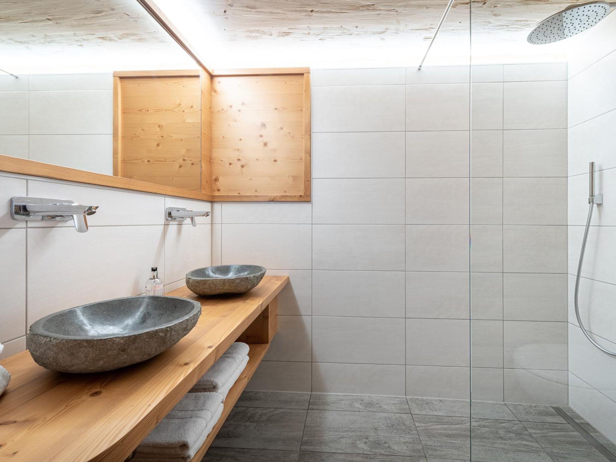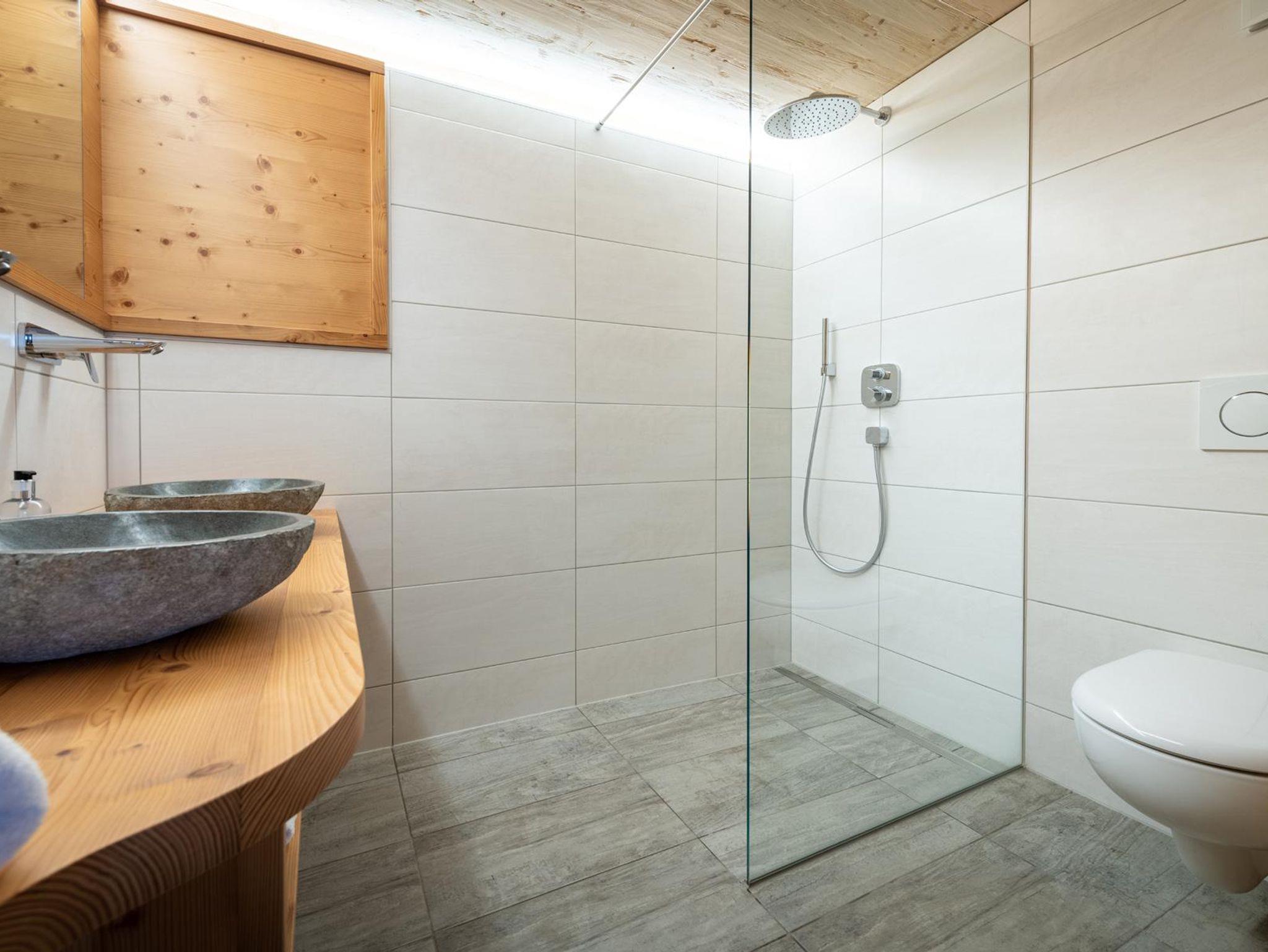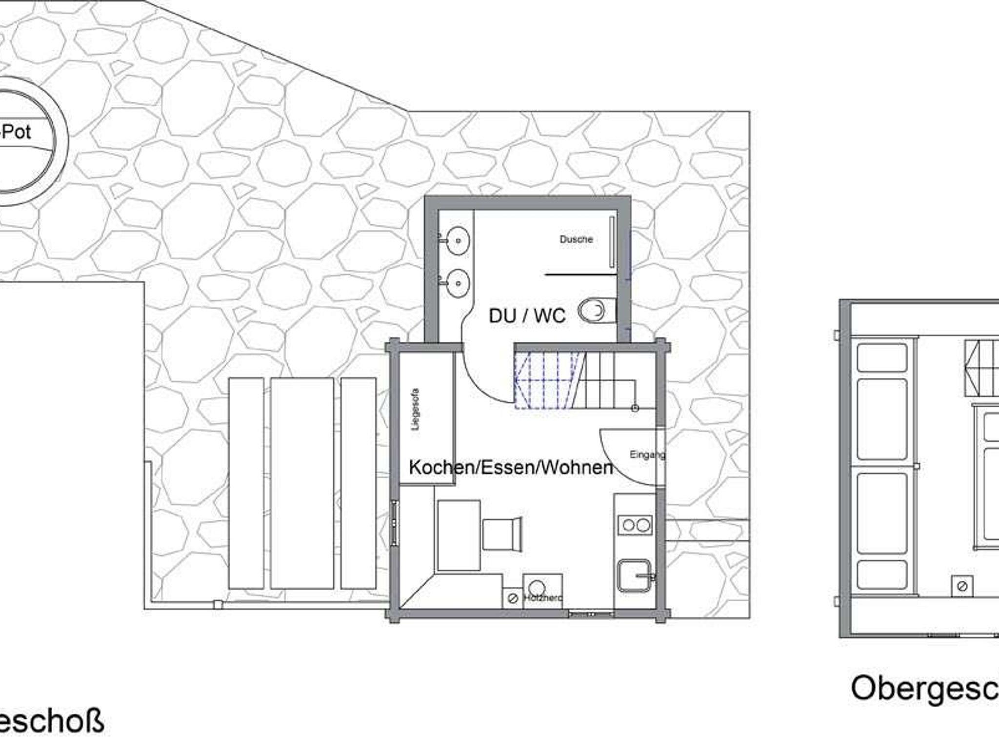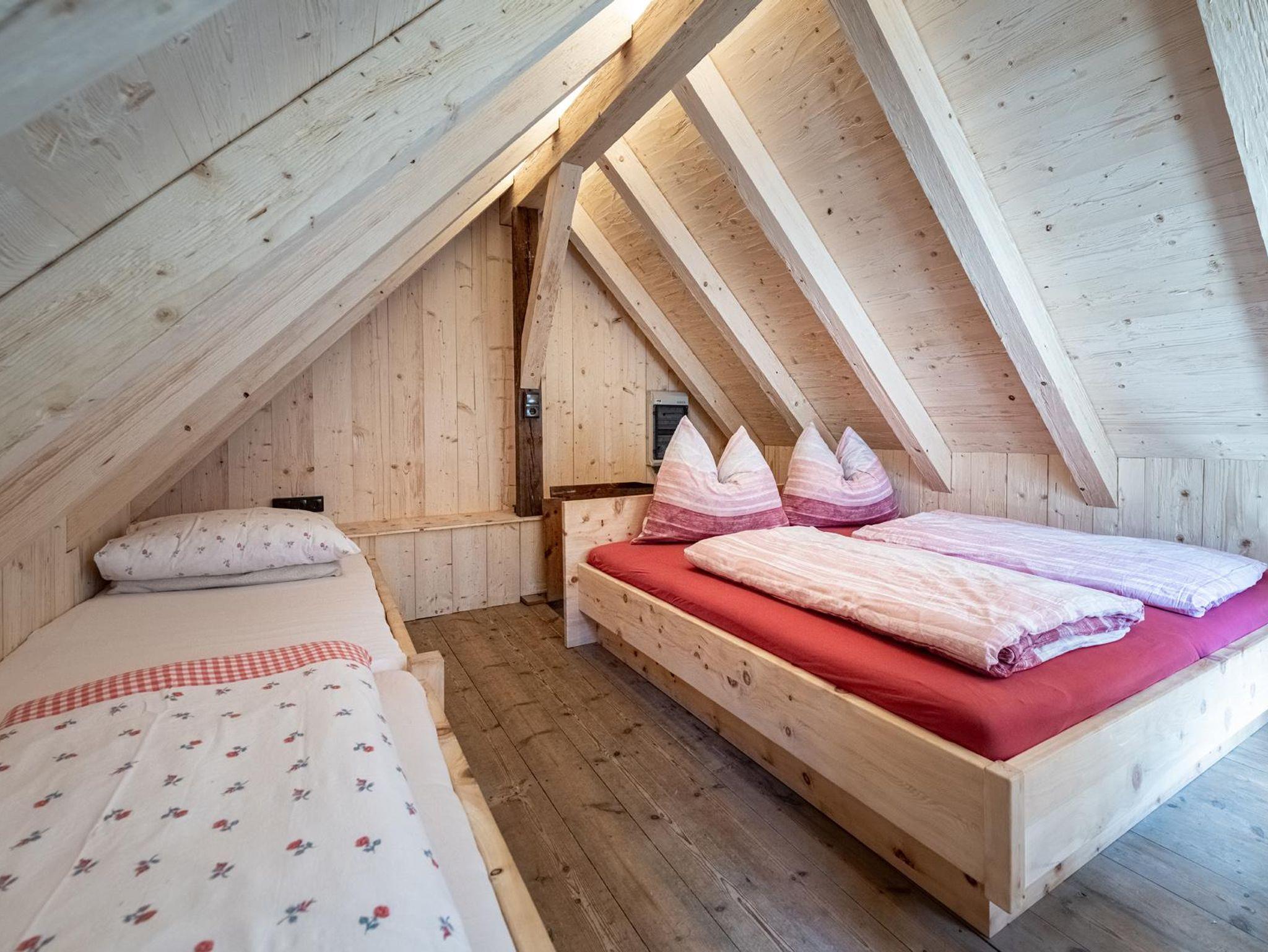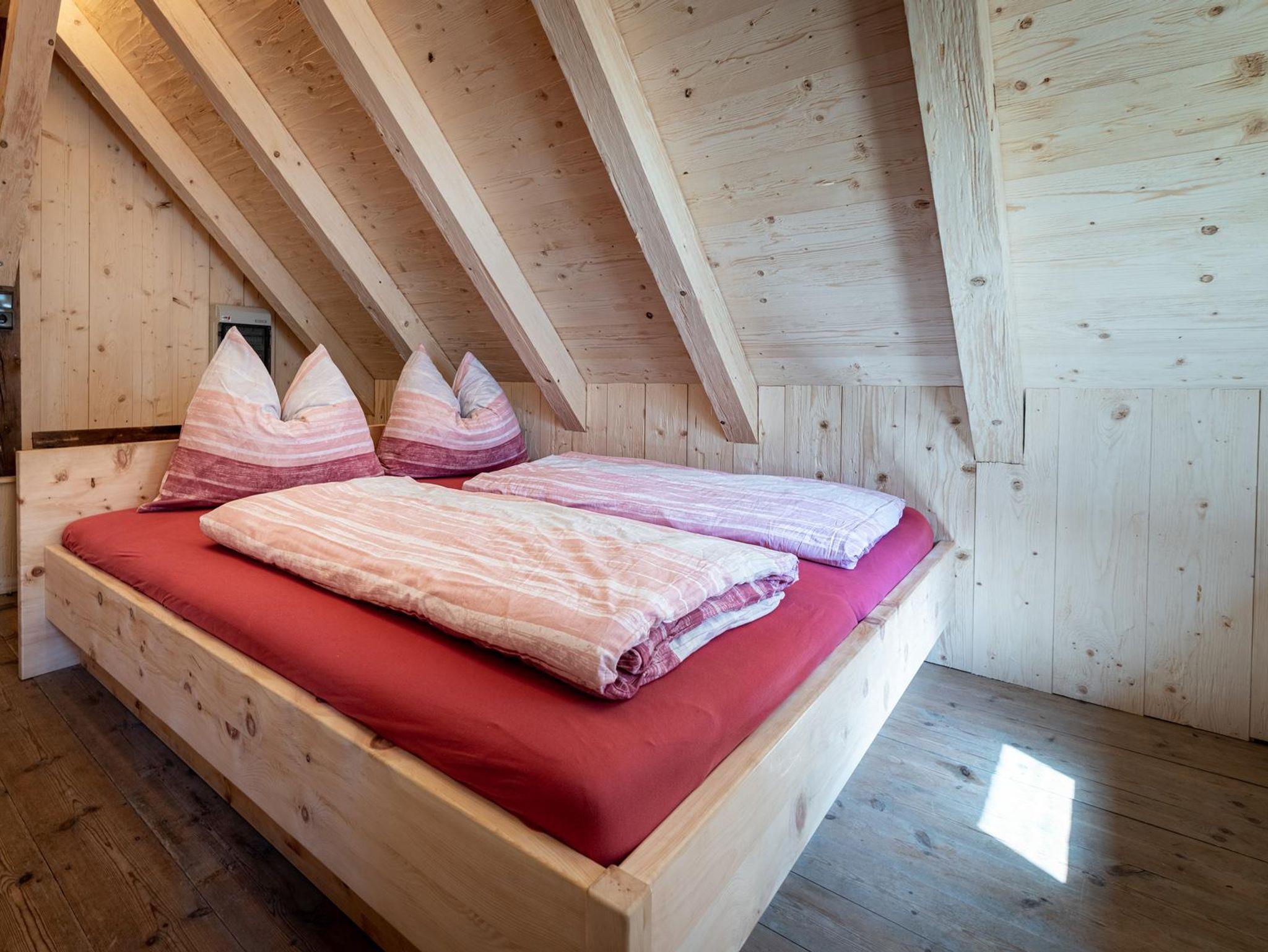 Über eine Holztreppe gelangt man unter das Dach der Hütte, wo man eine putzige Schlafkammer für bis zu 4 Personen vorfindet. Es gibt ein kuscheliges Doppelbett und zwei Einzelbetten, die wunderbar nach Zirbenholz duften und einen angenehmen Schlaf bereiten. Im Erdgeschoss befindet sich noch ein weiteres Zusatzbett. Im Mai 2020 wurde der gesamte untere Bereich mit einer Bodenheizung nachgerüstet. Es wurde ein Badezimmer mit WC und Dusche für etwas mehr Komfort zugebaut und zusätzlich wurde die Terrasse erweitert.