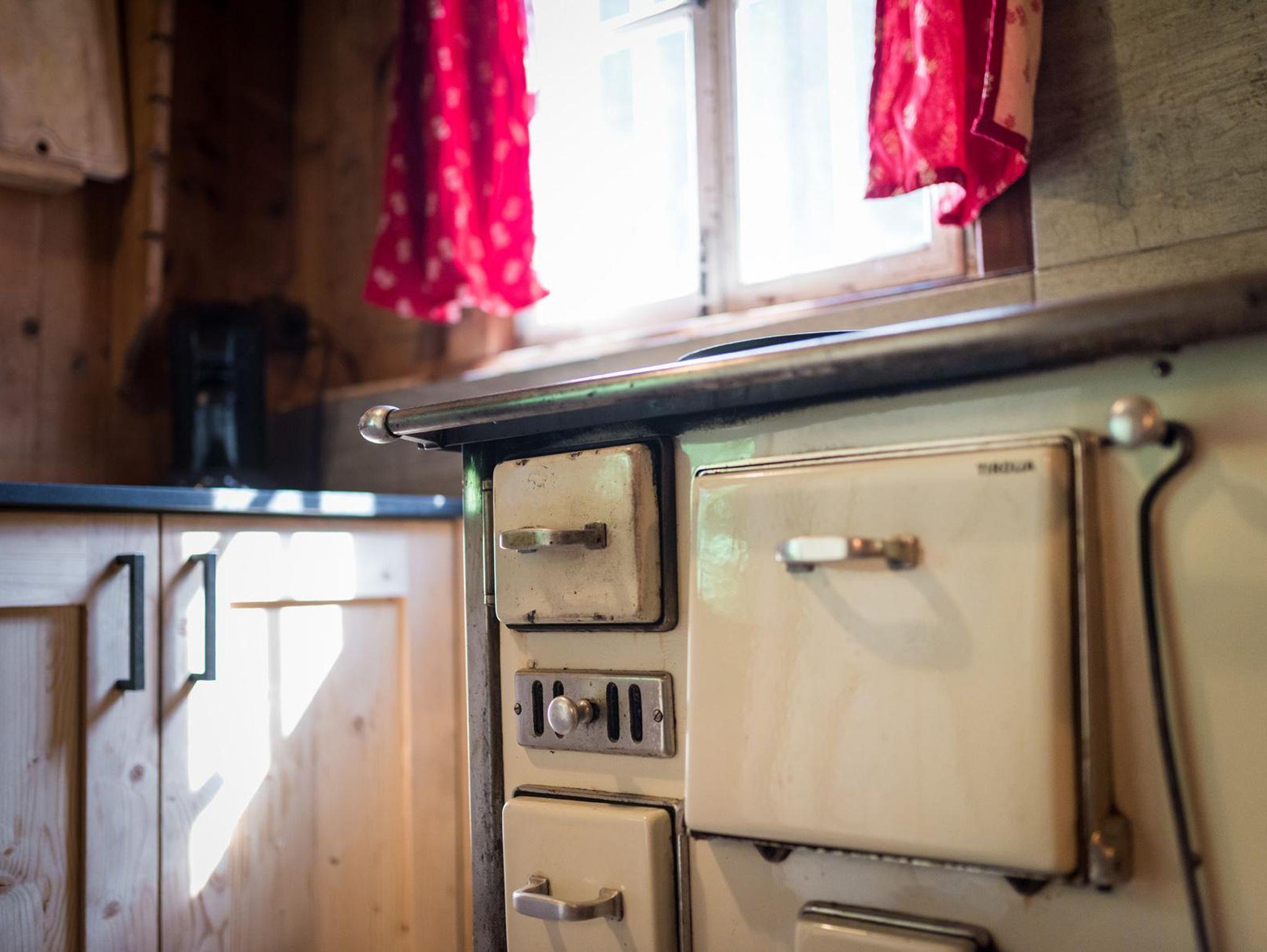 Kleine Küche mit 2 Kochplatten und traditionellem Holzherd