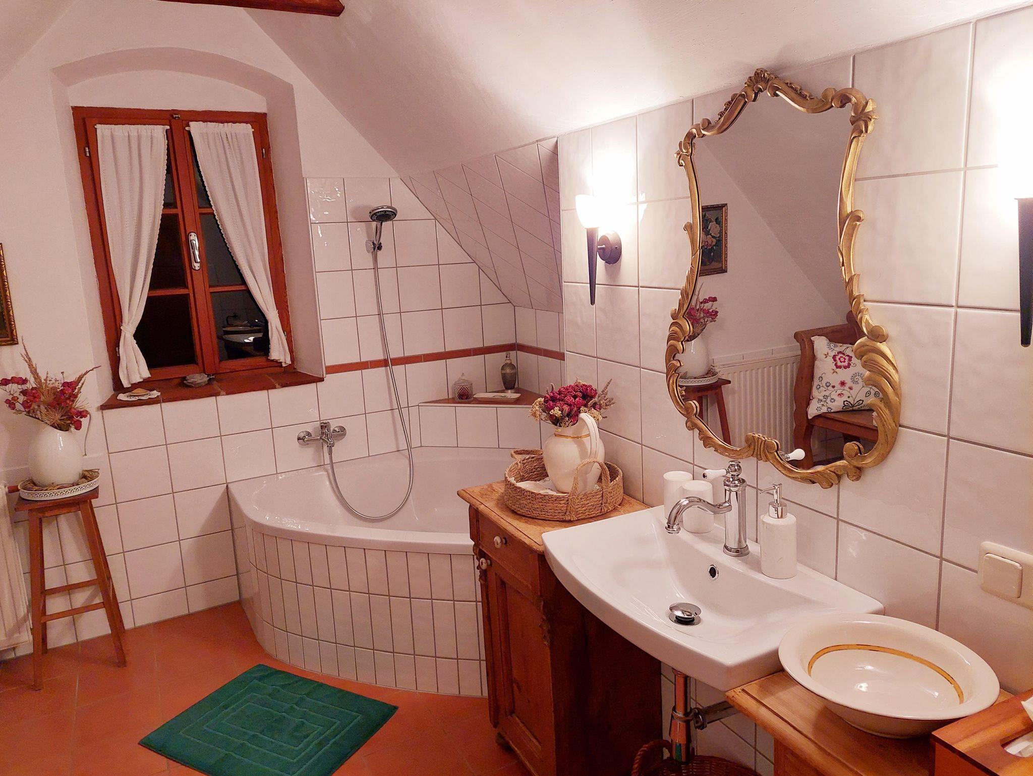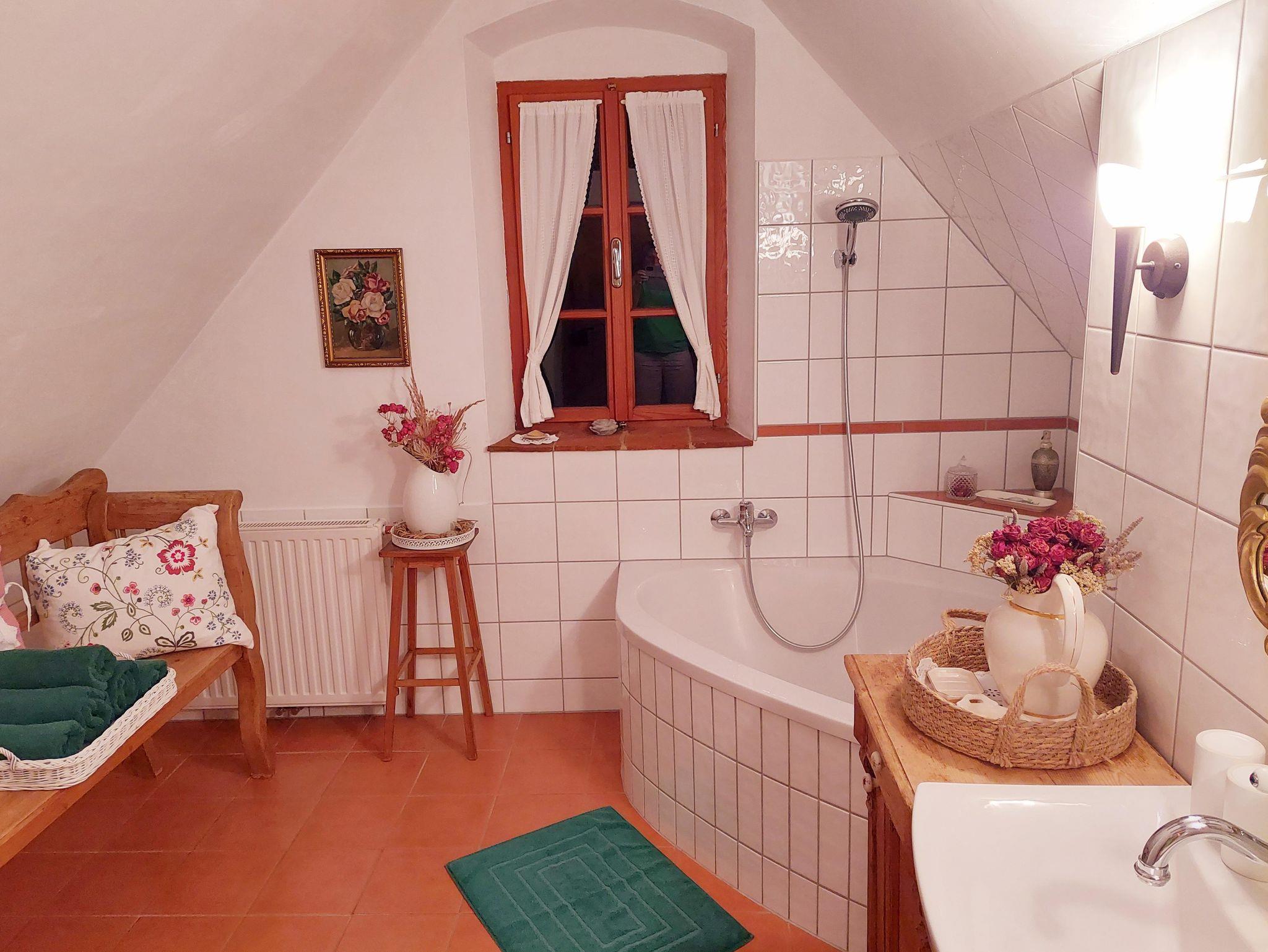 Revitalisiertes Kellerstöckl für einen Urlaub zu Zweit: Rund 98 Quadratmeter Wohnfläche auf vier Etagen. Gemütliche Stube mit Lehmziegelboden, vollausgestattete Küche mit Holzofen, romantisches Himmelbett, heimelige Galerie, großzügiges Badezimmer mit Eckbadewanne und WC, ruhige und schattige Terrassen uvm.