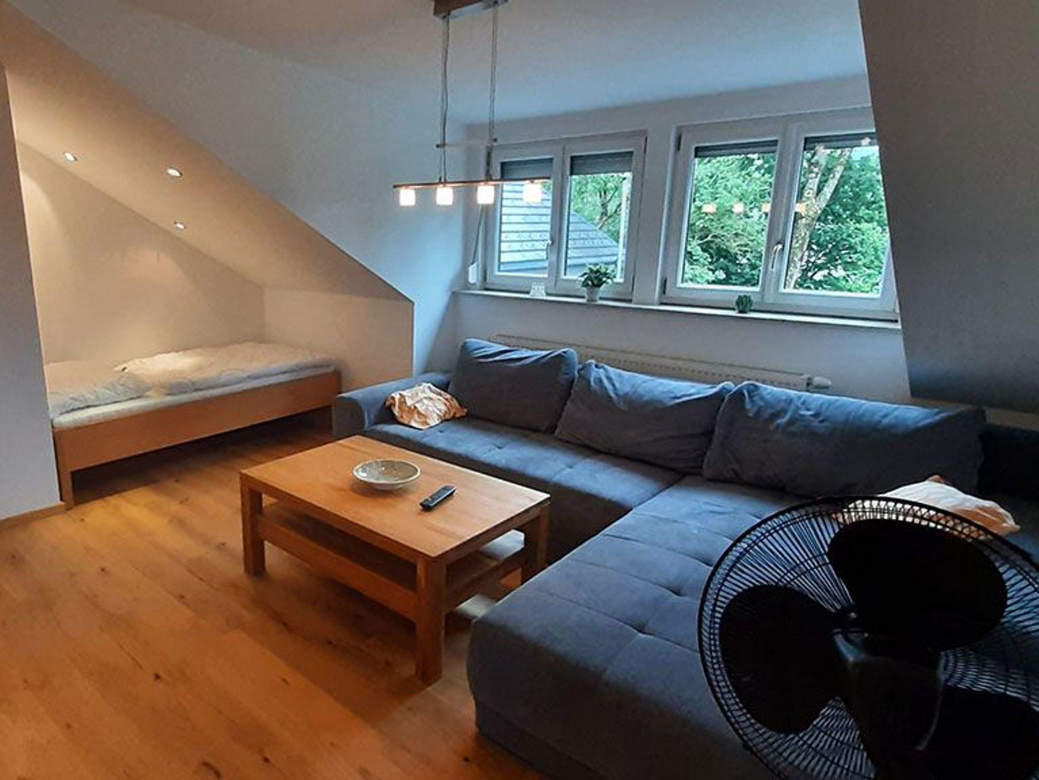 Vollwertig eingerichtete Ferienwohnung mit 90m2 südlich ausgerichtet und 400 Meter vom Strandbad Irssee entfernt, vom Schlafzimmer, Esstisch und Balkon hat man einen schönen Blick zum See, eigener Eingang zum 1. Stock, Badezimmer mit Dusche und Badewanne, bis zu 3 Schlafräume und Abstellraum