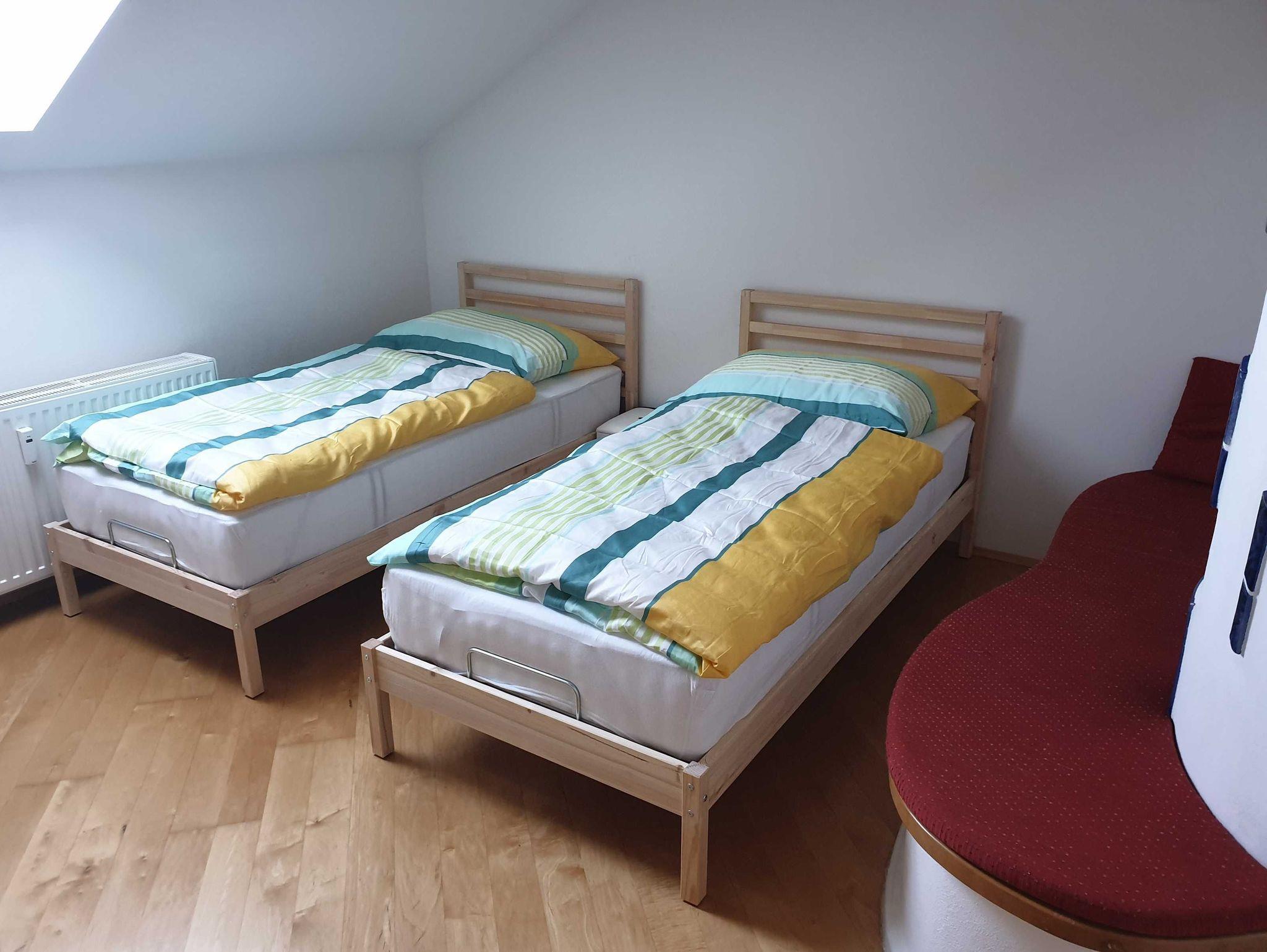 • ein Schlafzimmer mit zwei Einzelbetten und einem Kinder/Gitterbett