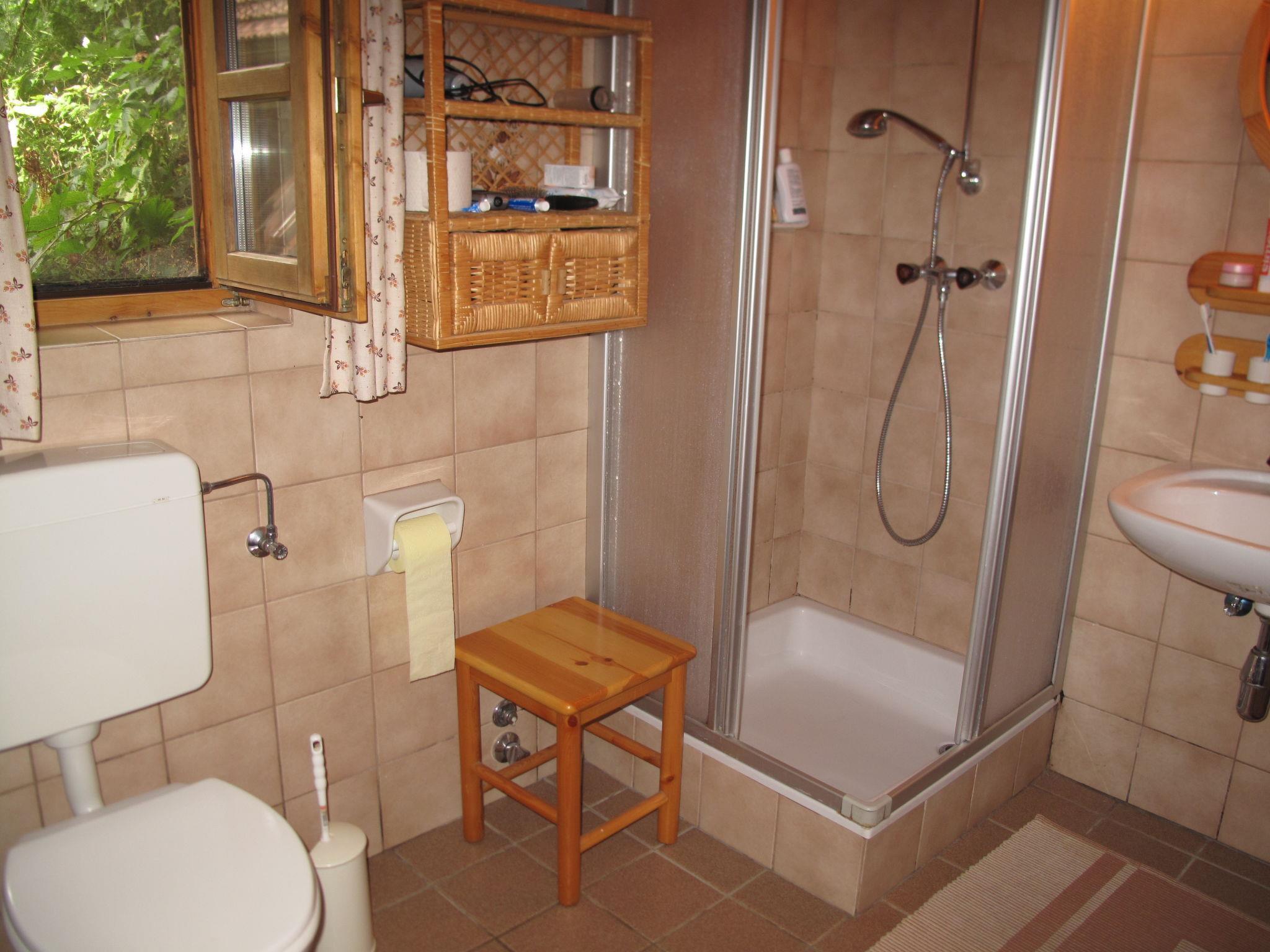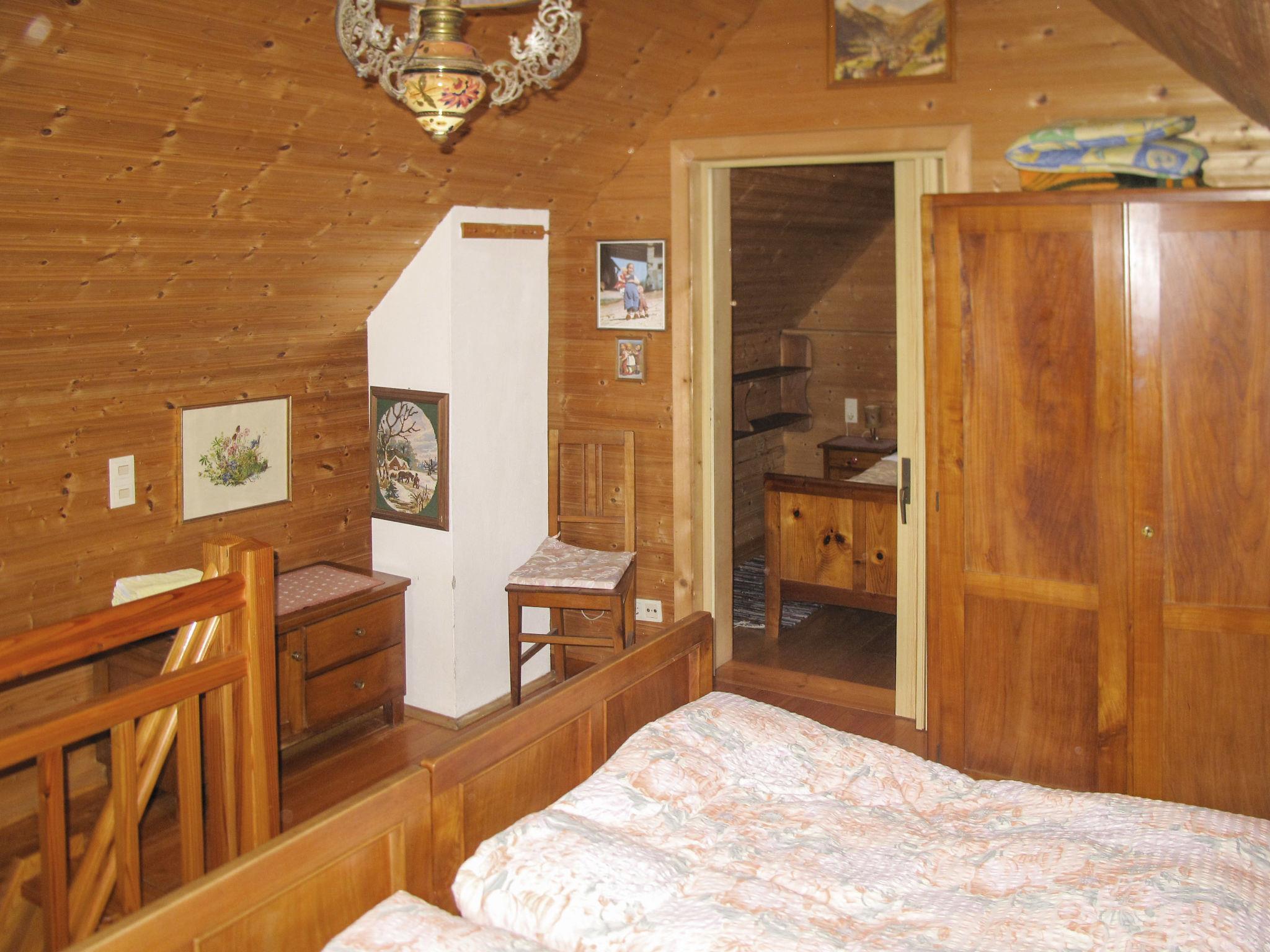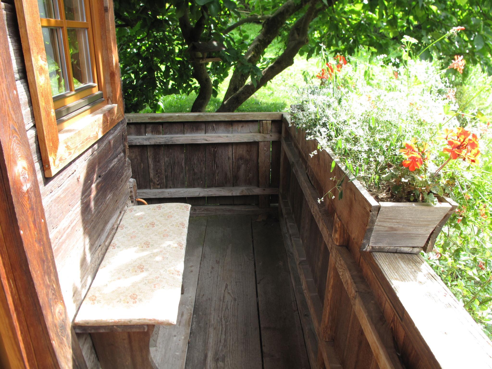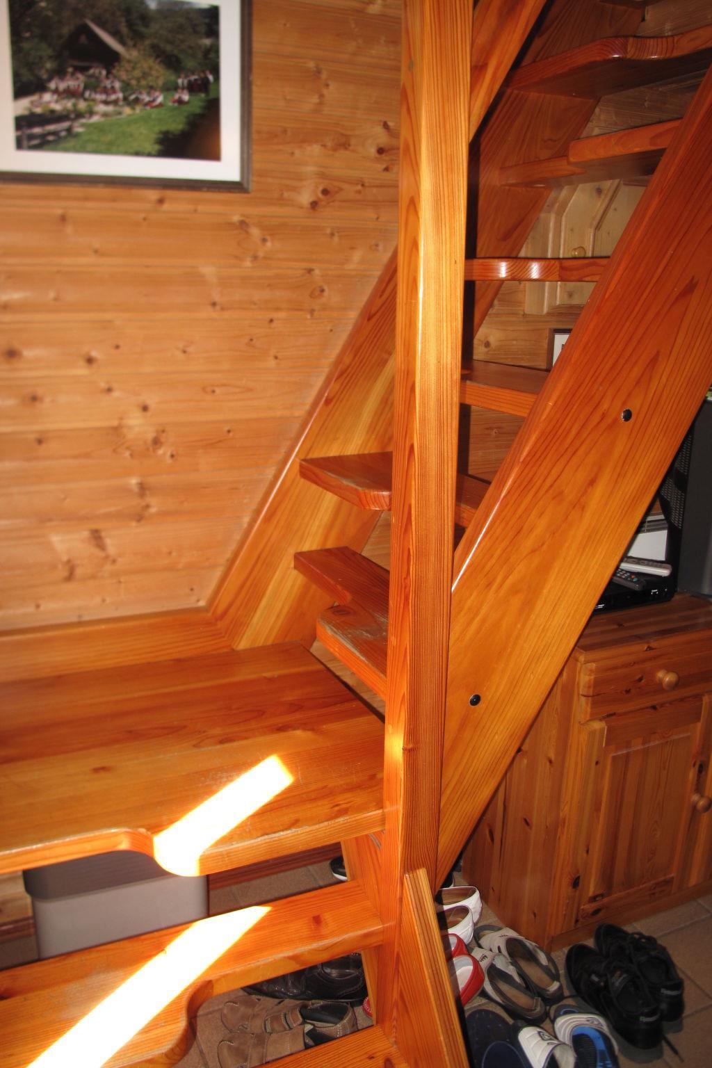 "Kunzhof", 2-room house 64 m2 on 2 levels. Cosy and wooden furniture furnishings: living/dining room with dining table, satellite TV and tiled stove. Open kitchen (3 hot plates, oven, toaster, kettle, microwave, electric coffee machine). Shower/WC. Electric heating. Upper floor: (steep stair) open walk-through room with 1 double bed. 1 double bedroom. Wooden floors. Patio. Facilities: children's high chair, baby cot. Internet (WiFi, free). Please note: non-smokers only. Maximum 1 pet/ dog allowed. Smoke alarm. From the living room steep wooden staircase to the first Floor to hallway with double bed in sleeping alcove, from here access to double rooms.