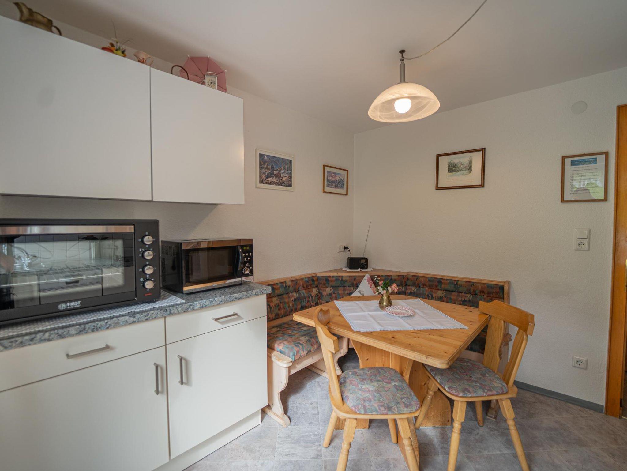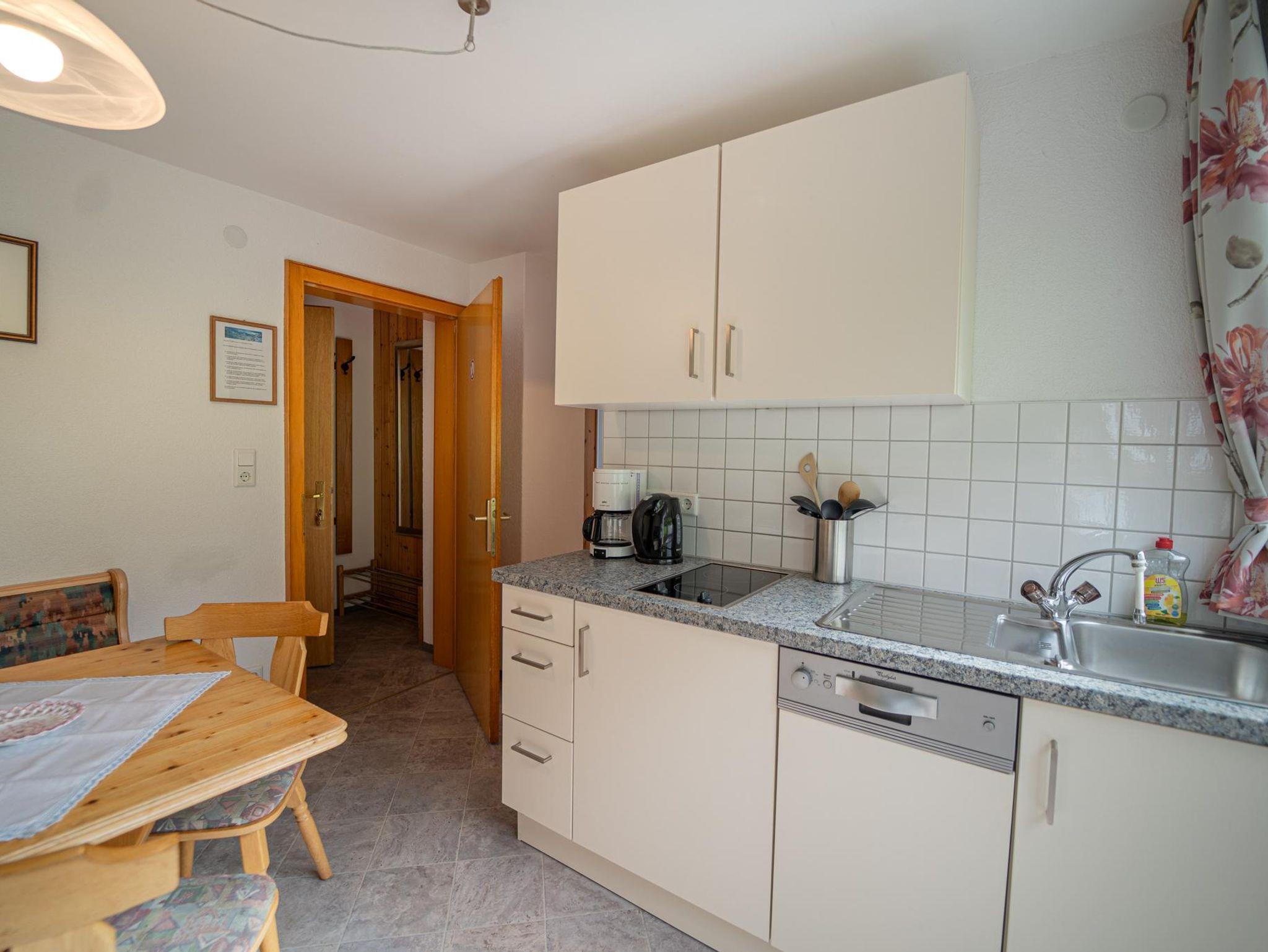 Ferienwohnung Mittagsspitze besteht aus einem kleinen Vorraum mit Garderobe, einer geräumigen, komplett eingerichteten Küche mit Sitzecke und Balkon sowie einem Wohnschlafzimmer und Dusche/WC, ebenfalls mit Balkon.