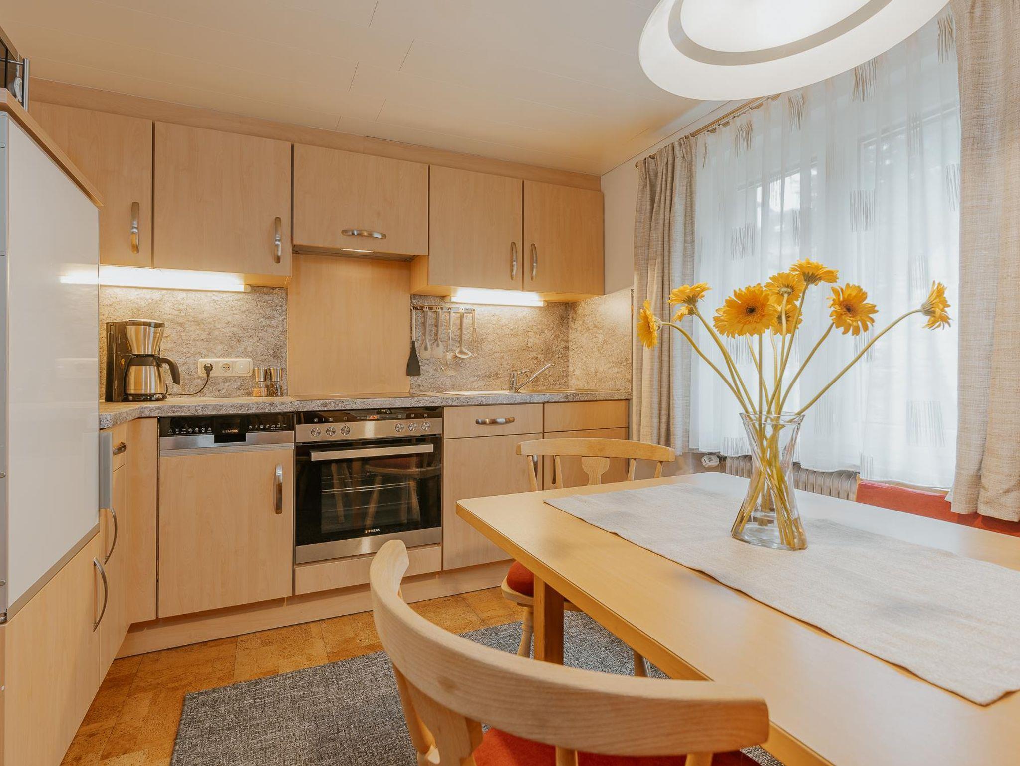 Die Wohnküche ist mit einem Kühlschrank plus Gefrierfach, Herd mit Backrohr, Spülmaschine, Wasserkocher, Kaffeemaschine, Geschirr ausgestattet.
