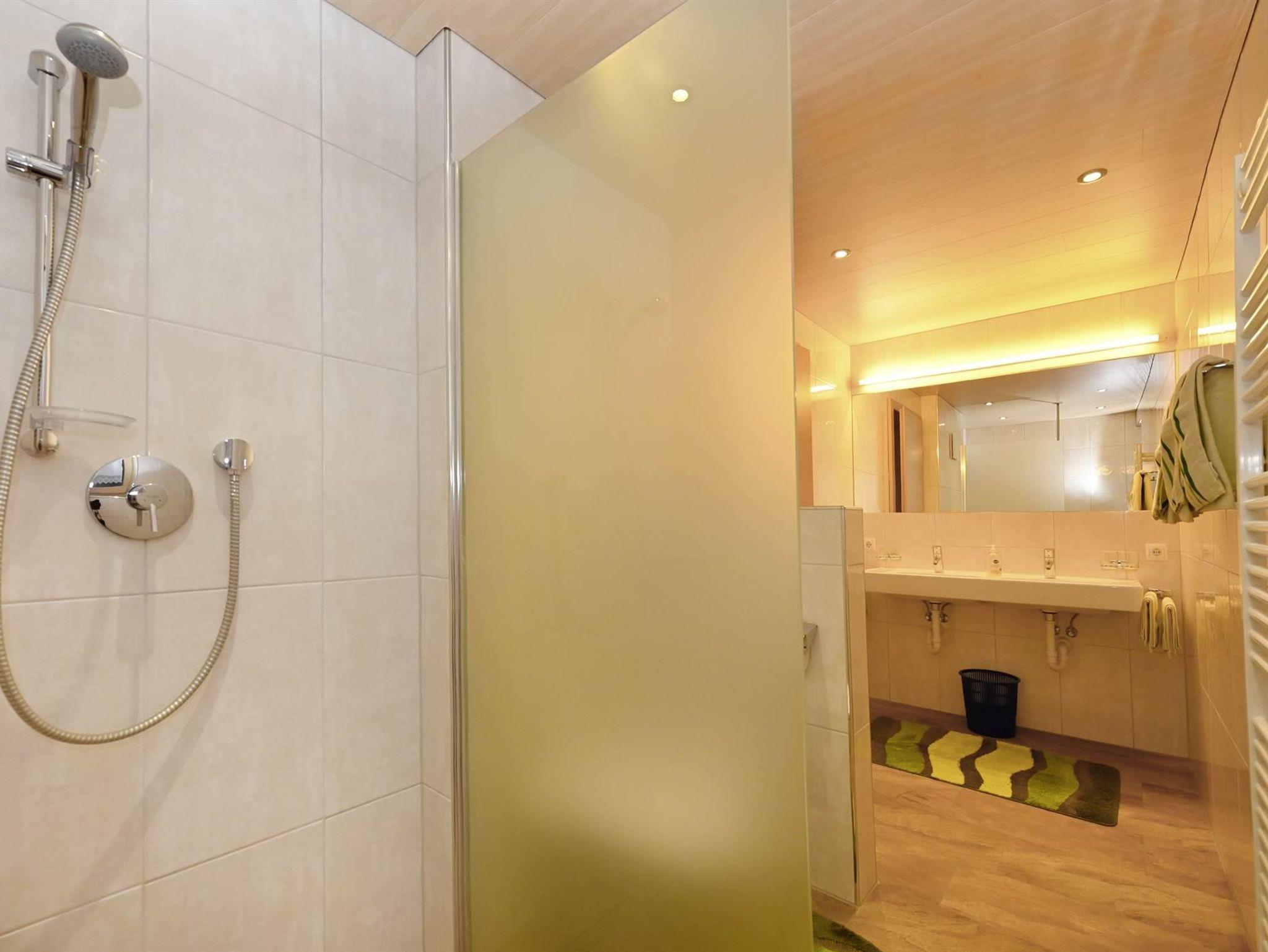 Die 120 m² große Ferienwohnung im Obergeschoss besteht aus 1 Doppelzimmer mit Waschbecken und TV, 1 Zweibettzimmer mit Waschbecken/DU, 1 Vierbettzimmer mit TV, einem großen, wunderschönen Bad mit Doppelwaschbecken/DU/WC, einem separatem WC auf dem Flur, einer gemütlichen Wohnecke/TV mit Schlafcouch und einer großen und modernen Küche mit bequemer Sitzgruppe und einem großen Sonnenbalkon.
