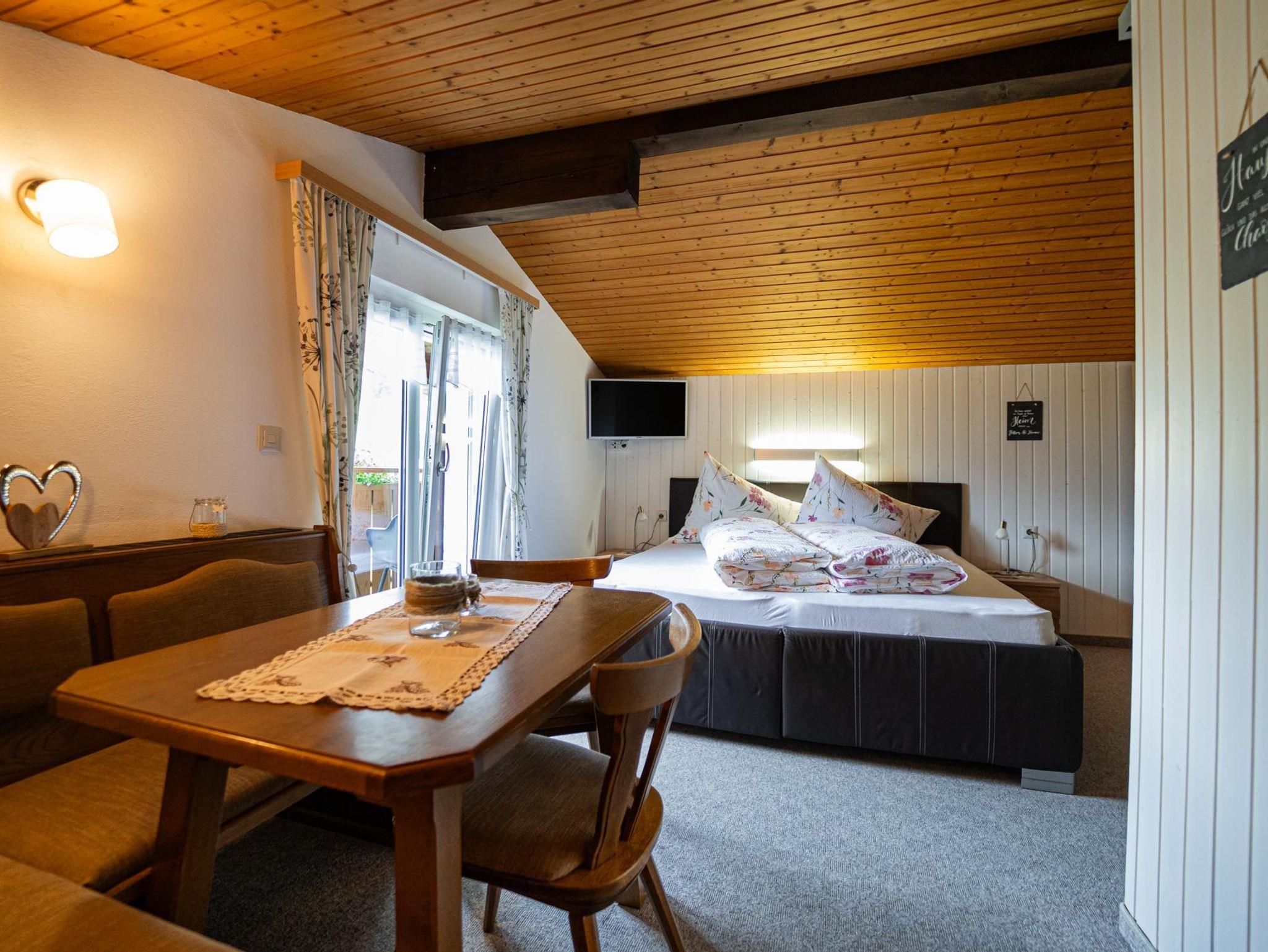 Diese Ferienwohnung besteht aus einer Garderobe, einer geräumigen, komplett eingerichteten Küche mit Sitzecke und Couch, einem Wohnschlafzimmer und Dusche/WC und Balkon sowie einem kleinen Zweibettzimmer. Sat-TV, Radio sowie Bettwäsche und Handtücher stellen wir gratis.