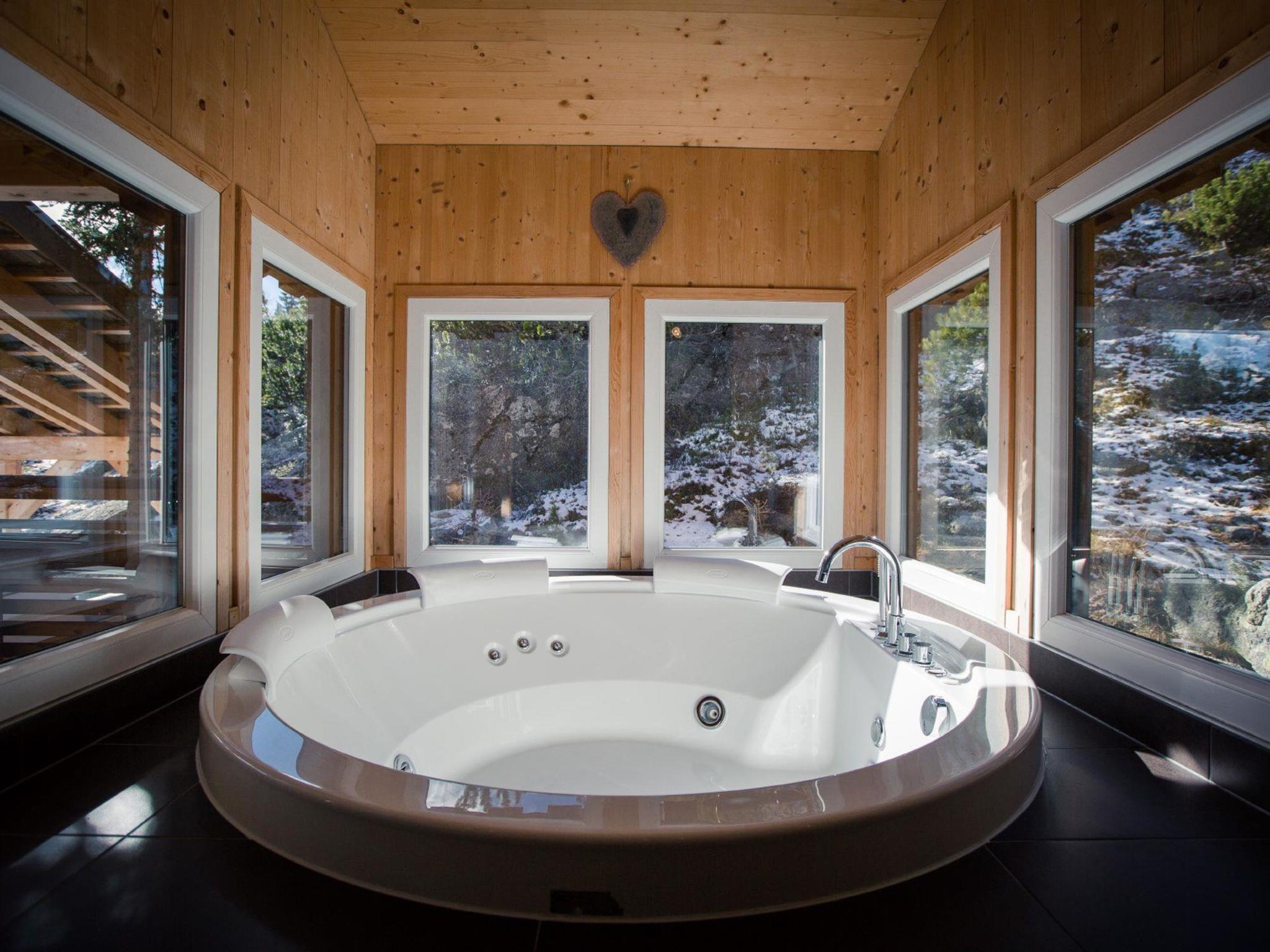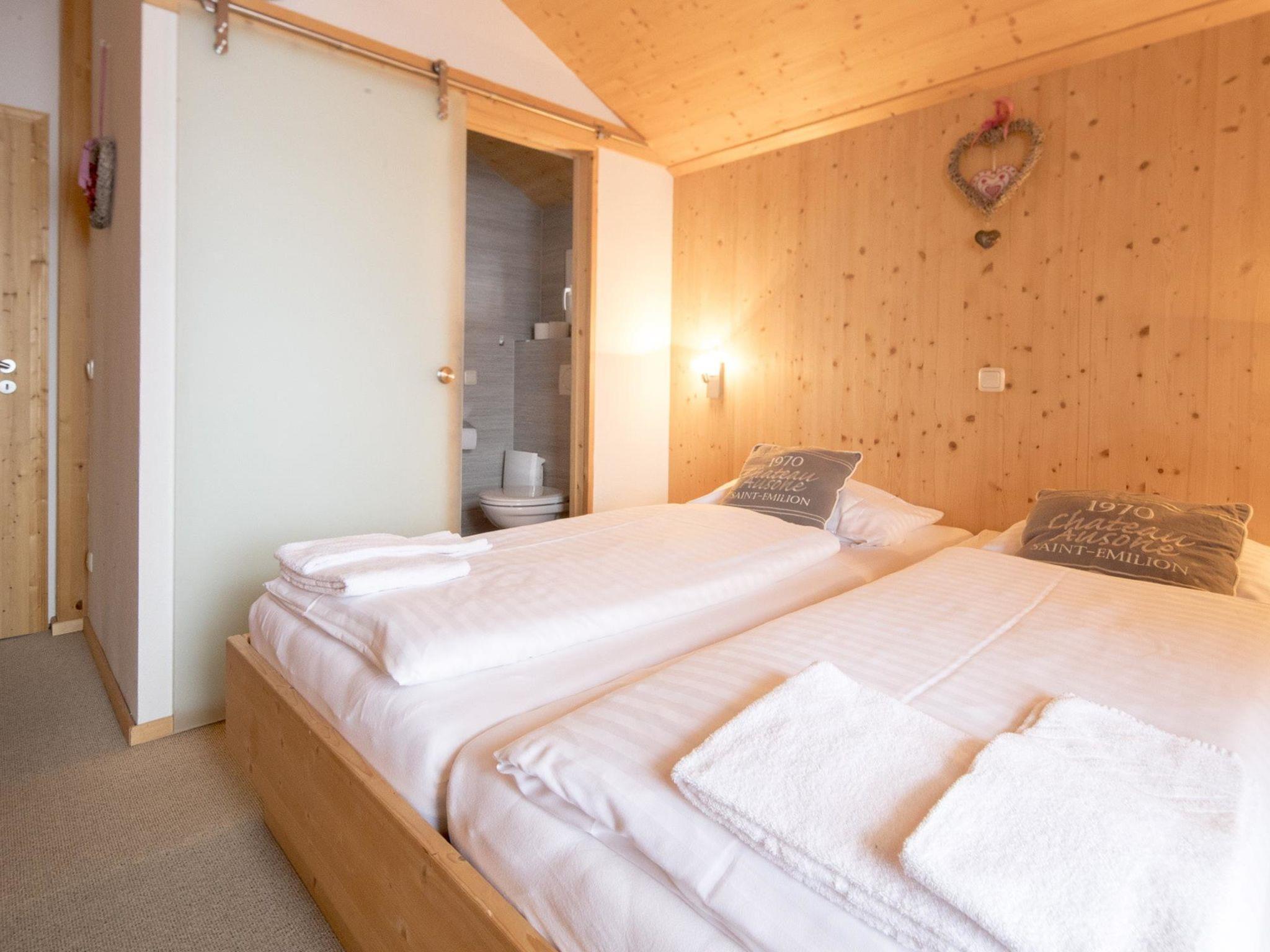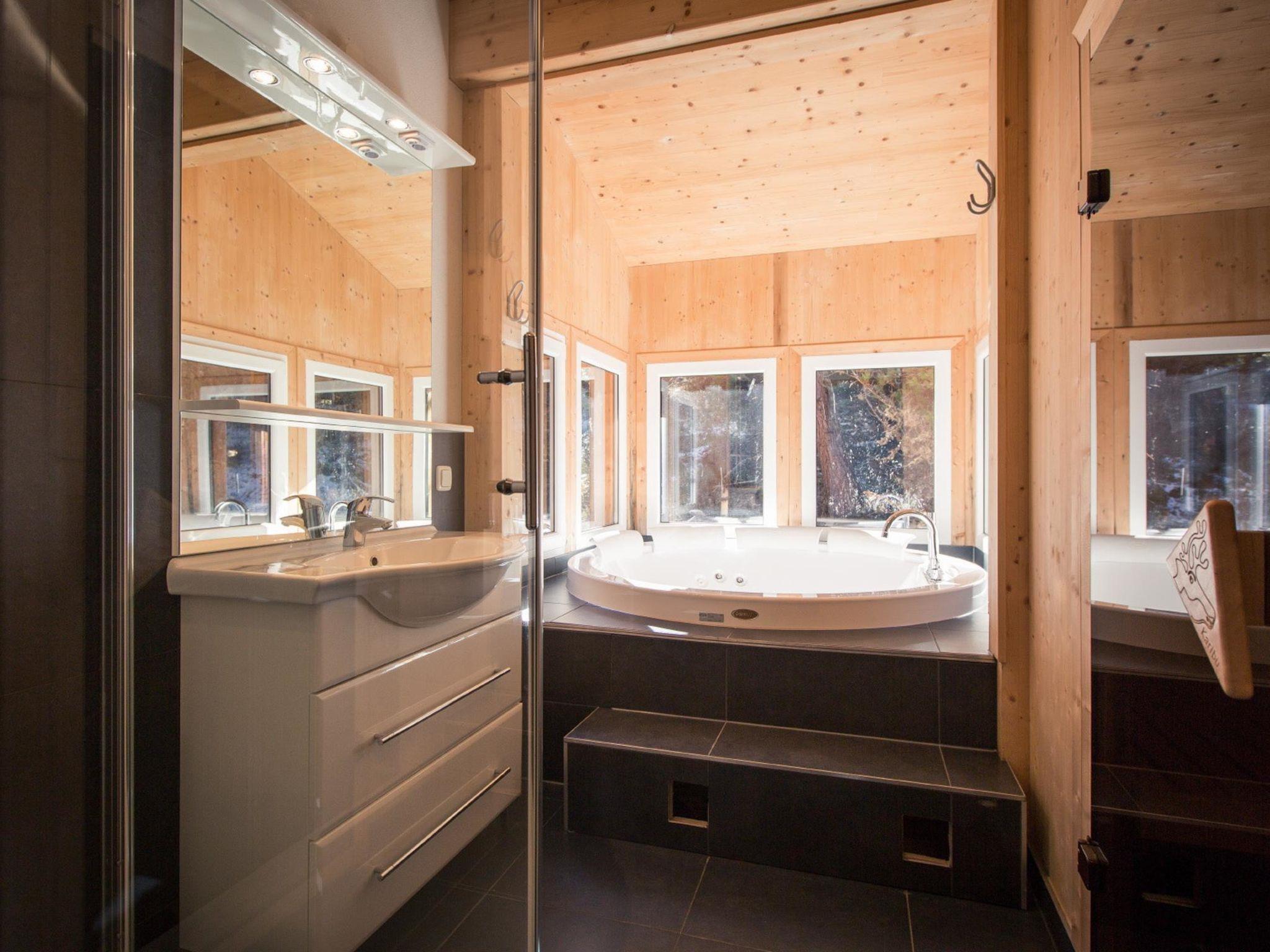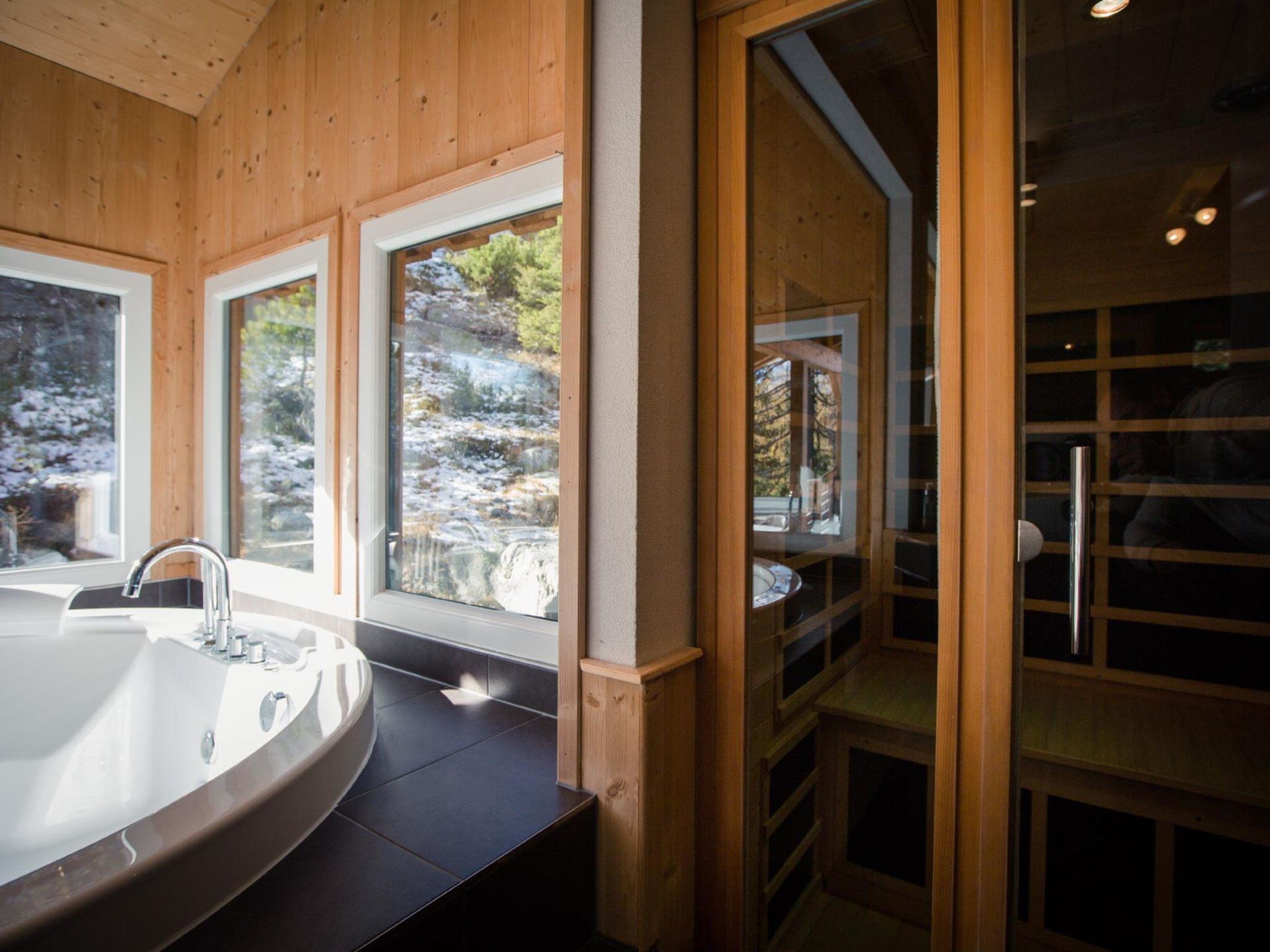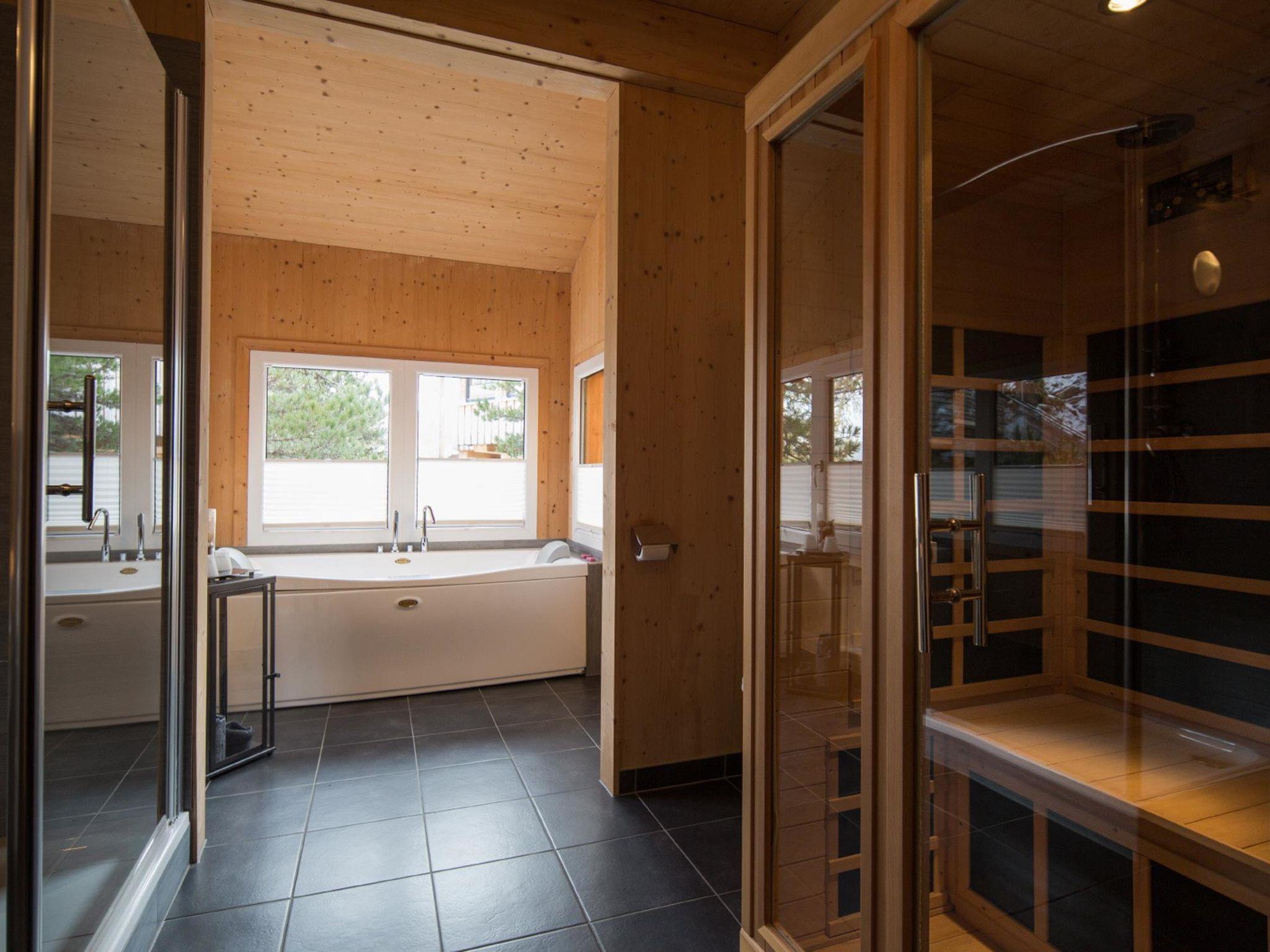 " 1 mit IR-Sauna&Sprudelbad innen", 5-room chalet 120 m2. Luxurious and tasteful furnishings: open living/dining room with dining nook, satellite TV and flat screen. Open kitchen (oven, dishwasher, 4 ceramic glass hob hotplates, microwave, freezer, electric coffee machine). 2 showers/WC. Upper floor: 2 double bedrooms. 1 double bedroom with 1 bed. 1 room with 2 x 2 bunk beds. Bath/WC, hydro massage bath, Sauna. Balcony terrace. Beautiful view of the mountains. Facilities: Internet (WiFi, free). Parking (2 cars) at the house. Please note: non-smokers only. Smoke alarm. The property is one of a type of property or apartment. The sauna is an infrared sauna.