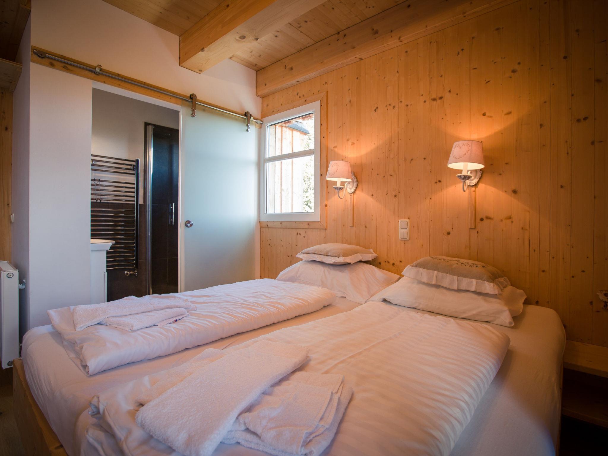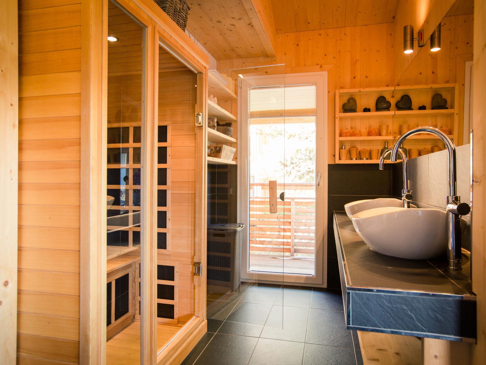 " 6 mit IR-Sauna und Sprudelwanne Innen", 6-room chalet 130 m2 on 3 levels. Spacious, luxurious and wooden furniture furnishings: 1 room with 1 x 2 bunk beds, 1 double bed. 2 double bedrooms. 2 showers/WC. On the lower ground floor: 1 double bedroom. 1 room with 1 x 2 bunk beds. Shower/WC. Upper floor: large living room with dining nook and satellite TV (flat screen), gas heater. Open kitchen (oven, dishwasher, 4 ceramic glass hob hotplates, freezer, electric coffee machine). Bath/shower/WC, hydro massage bath, Sauna. Balcony or terrace. Balcony furniture. Beautiful view of the mountains. Facilities: Internet (WiFi, free). Please note: non-smokers only. The property is one of a type of property or apartment. The sauna in the relaxation area is an infra-red cabin. A small ski locker is situated outside of the house. When there are less than the maximum number of guests staying at the property, not all of the housing units will be available for use.
