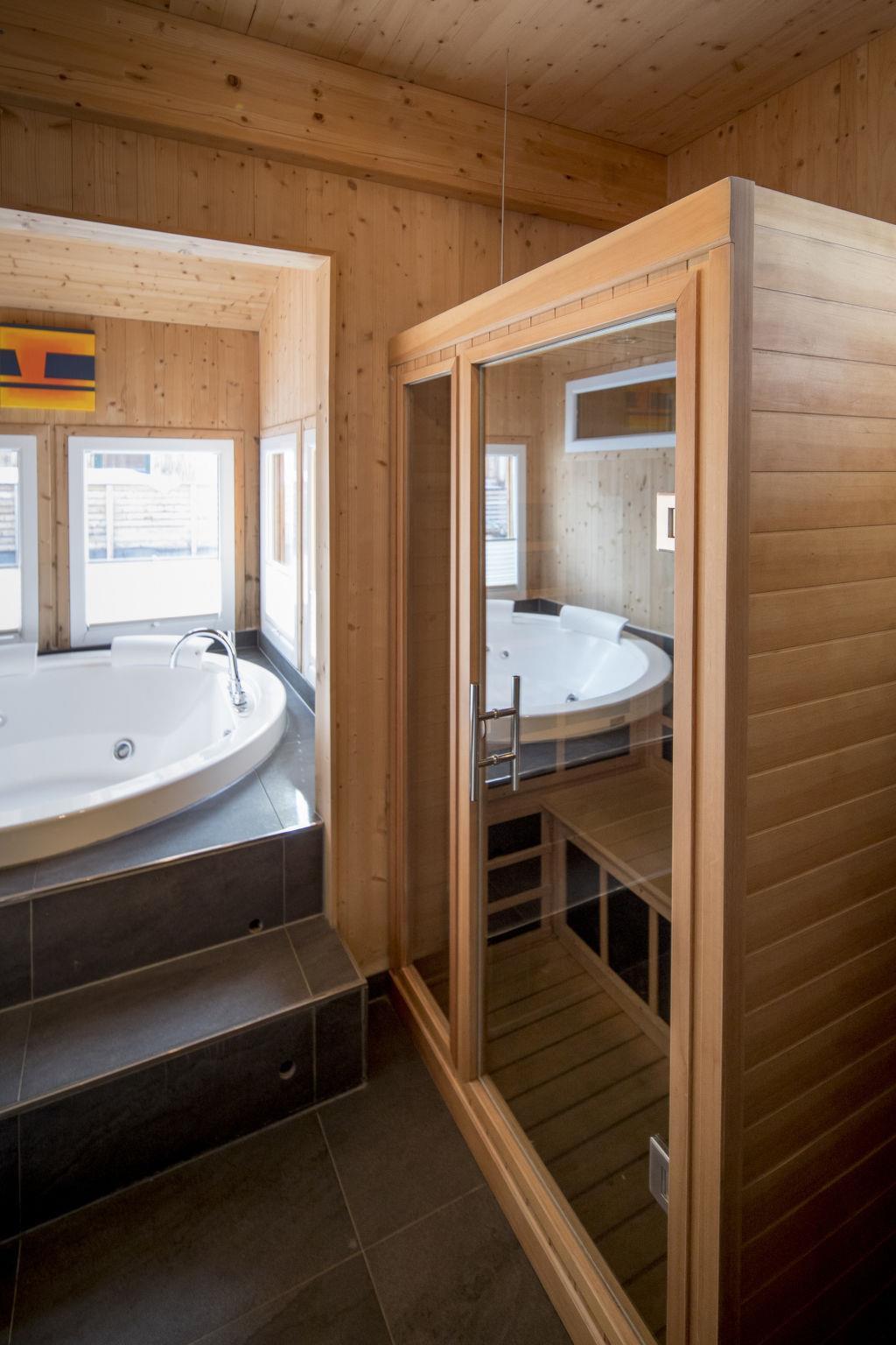 " 19 mit IR-Sauna und Sprudelbad", 5-room chalet 130 m2. Comfortable and tasteful furnishings: open living/dining room with dining nook, satellite TV, flat screen and gas heater. Open kitchen (oven, dishwasher, 4 ceramic glass hob hotplates, freezer, electric coffee machine). 2 showers/WC. Upper floor: 2 double bedrooms. 1 room with 1 bed and 2 x 2 bunk beds. 1 room with 2 x 2 bunk beds. Shower/WC, double hand-basin, hydro massage bath, Sauna. Terrace. Terrace furniture. View of the mountains and the countryside. Facilities: Internet (WiFi, free). Parking (2 cars) at the house. Please note: non-smokers only. The property is one of a type of property or apartment. The allocation of rooms may vary. The sauna is an infrared cabin. The storage room is a room for skis and washing machine. When there are less than the maximum number of guests staying at the property, not all of the housing units will be available for use.