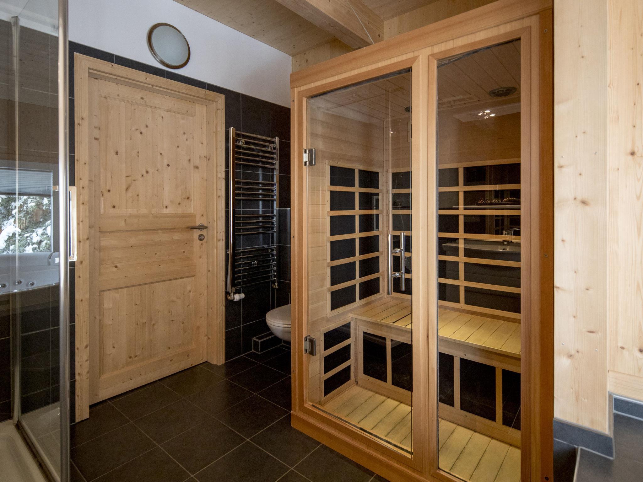 " 45 mit IR-Sauna und Sprudelbad innen", 5-room chalet 120 m2 on 2 levels. Luxurious and tasteful furnishings: living/dining room with dining nook and satellite TV (flat screen). Open kitchen (oven, dishwasher, 4 ceramic glass hob hotplates, toaster, kettle, microwave, electric coffee machine). Shower/WC. Upper floor: 2 double bedrooms. 1 room with 1 x 2 bunk beds, 1 double bed. 1 room with 2 x 2 bunk beds. Bath/WC, shower/WC, hydro massage bath, Sauna. Balcony. Balcony furniture. Beautiful view of the mountains. Facilities: Internet (WiFi, free). Please note: non-smokers only. The sauna is an infrared cabin.