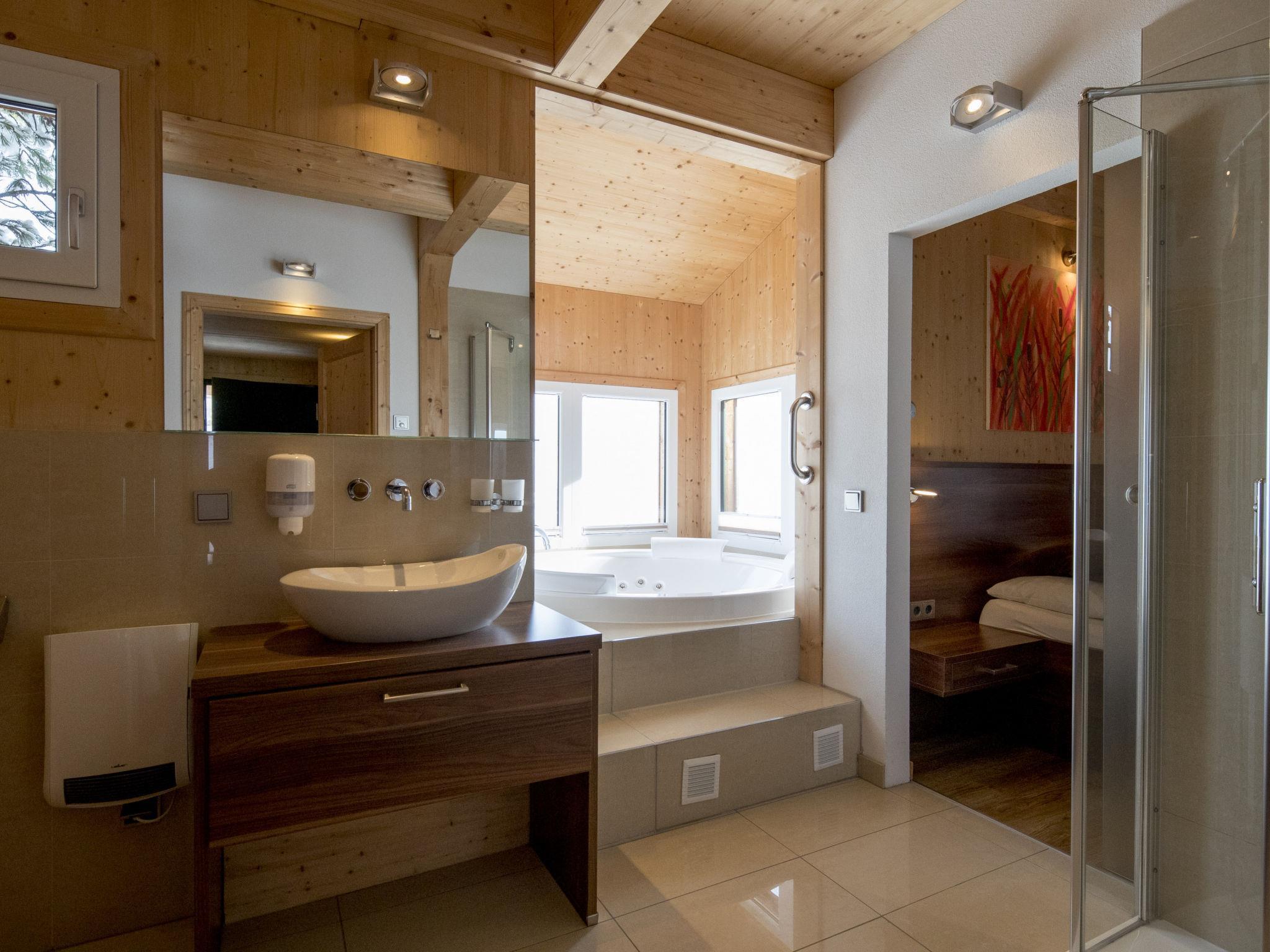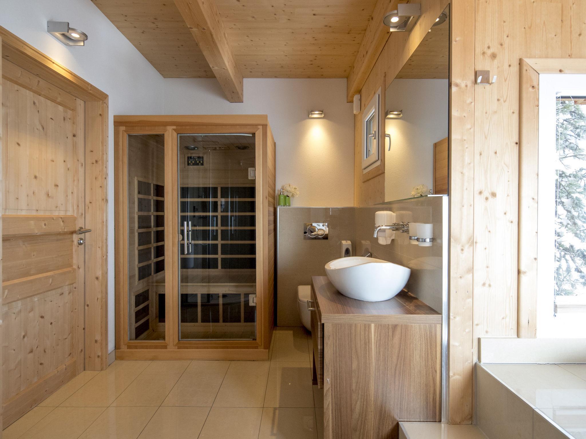 " 38 mit IR-Sauna und Sprudelbad innen", 6-room chalet 120 m2 on 2 levels. Luxurious and tasteful furnishings: living/dining room with dining nook and satellite TV (flat screen). Open kitchen (oven, dishwasher, 4 ceramic glass hob hotplates, toaster, kettle, microwave, electric coffee machine). Shower/WC. Upper floor: 4 double bedrooms. 1 room with 2 x 2 bunk beds. Bath/WC, shower/WC, hydro massage bath, Sauna. Balcony. Balcony furniture. Beautiful view of the mountains. Facilities: Internet (WiFi, free). Please note: non-smokers only. The sauna is an infrared cabin.