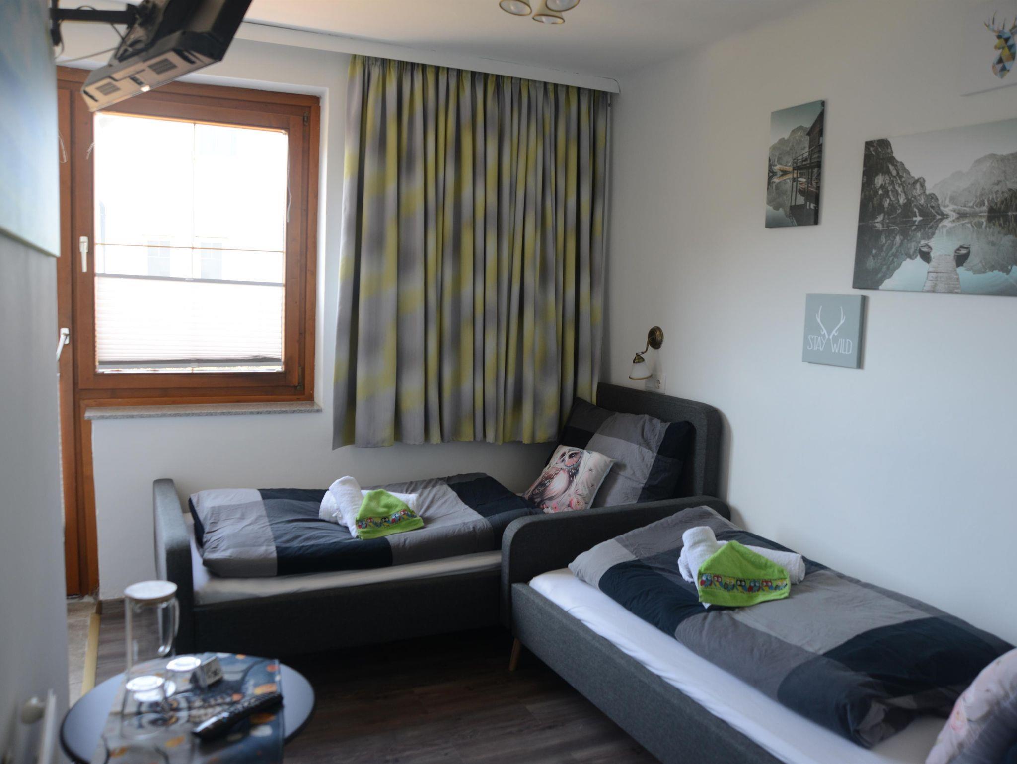 Zimmer mit 2 Einzelbetten und großem Balkon. WC und Dusche.