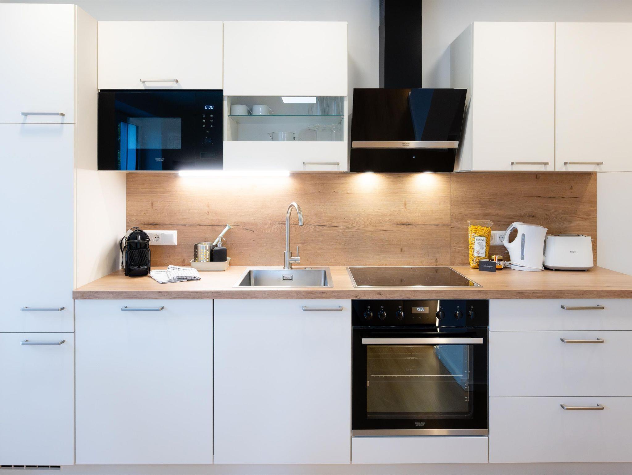 Voll ausgestattete, moderne Küche mit Cerankochfeld, Backofen, Dunstabzugshaube, Geschirrspüler, Kühlschrank mit Gefrierfach, Kaffeemaschine(Kapseln-Nespresso), Mikrowelle, Wasserkocher, Toaster, Geschirrtücher und selbstverständlich ausreichend Geschirr, Pfannen und Töpfe.