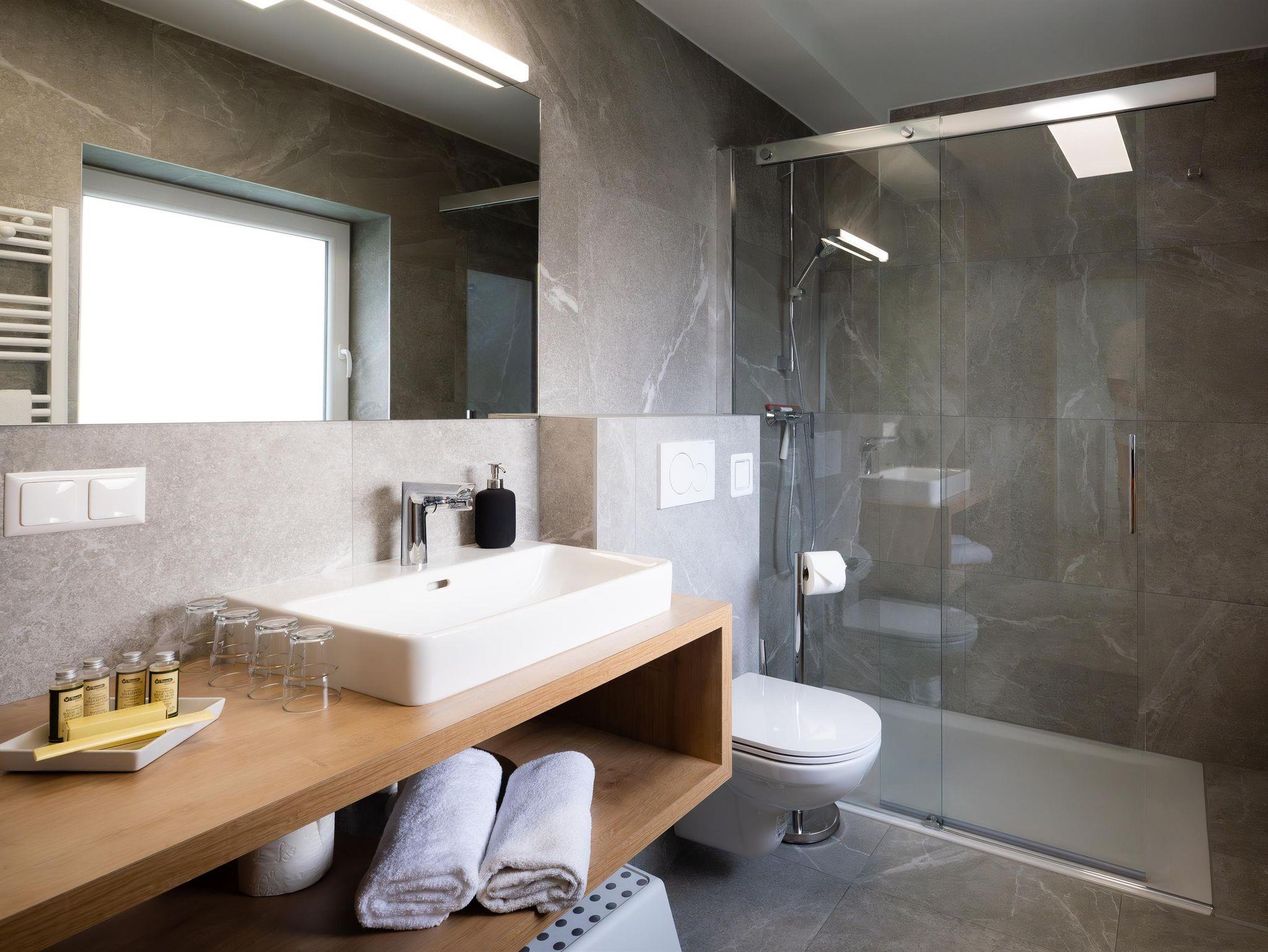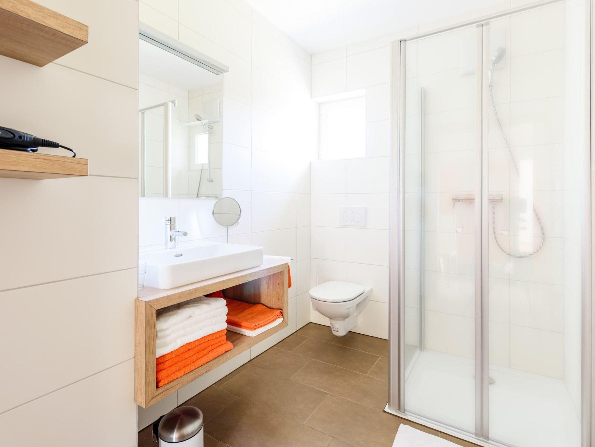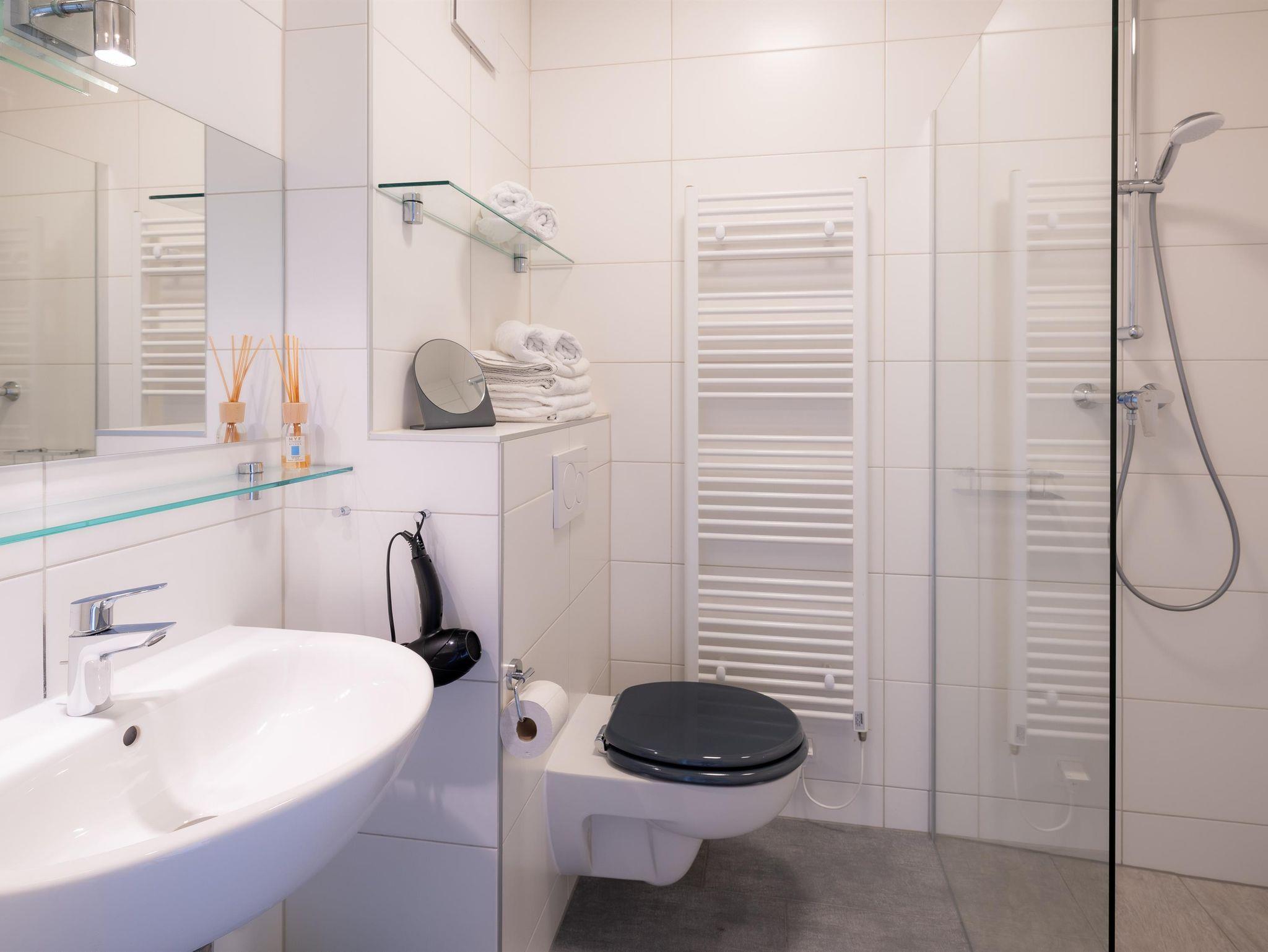 Das komfortable Badezimmer verfügt über einen Waschtisch, eine Dusche sowie eine Toilette. Hand-, Duschtücher, Fön und elektr. Handtuchtrockner sind vorhanden.