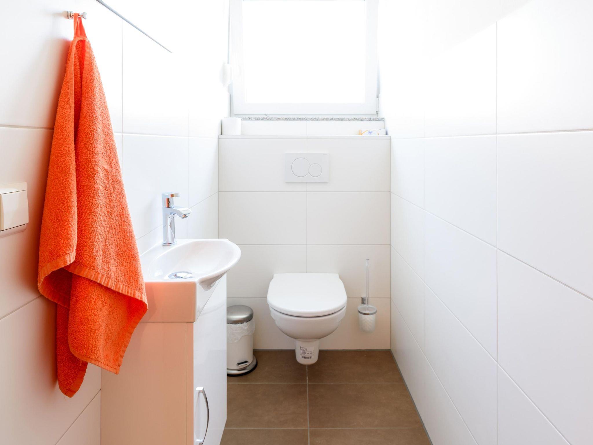 Das komfortable Badezimmer verfügt über einen Waschtisch, eine Dusche sowie eine Toilette. Hand-, Duschtücher, Fön und elektr. Handtuchtrockner sind vorhanden.