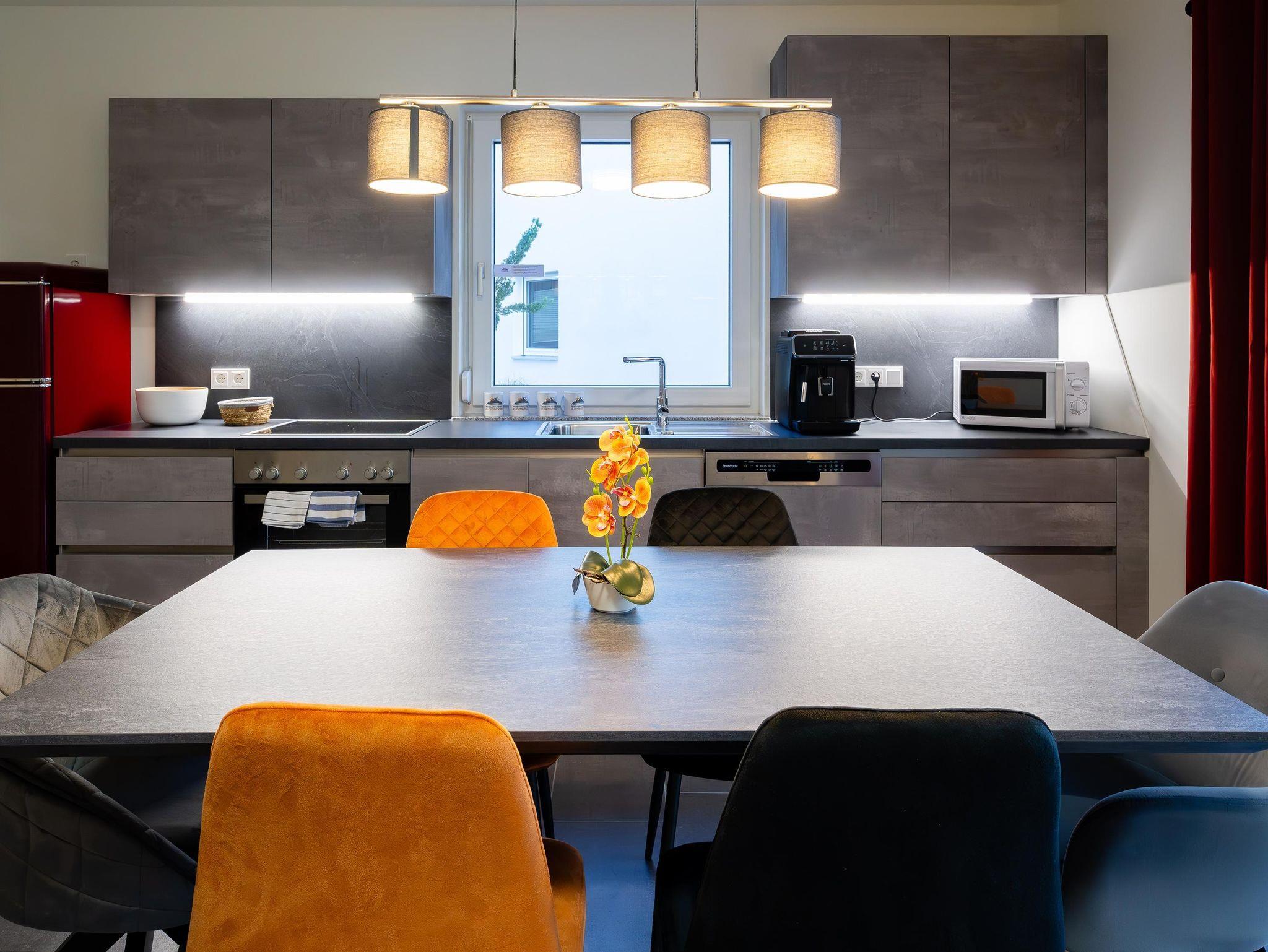 Voll ausgestattete, moderne Küche mit Cerankochfeld, Backofen, Dunstabzugshaube, Geschirrspüler, Kühlschrank mit Gefrierfach, Kaffeemaschine(Kapseln-Nespresso), Mikrowelle, Wasserkocher, Toaster, Geschirrtücher und selbstverständlich ausreichend Geschirr, Pfannen und Töpfe.