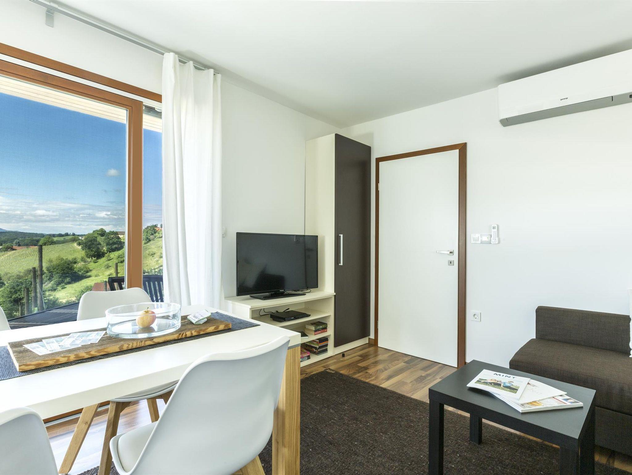 In erster Reihe und mit freiem Blick auf die atemberaubende Natur hält das WeinHAUS 02 jede Menge Komfort und Wellness bereit. Auf 40 Quadratmetern bietet das Ferienhaus mit einer komplett ausgestatteten Küche, einem gemütlichen Schlafzimmer für 2 sowie Bad mit Dusche und WC separat alles für eine erholsame Auszeit. Noch mehr Entspannung verspricht die private Infrarotkabine im Ferienhaus.
