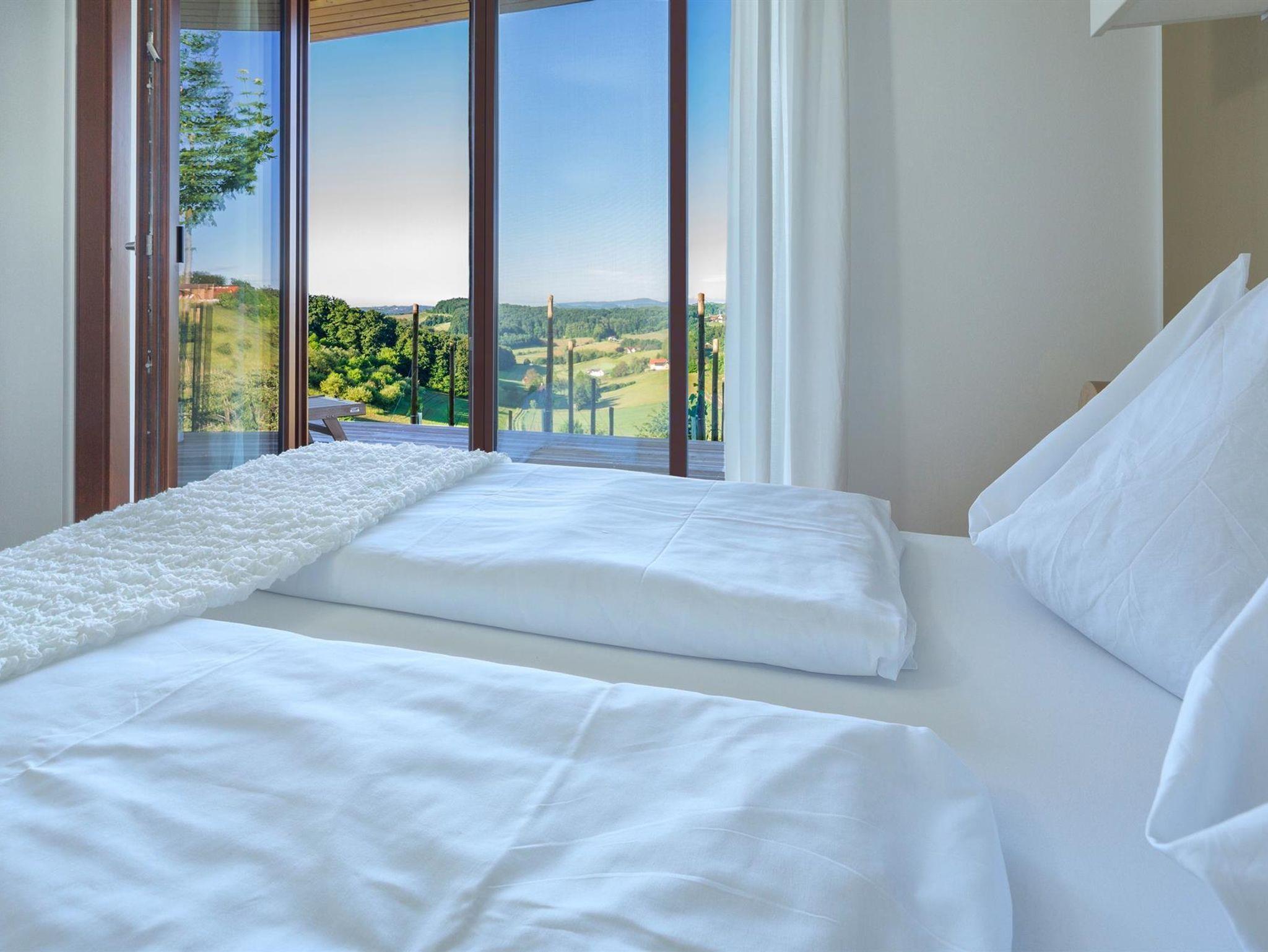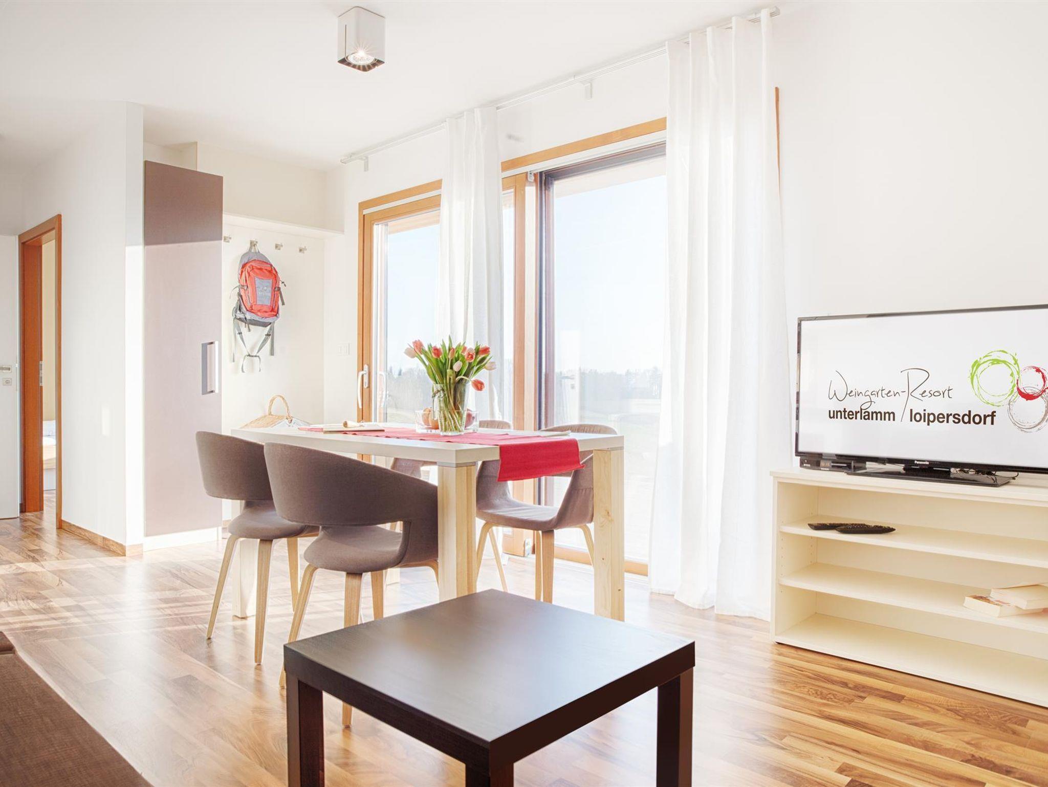 Schier unendliche Weinreihen, die sich wie Perlen an einer Kette aneinanderreihen. Die sanfte Hügellandschaft der Südoststeiermark. Und mittendrin das Weingarten-Resort Unterlamm Loipersdorf. Wenn moderne Architektur und unberührte Naturlandschaften aufeinander treffen, dann ist man angekommen im Weinurlaub im Süden Österreichs. Die absolute Ruhelage begeistert Erholungssuchende von der ersten Minute an. Hier ist man auf „Du und Du“ mit der Natur. Alleine und doch bleiben keine Wünsche offen! Insgesamt erwarten vier exklusive Ferienhäuser unsere Gäste aus Nah und Fern. Jedes WeinHAUS zeichnet sich dabei durch klare Linien, ein gemütliches Ambiente und einen Urlaub mit Hotel-Komfort aus. Für noch mehr Privatsphäre sorgt die großzügige Sonnenterrasse mit 55 Quadratmetern, mit der jedes WeinHAUS ausgestattet ist. Im Inneren der Premium Apartments stehen auf 40 Quadratmetern zwei Schlafräume, eine Designer Küche und ein modernes Duschbad mit Regendusche bereit. Nicht zu vergessen der grandiose Ausblick auf die umliegenden Weinberge. Die großen Fensterfronten lassen innen und außen, Natur und Wohnen, zu einem großen Ganzen verschmelzen. Entspannte Tage stehen Ihnen bevor, herzlich willkommen im Weinurlaub!