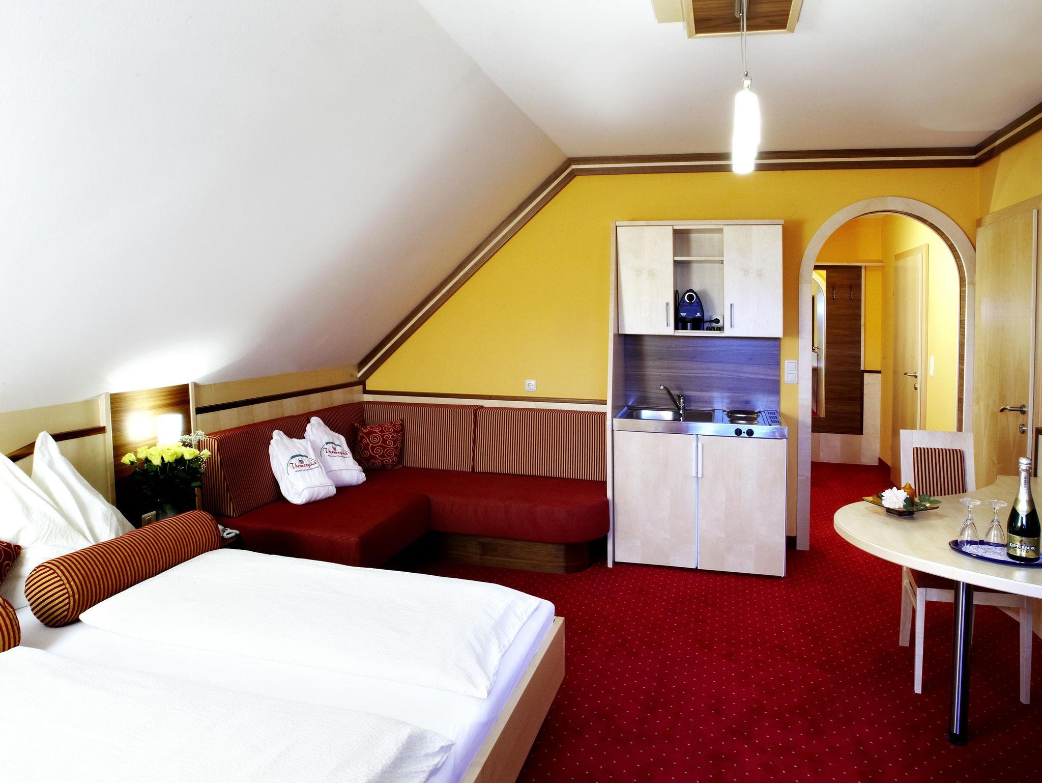 Einfach wohlfühlen und genießen. Unweit der Therme Loipersdorf in einem romantischen Seitental gelegen, ist unser Haus mit allen seinen Vorzügen der richtige Platz für die ganze Familie. Genießen Sie den Tag mit allen seinen schönen und guten Dingen. An unserem reichhaltigem Frühstücksbuffet kommen unsere Gäste schon am Morgen auf den guten Geschmack. Die großzügige Ausstattung der Komfortzimmer in unserem Haus lässt Sie nichts vermissen. Sämtliche Zimmer sind mit Sat-TV, Radio, Telefon, Tresor, Fön sowie Dusche und WC (getrennt) ausgestattet. Vom Balkon bietet sich Naturliebhabern ein herrlicher Ausblick auf die schöne Landschaft. Währenden Sie sich auf der Terasse oder auf der Liegewiese erholen, können sich Ihre kleinen Lieblinge am Kinderspielplatz austoben oder sich im Streichelzoo vergnügen. Gratis Fahrrad und Badmantelverleih. Die Geschenksidee: Gutscheine für ein paar erholsame Tage im Hotel Garni Thermenglück ****.