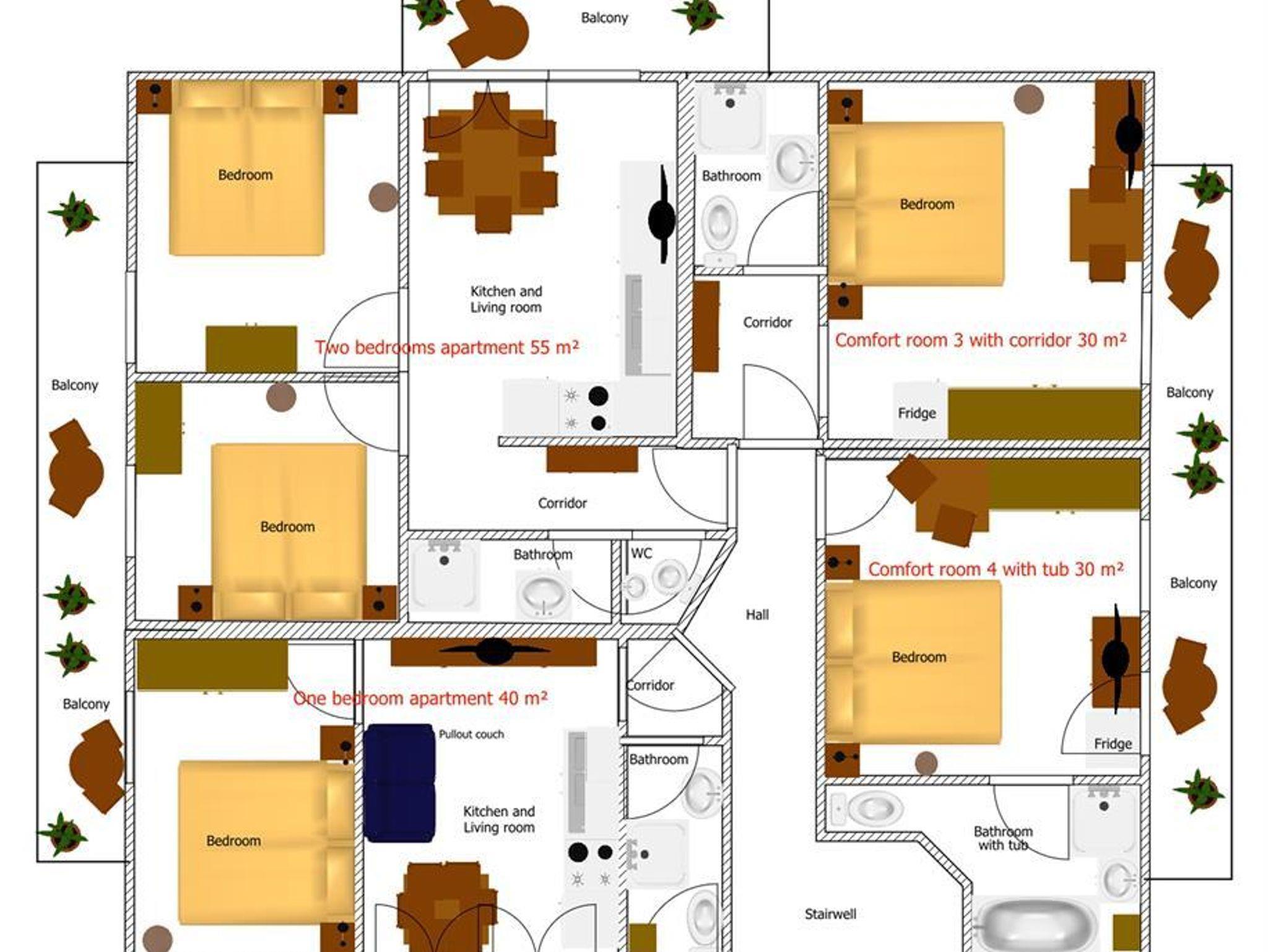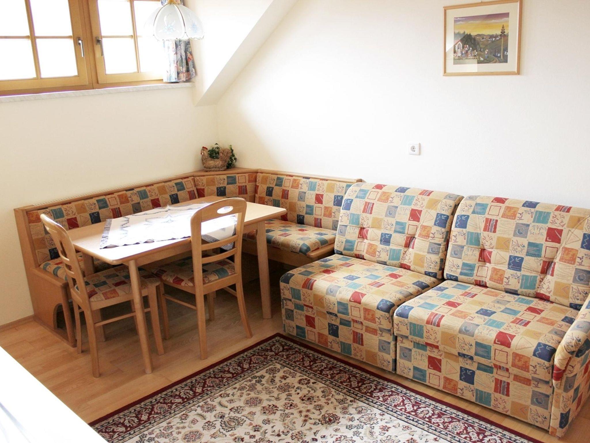 Appartement 1: Elektroherd mit vier Herdplatten, Kühlschrank, Kaffeemaschine, Wasserkocher, extra Vorraum, Bad/Dusche/WC, Föhn, Balkon, Couch, Sitzgruppe, Sat-TV, Radio.