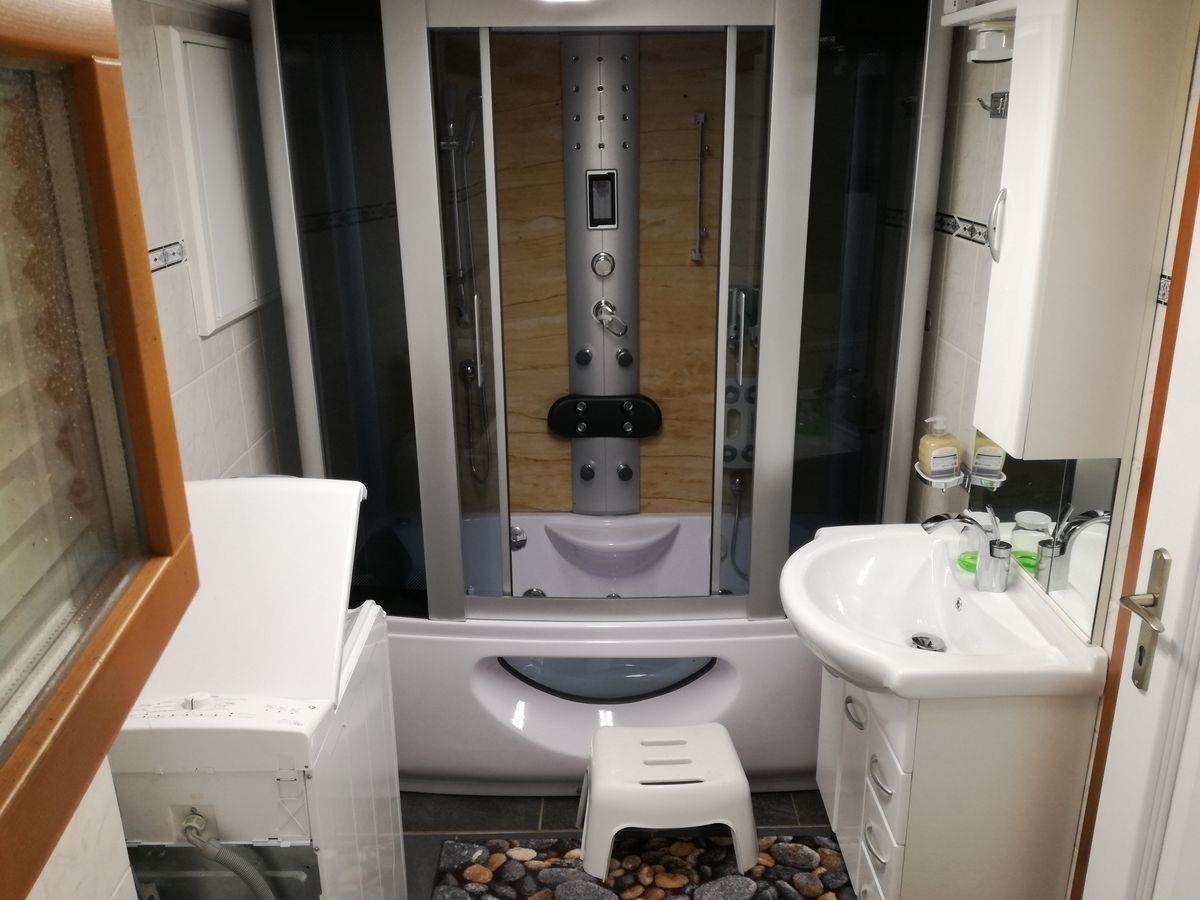 UG: Großes Wellness-Badezimmer mit Whirlpool-Duschtempel, Badewanne mit Dampffunktion, WC & Waschmaschine
