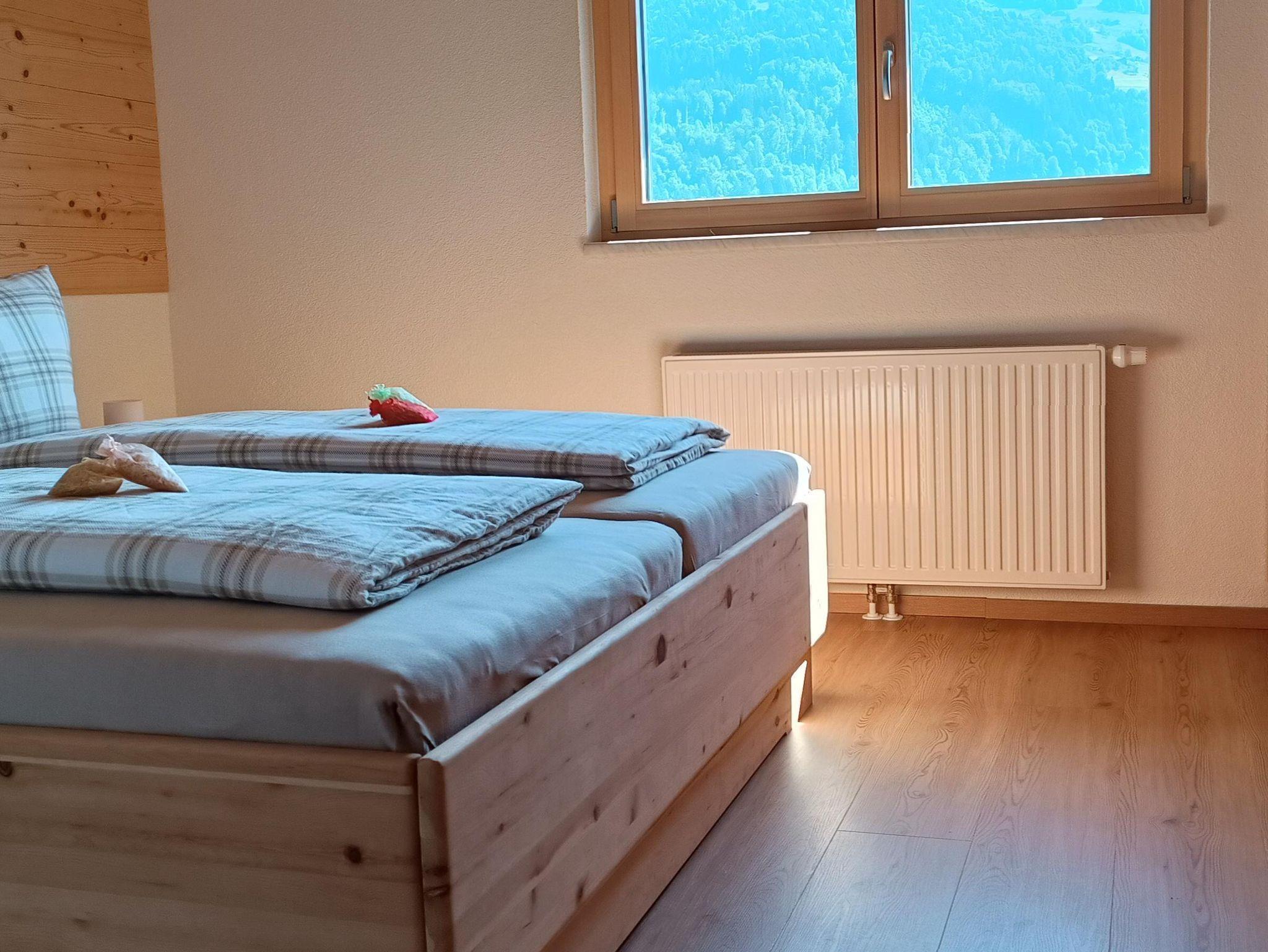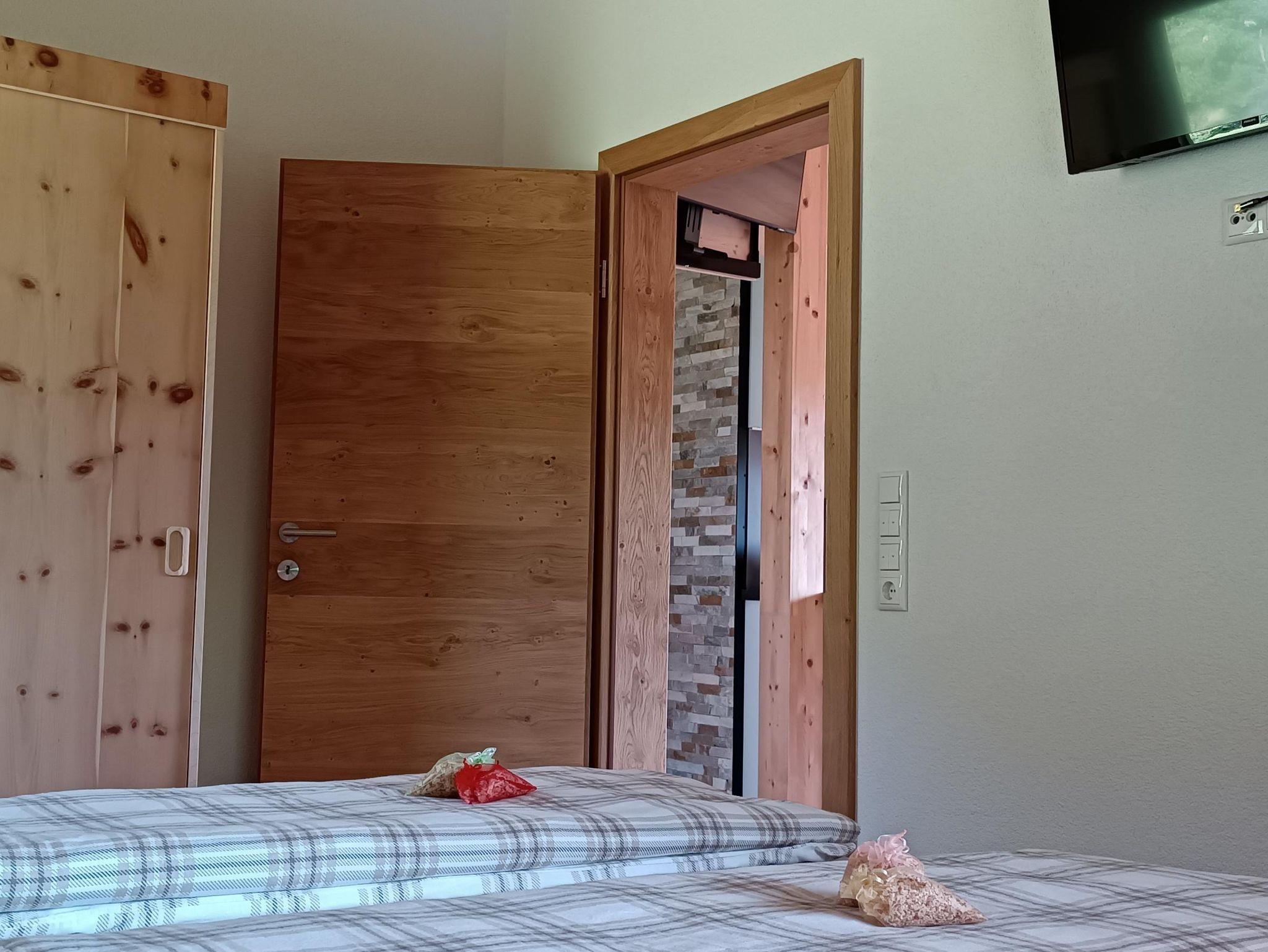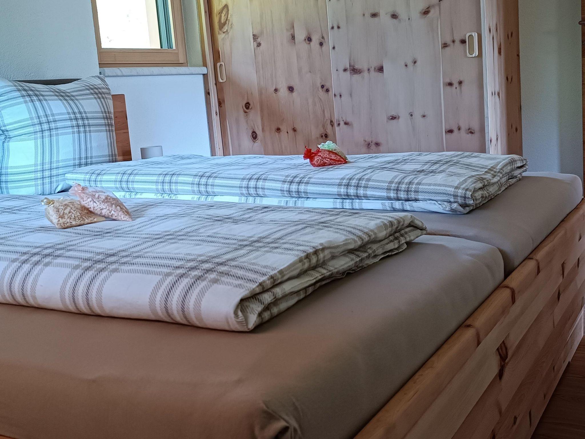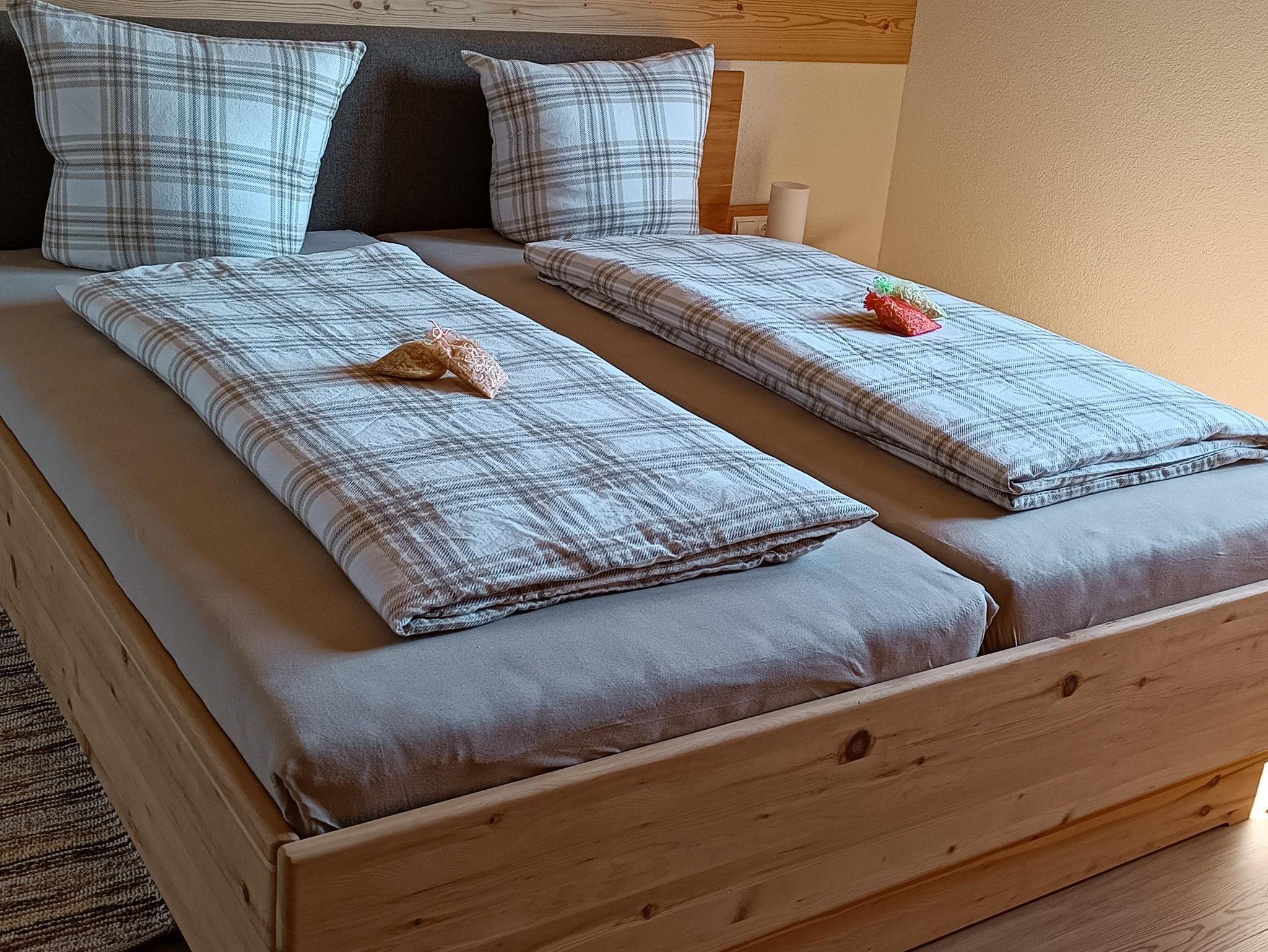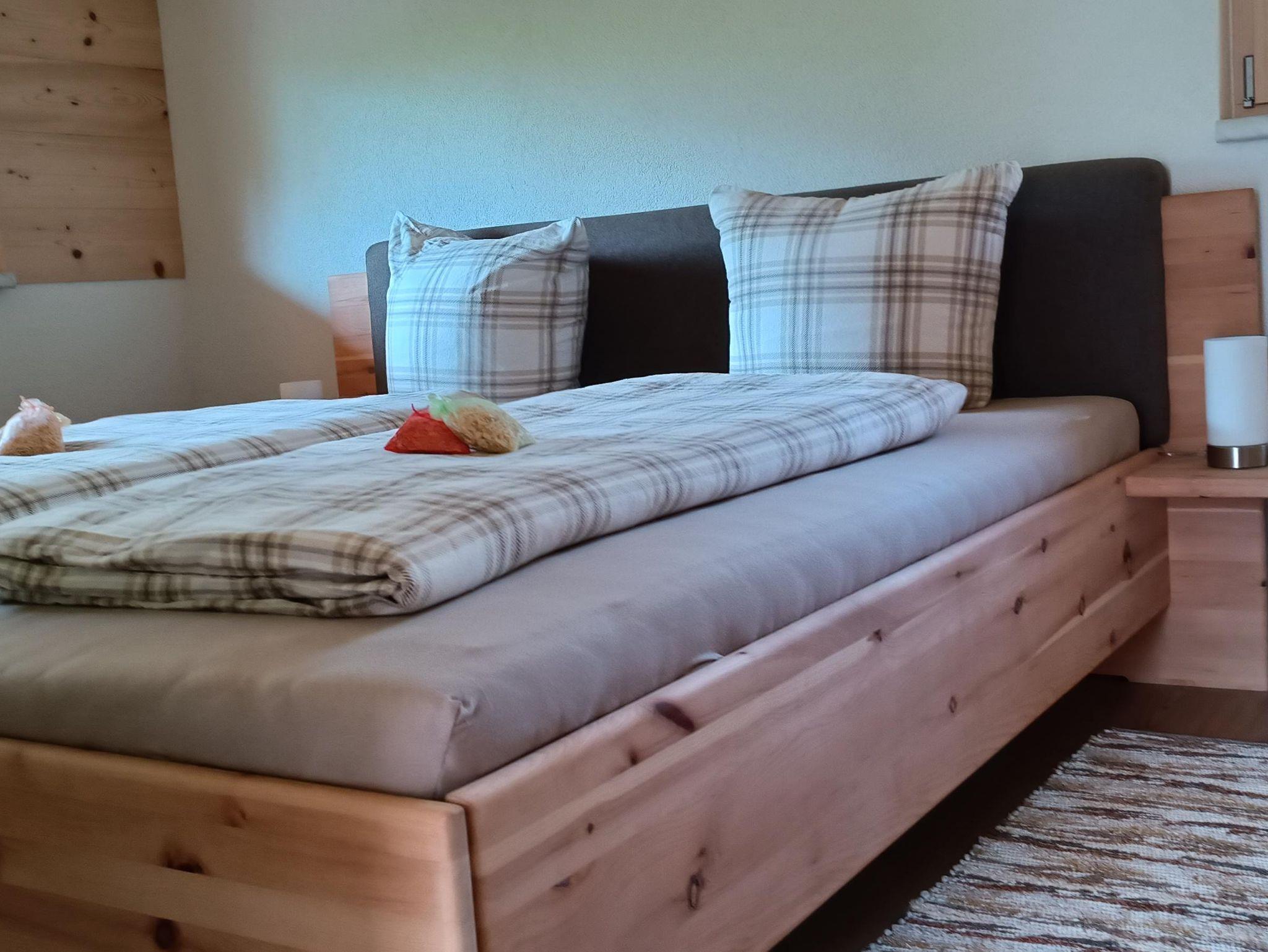 2 Zirbenholz-Schlafzimmer mit Doppelbett, Nachkasten, Kleiderschrank und Fernseher