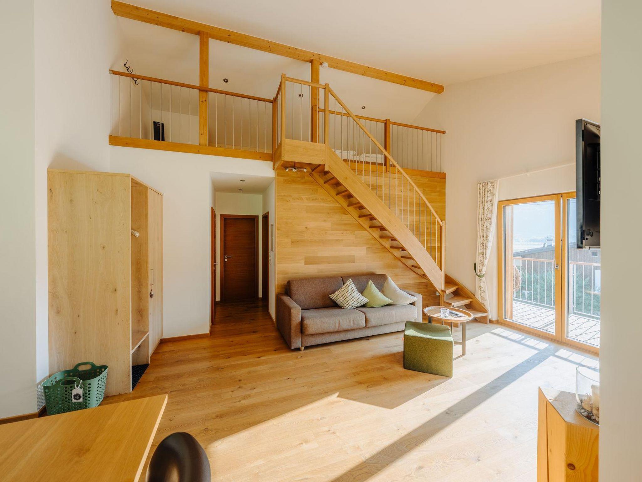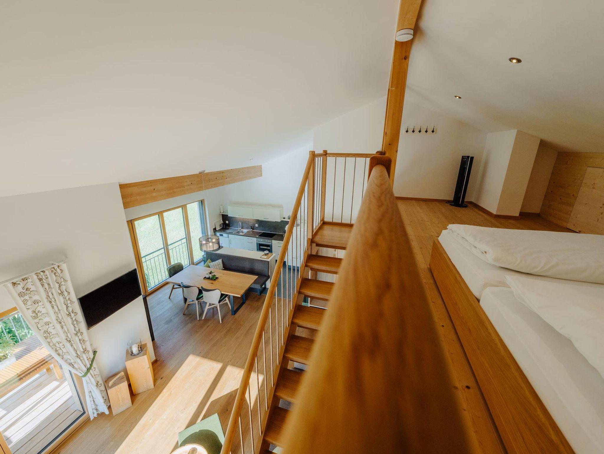 Einzigartige Wohlfühlmomente mit fantastischem Ausblick. Diese Wohnung liegt im Obergeschoss und besticht mit einem großen Balkon und einer Galerie. Das offene Obergeschoss mit seiner integrierten Galerie schafft Offenheit und Leichtigkeit für 6 Personen. Der Balkon hat 28m² und ist ein echter Outdoor Experte.