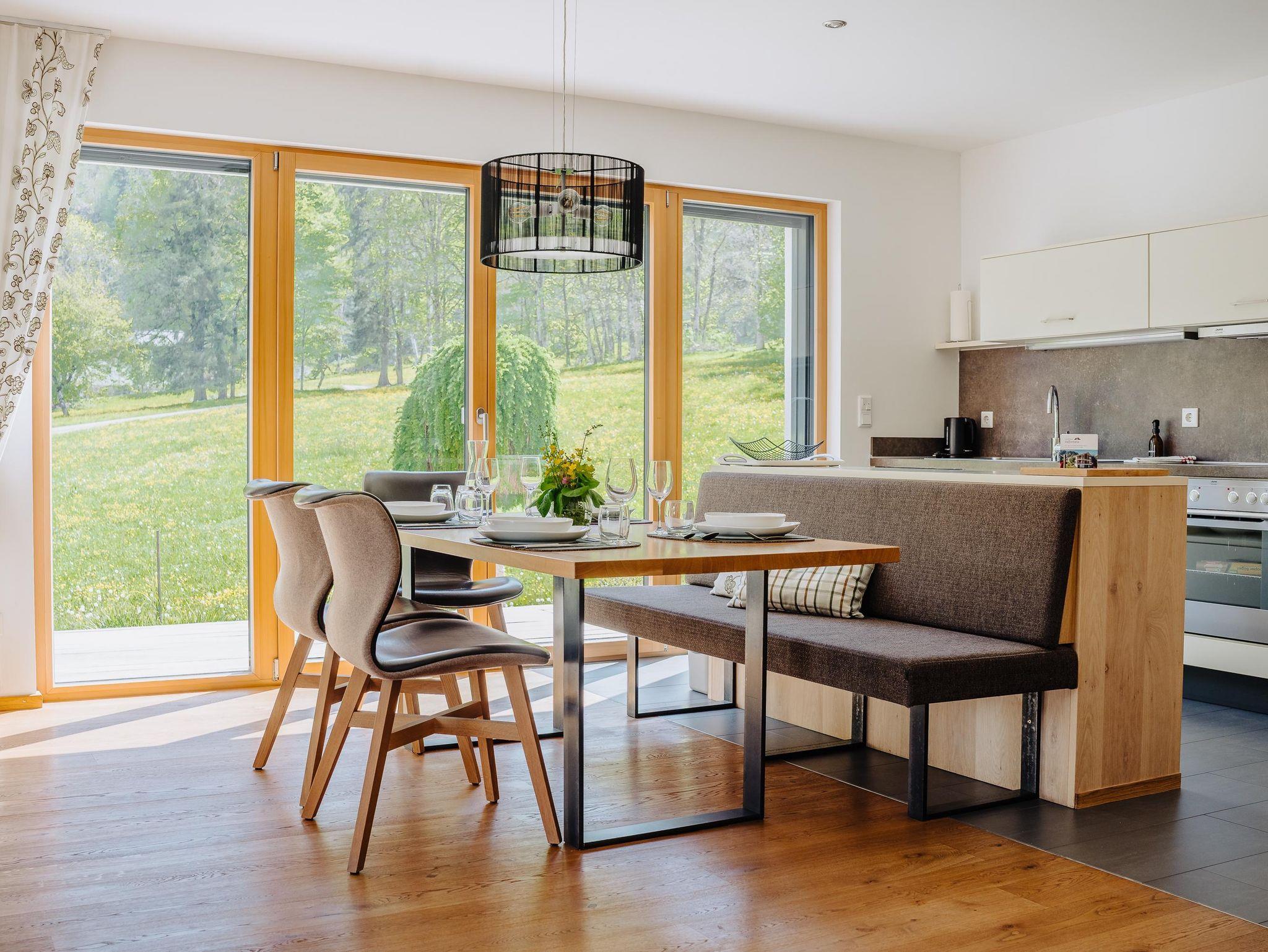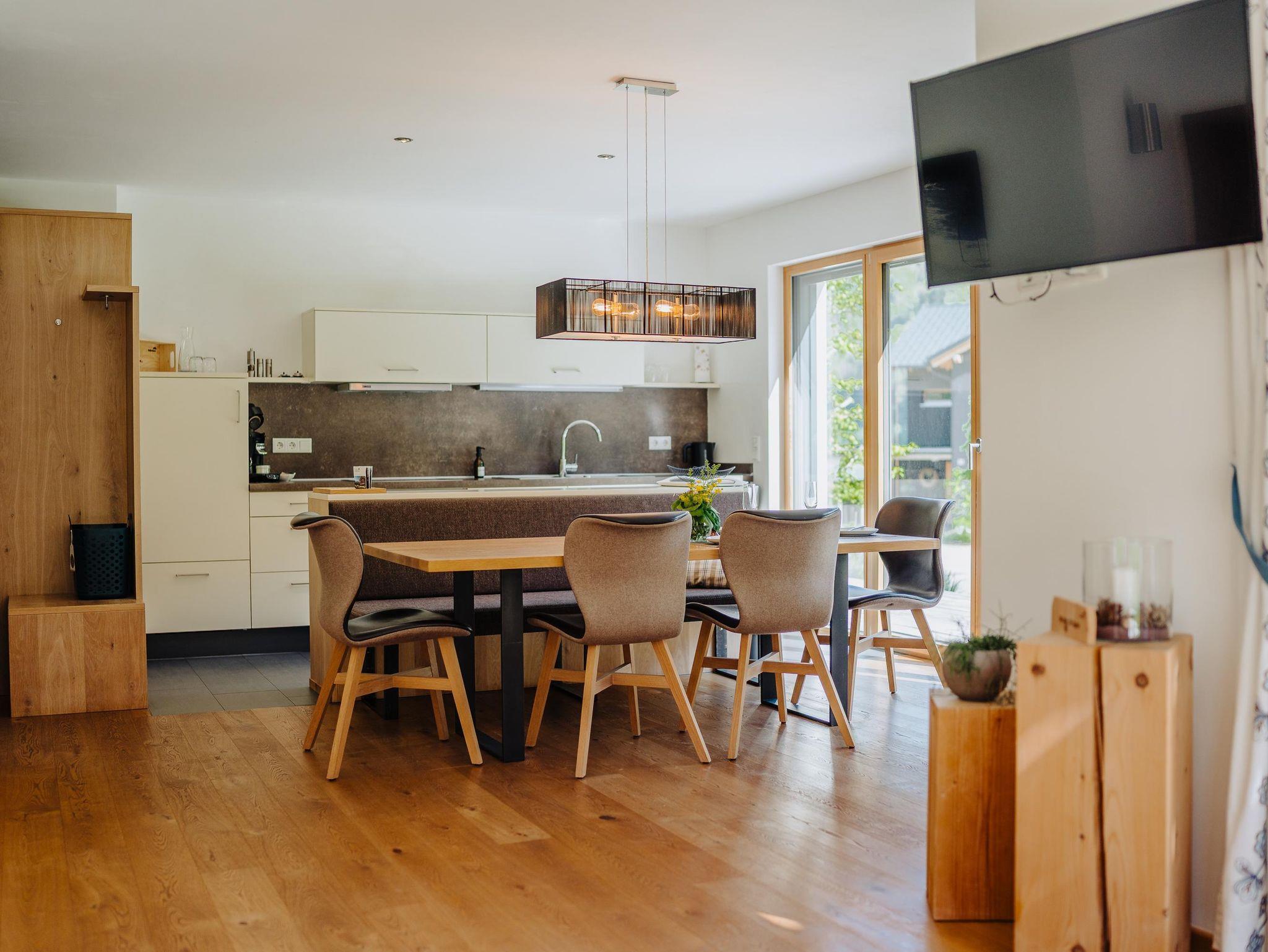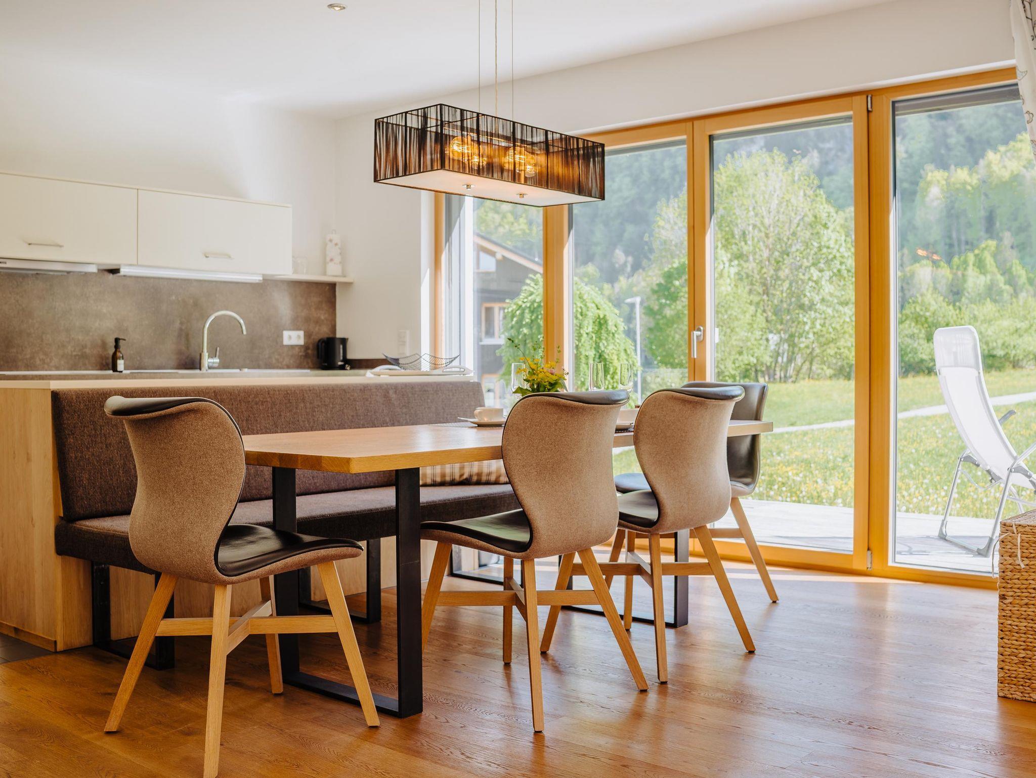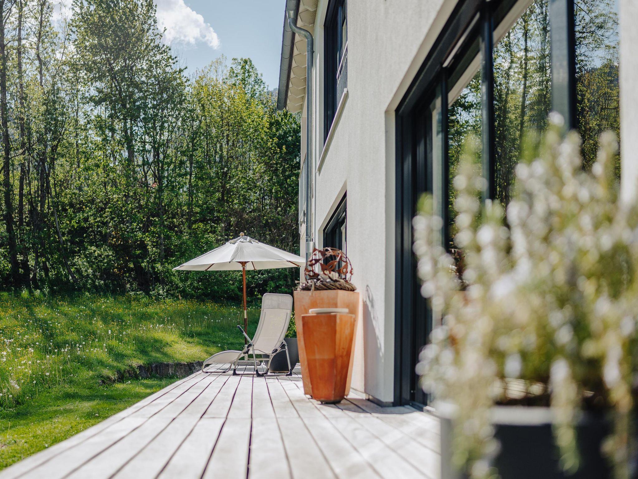Eine optimale Raumeinteilung mit ineinanderfließenden Räumen und zwei Bädern ermöglichen entspanntes Wohnen für 4-6 Personen. Gegen Westen gelegene Schlafzimmer garantieren Ihnen einen ruhigen, gesunden Schlaf. Genügend Platz zum Entspannen und Verweilen bietet auch die Gartenterrasse mit 41 m². Hier sitzen Sie in erster Reihe zur Bergkulisse.