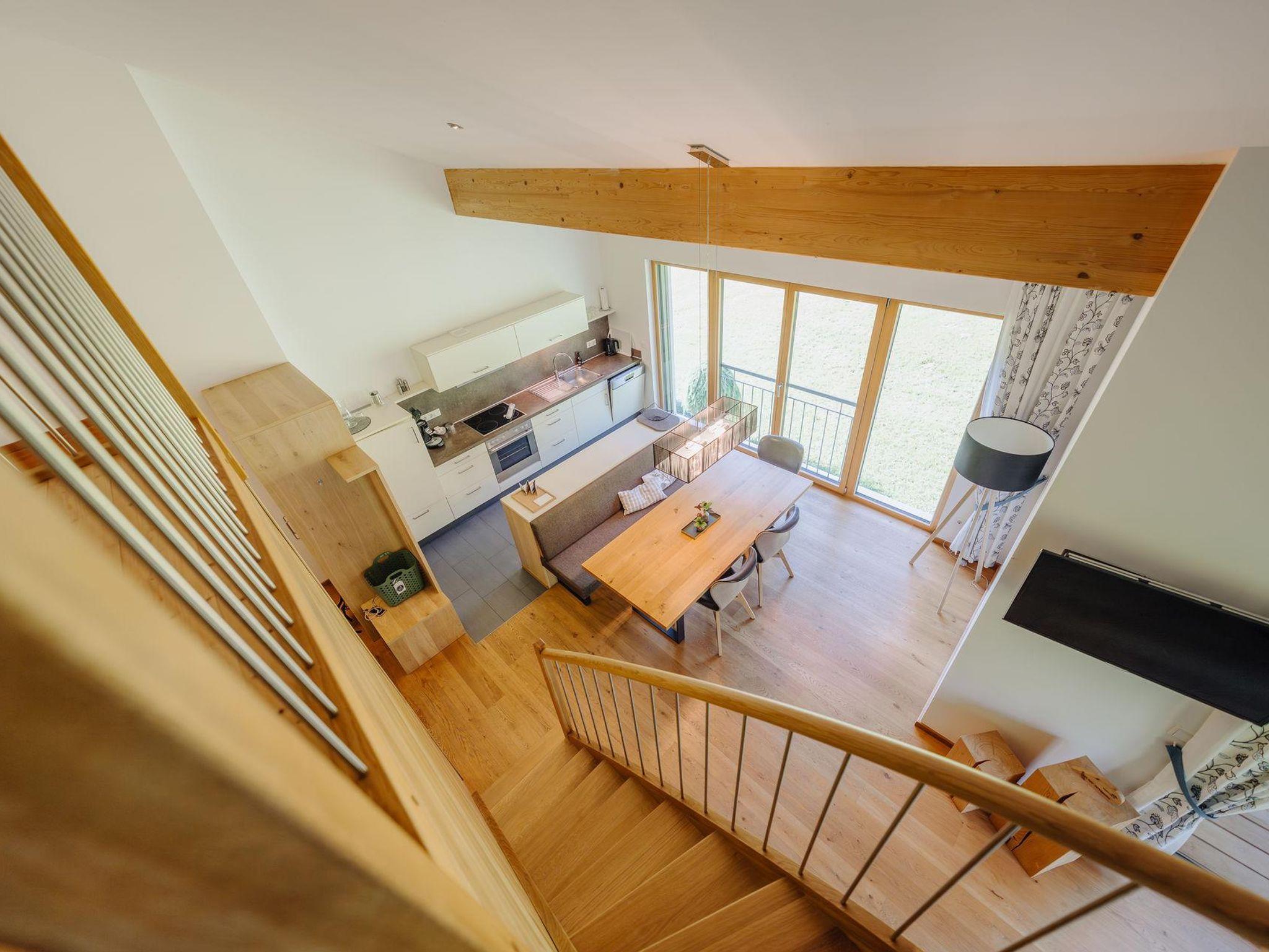 Gemeinsames Kochen und Verweilen, aber auch genügend Privatsphäre zum Zurückziehen wurden bei der Planung bedacht. Erleben Sie einen zauberhaften Ausblick auf die vor Ihnen liegende Alpenlandschaft auf dem 28m² großen Balkon.