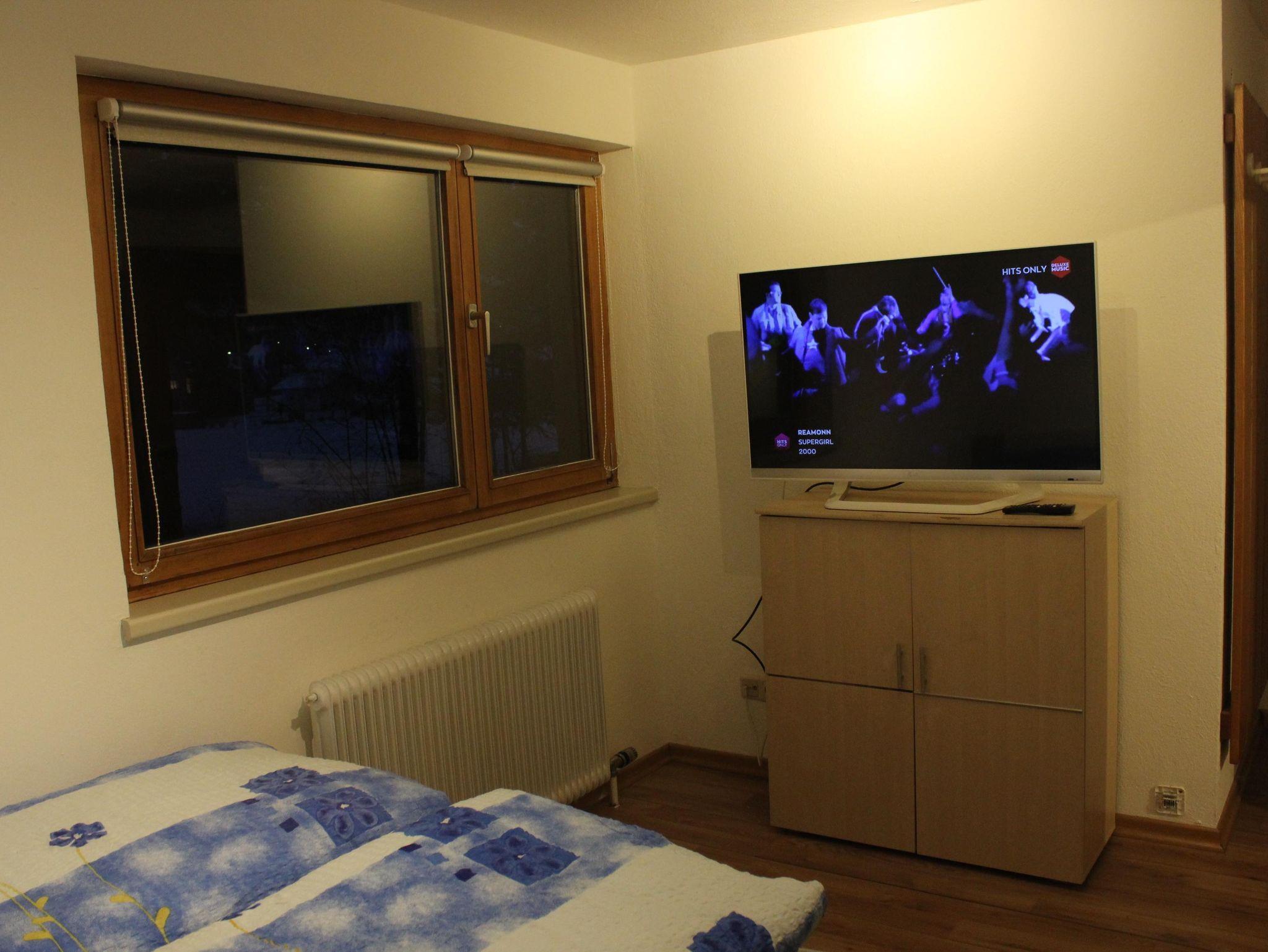 im Schlafzimmer befindet sich ein Französisches Bett, eine Couch zum Ausziehen für 1 weitere Person, kleiderkasten, fernsehkasten, Fernseher.