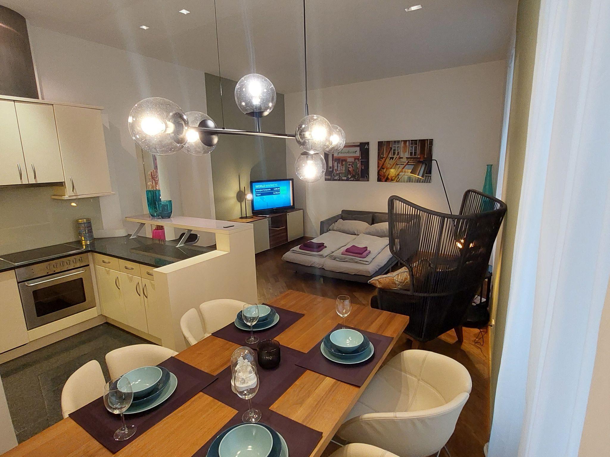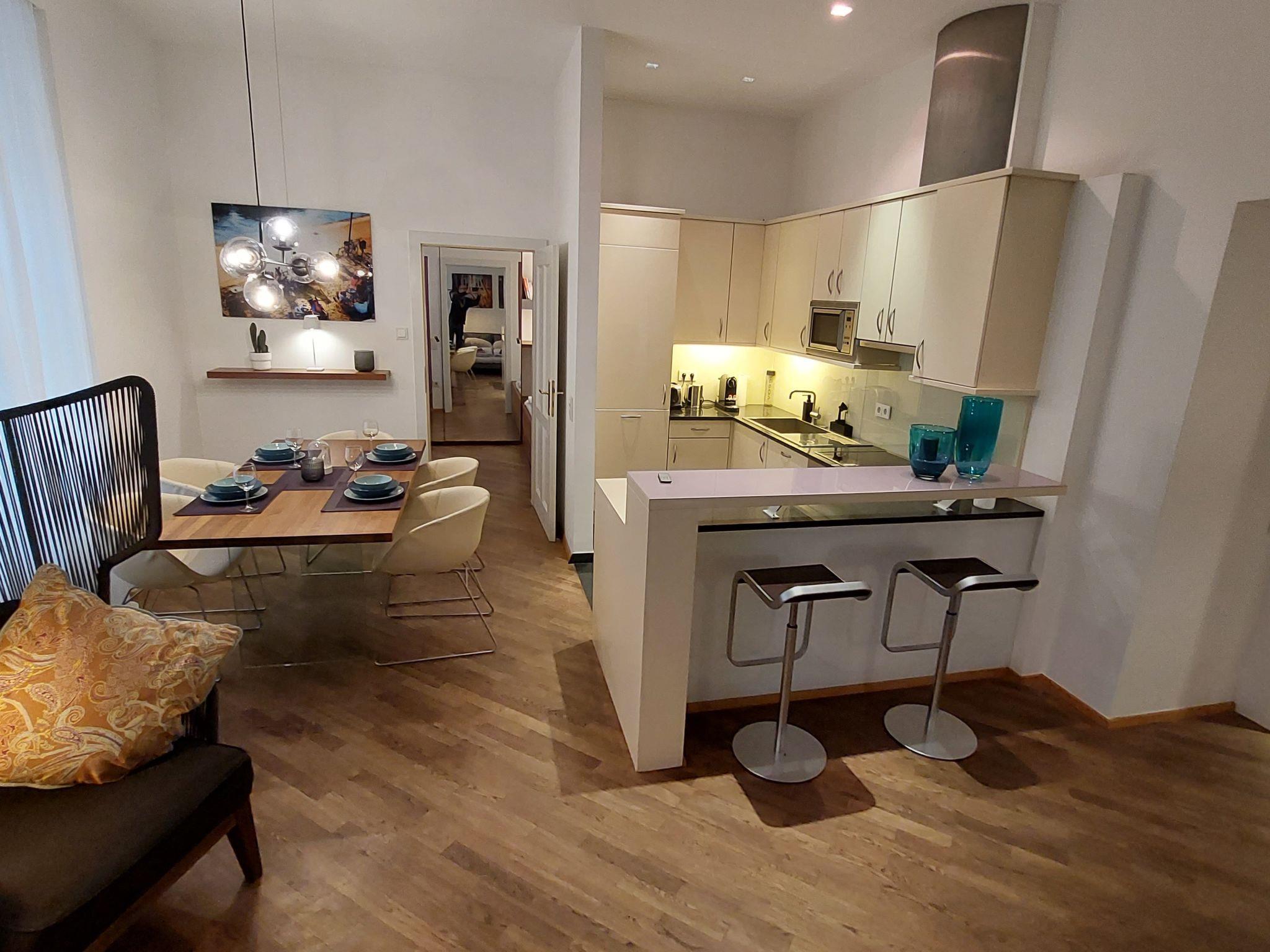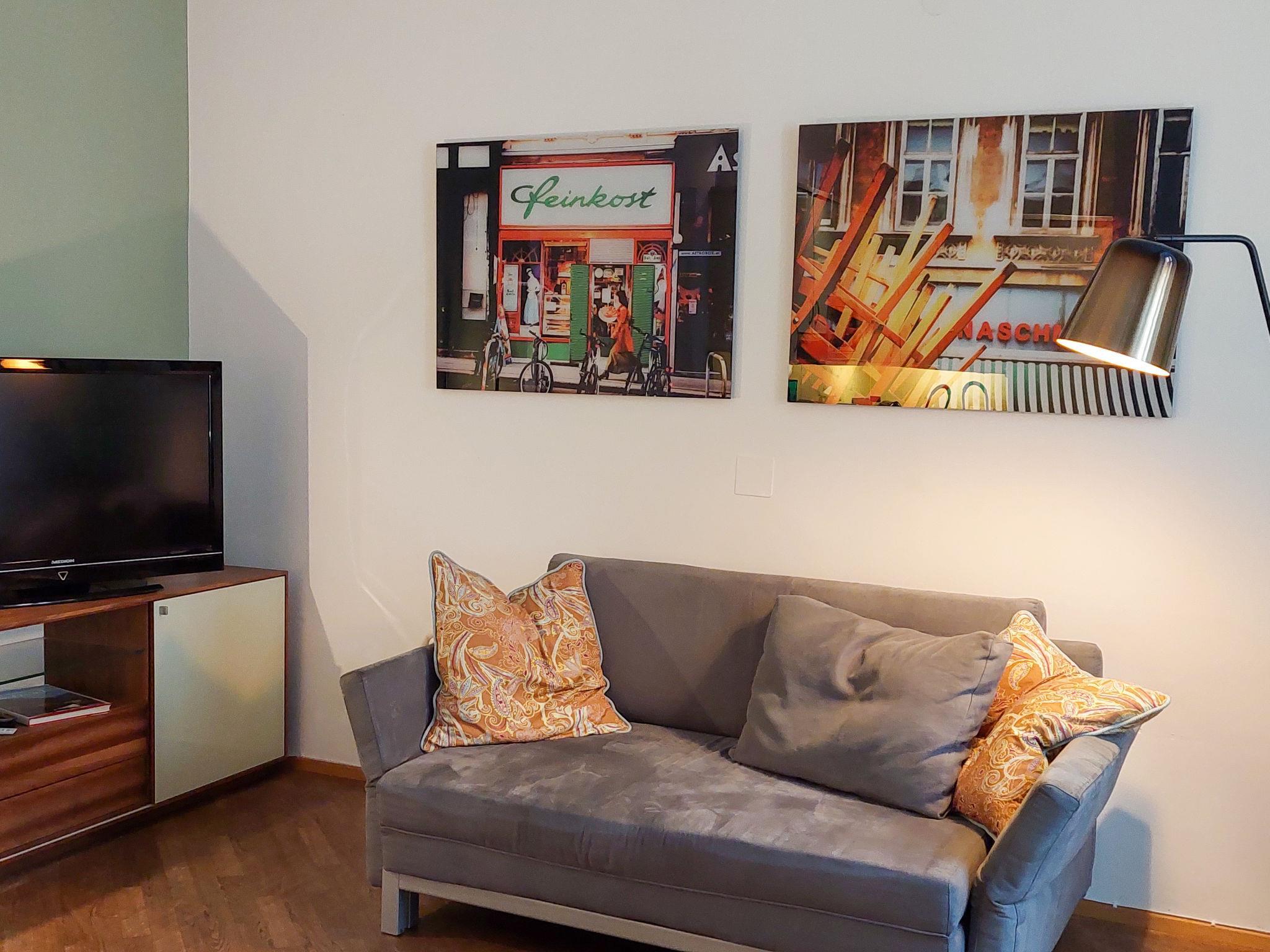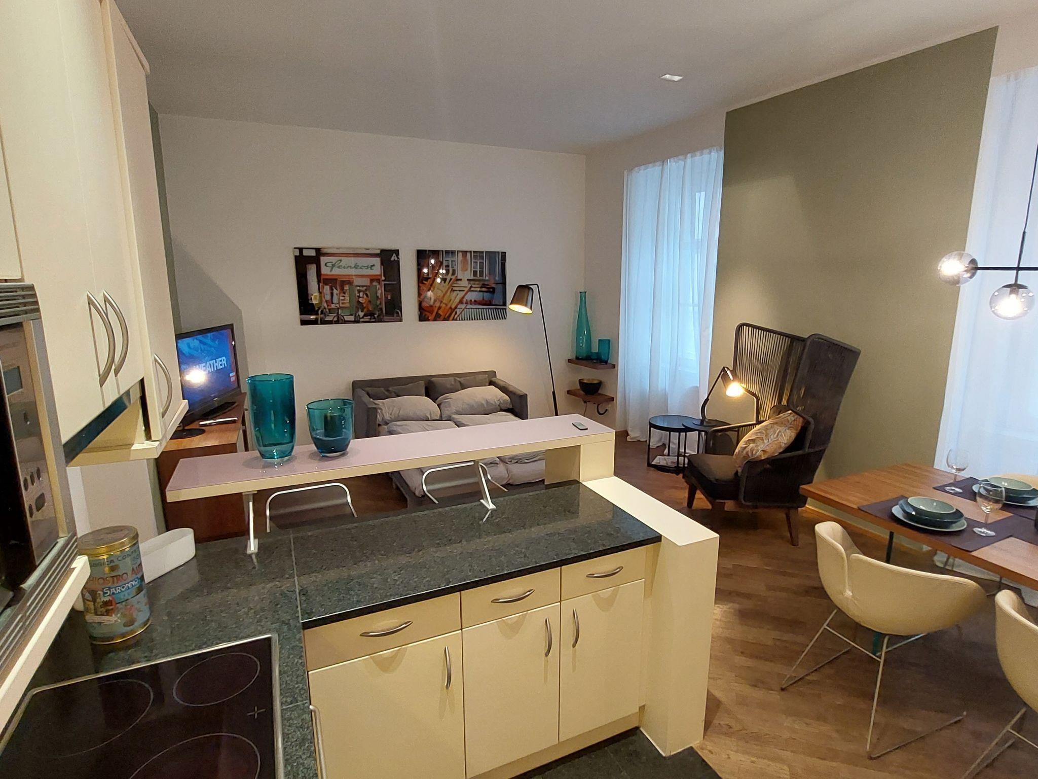 2-room apartment 70 m2 on 3rd floor. Very modern and stylish furnishings: entrance hall. Living/dining room with 1 pull-out bed (2 pers. 2 x 80 cm, length 200 cm), dining table and flat screen. 1 double bedroom with fan. Open kitchen (oven, dishwasher, 4 ceramic glass hob hotplates, toaster, kettle, microwave, freezer, electric coffee machine, Capsules for coffee machine (Nespresso)) with small bar. Shower/WC. Parquet floors. Facilities: washing machine, iron, hair dryer. Internet (WiFi, free). Please note: non-smokers only. Check-in: 4:00 p.m. to 8:00 p.m. (later arrival is possible for an additional fee). Check out: until 10.00 a.m.