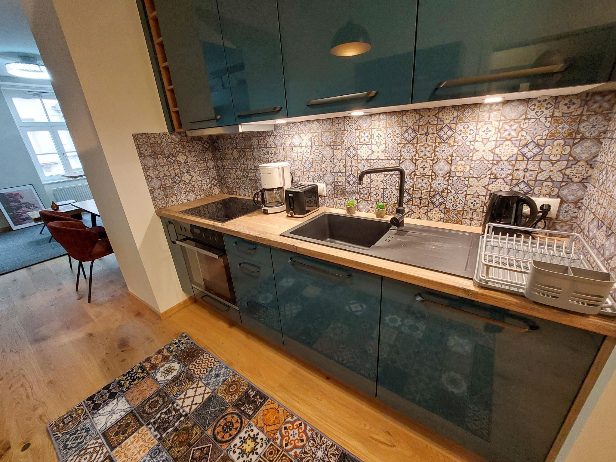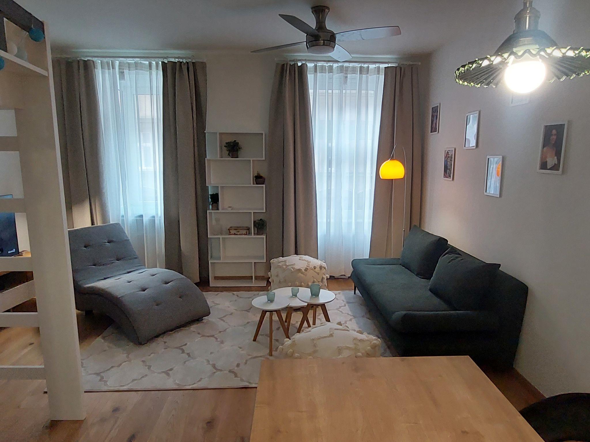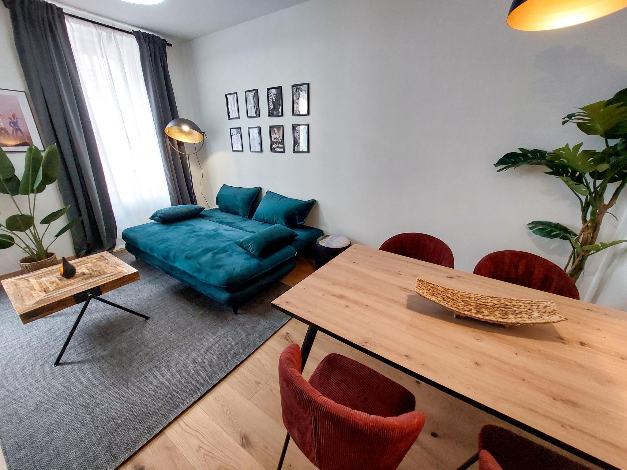 "Premium Apartment Maria Hilf 1+2 Double", 2-room apartment 84 m2 on 2nd floor. Object suitable for 8 adults. Spacious and bright, fully renovated in 2023, very modern and tasteful furnishings: entrance hall. Open living/sleeping room with 1 x 1 bunk beds (180 cm, length 190 cm), 1 pull-out bed (2 pers.), cable TV and international TV channels (flat screen), radio, CD-player and DVD. Open living/sleeping room with 1 x 1 bunk beds (150 cm, length 200 cm), 1 pull-out bed (2 pers.), cable TV (flat screen), radio, CD-player and fan. Open kitchen in the entrance (8 hot plates, dishwasher, toaster, kettle, electric coffee machine). 2 Baths/showers/WC. Heating. Wooden floors. Facilities: washing machine, iron, baby cot, hair dryer. Internet (WiFi, free). Please note: suitable for families apartment street side. Non-smokers only. Attention: these are 2 separate apartments for 4 people each, located next to each other. Highspeed-Internet.