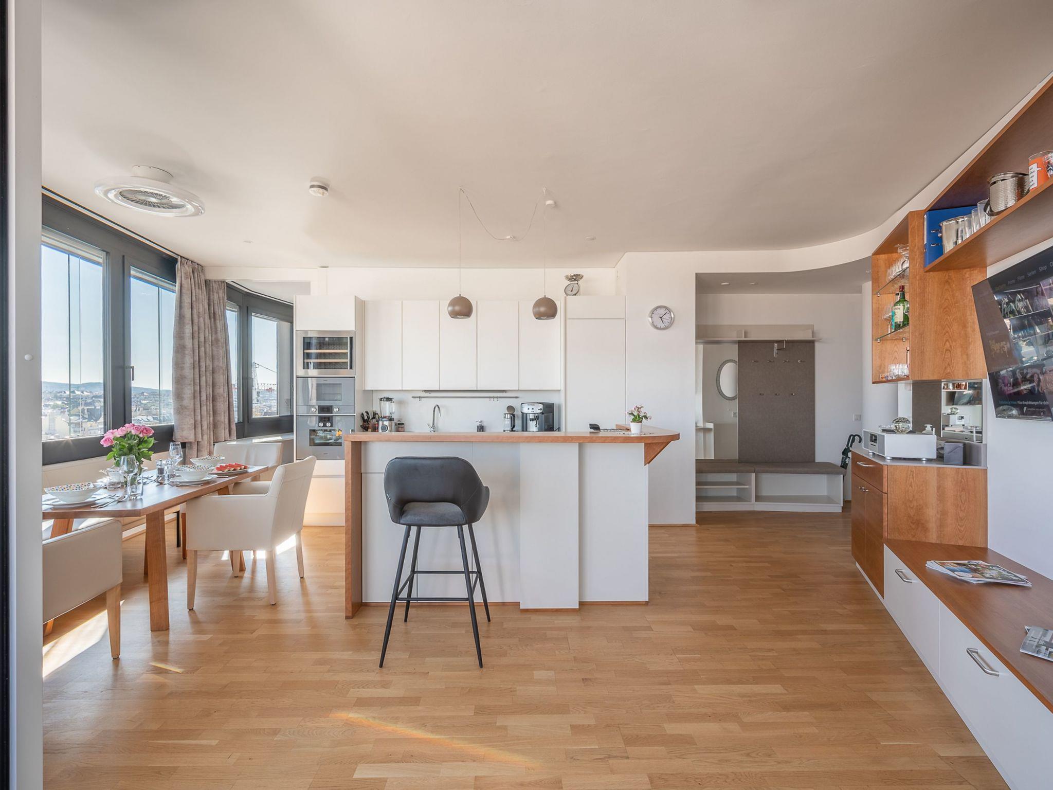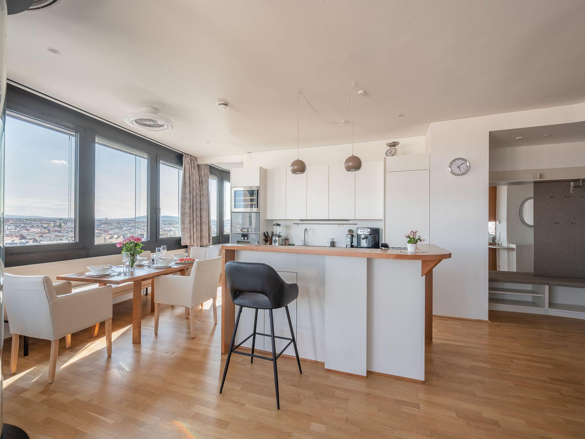 Outside, you not only have a breathtaking view of Vienna from the 9th floor, 40 metres above city level, but also a private car parking space. From here, all of Vienna's landmarks - from St Stephen's Cathedral to Wilhelminenberg Palace - are within sight. The flat is therefore probably the best starting point for exploring Vienna's countless sights.