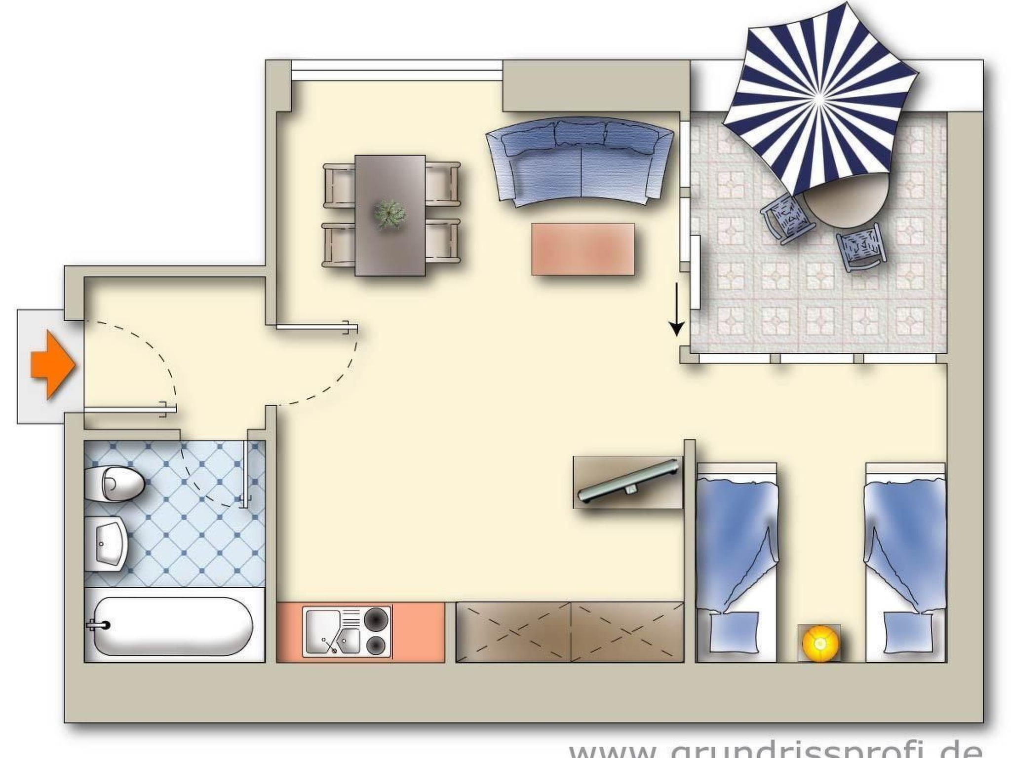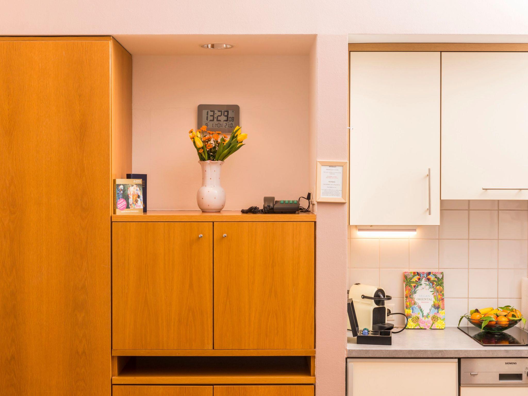 Inside, you will find a carefully designed living ambience with everything you need for a pleasant stay. The flat has a cosy bedroom, which can be furnished with a double bed or two single beds as required, thus offering flexible sleeping options. In addition, the living room with its fully equipped kitchen and dining area invites you to linger. Practical household appliances such as a dishwasher, a filter coffee machine and a capsule coffee machine are at your disposal, and additional comfort is provided by partial air conditioning. A washing machine for communal use in the building emphasises the convenience of this flat.