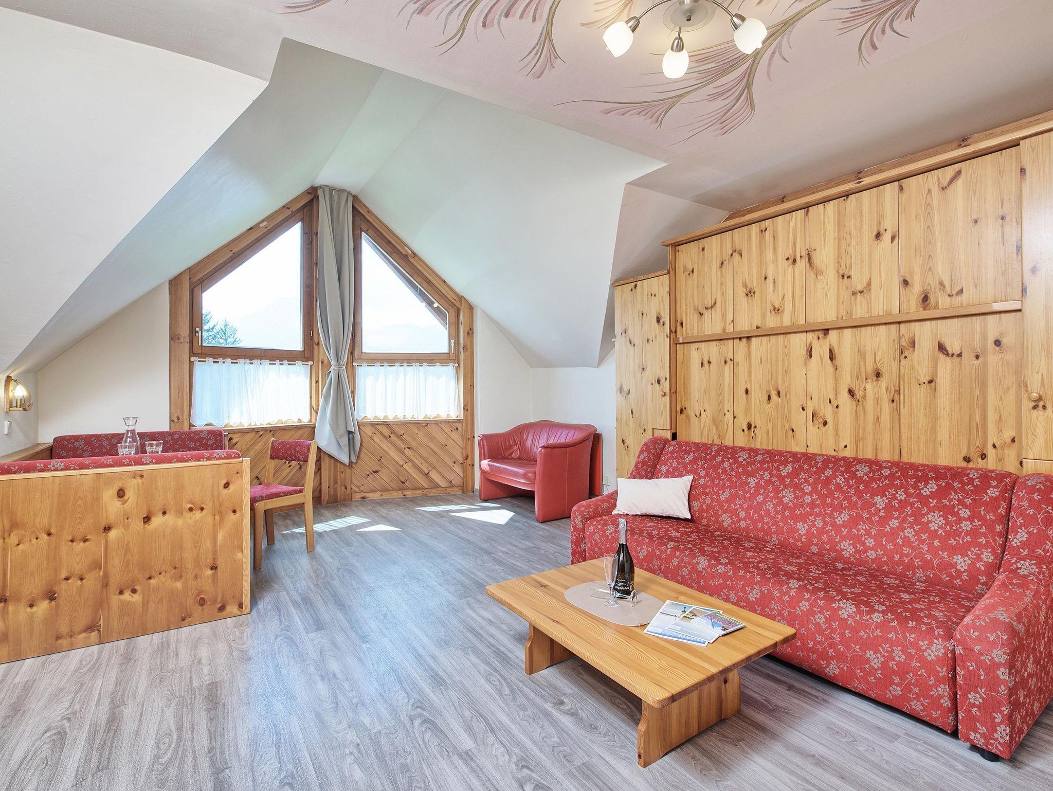Das Appartement teil sich in einen Wohnbereich mit umklappbarem Schrankbett (Doppelbett), Sitzecke und TV, und zwei separaten Schlafzimmern (1x Doppelbett mit Zugang Balkon, 1x zwei getrennte Betten). Das Badezimmer hat zwei Waschbecken und Dusche, WC ist getrennt. In der Kochnische findet sich Geschirr für maximal 7 Personen. Der Balkon hat eine östliche Ausrichtung mit Blick auf die Karawanken,