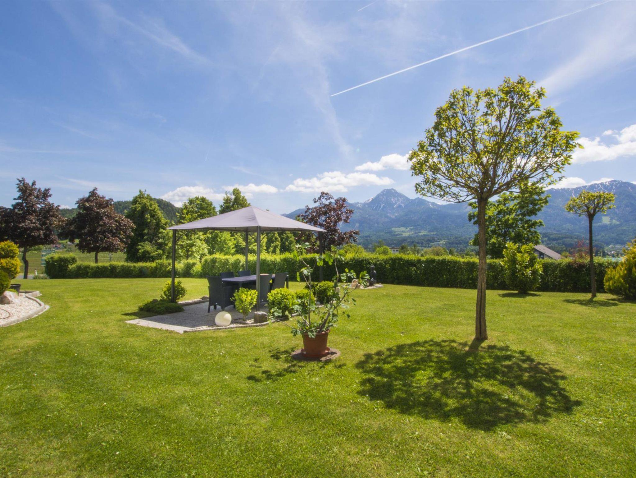 Unser Haus liegt auf einer Erhebung mit einem wunderschönen Rundblick. Südseitig mit Blick auf den Faaker See (ca. 8 Gehminuten) und die Karawanken.