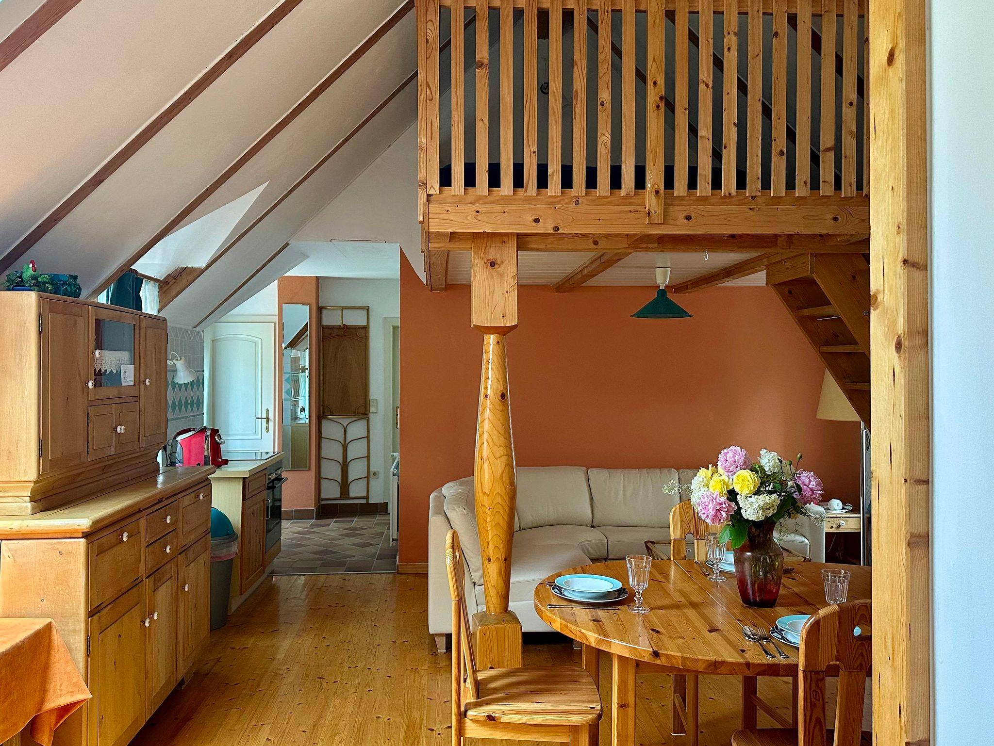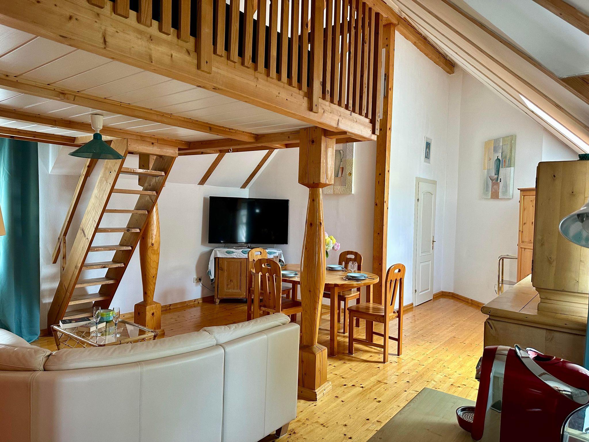Zur Auswahl stehen zwei Apartments: Eines im Obergeschoß unseres direkt angrenzenden Nebengebäudes und eines im Obergeschoß des Haupthauses. Eine Wohnung erstreckt sich auf über 100 Quadratmeter und bietet Platz für bis zu 8 Personen, ideal für große Familien. Die andere, 70 Quadratmeter große Wohnung im Nebenhaus eignet sich perfekt für eine Familie mit bis zu 4 Personen. Bei Bedarf kann sie zu einer 100 Quadratmeter Ferienwohnung erweitert werden, weil es ein separat zugängliches Zimmer mit extra WC und Dusche auf dem gleichen Stockwerk gibt.