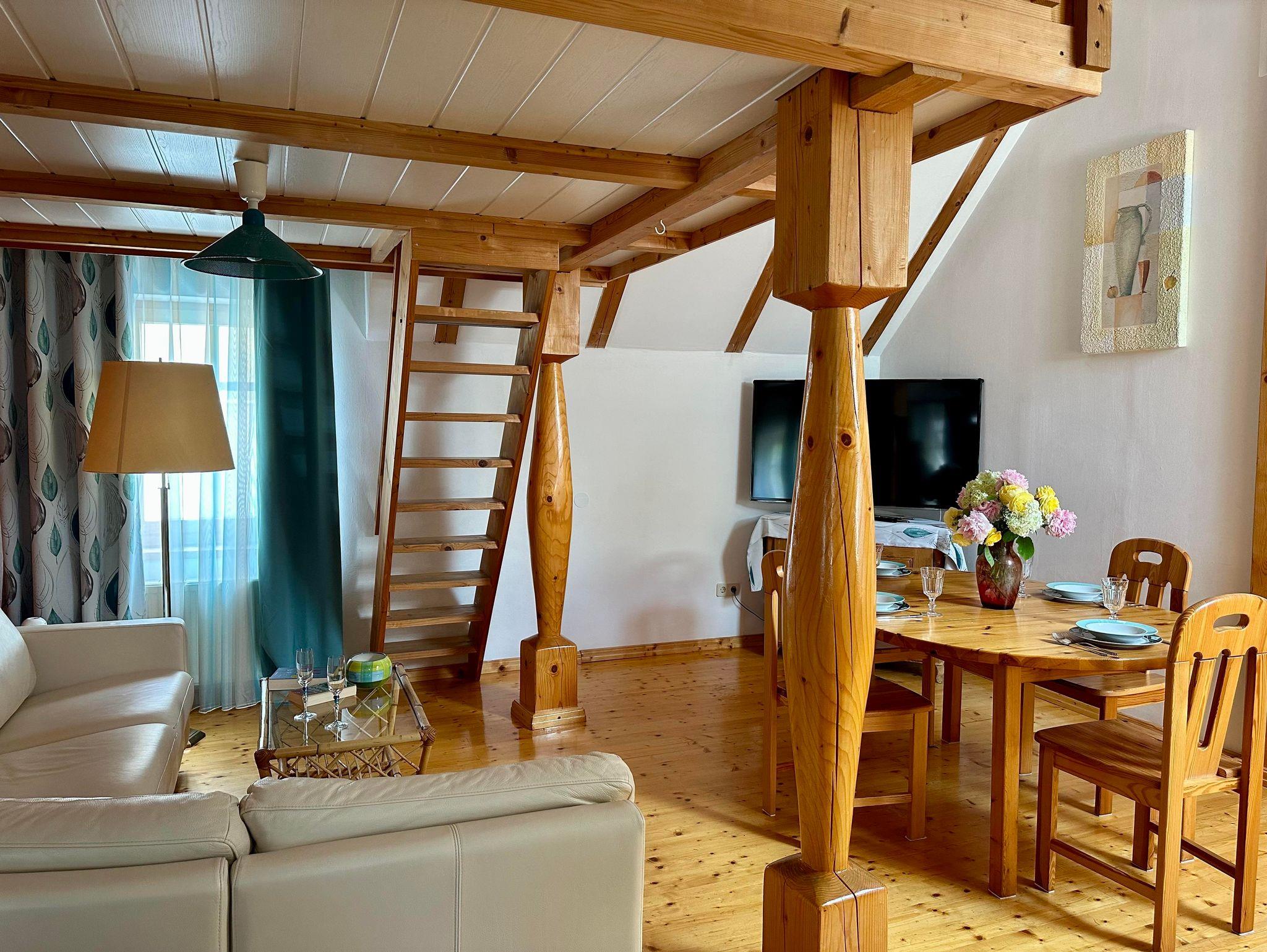 Die Wohnung verfügt neben einem Schlafzimmer mit Doppelbett auch über ein Doppelbett auf einer Galerie.